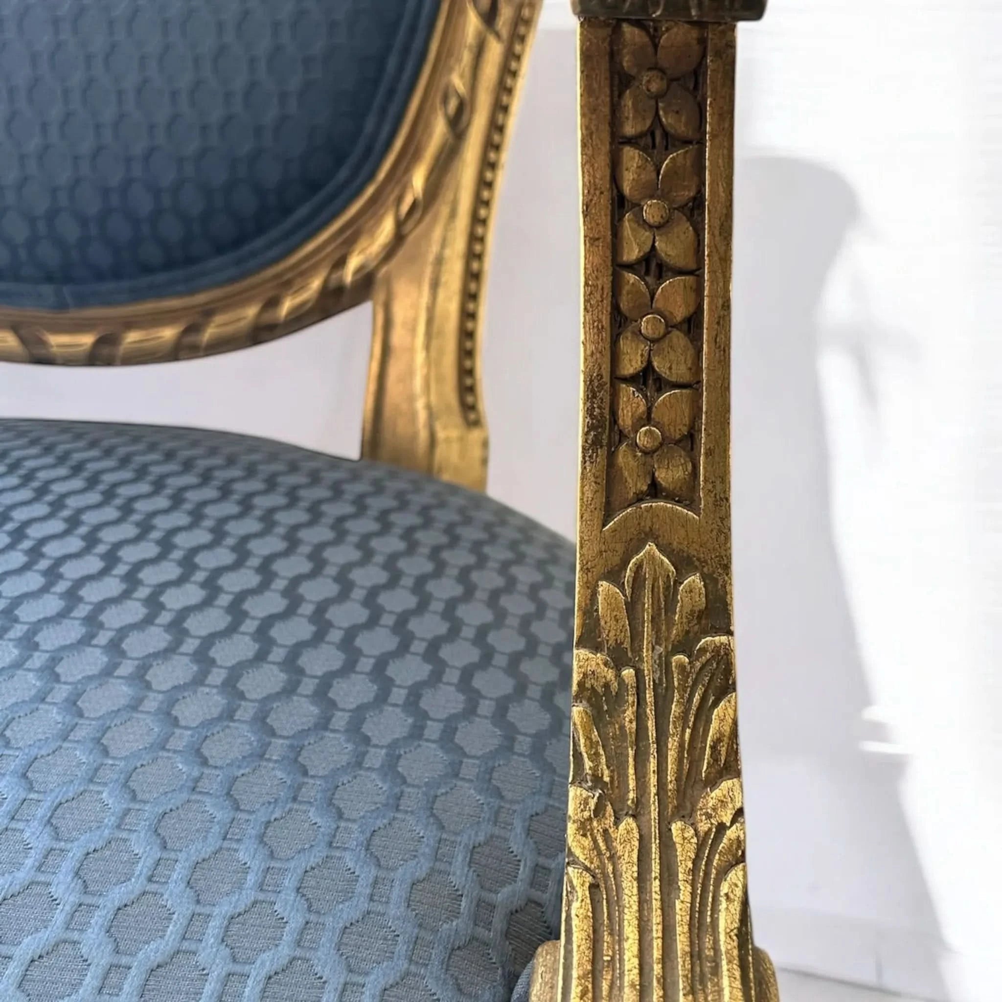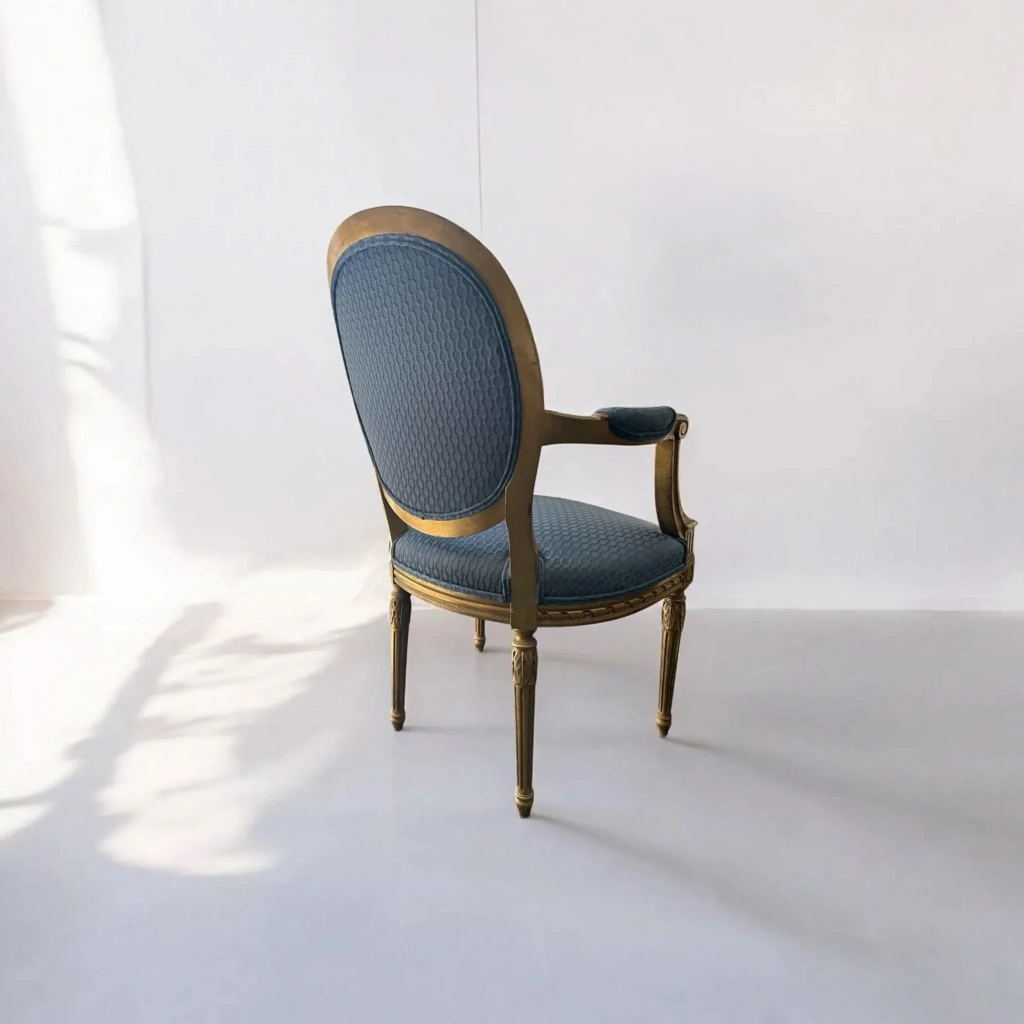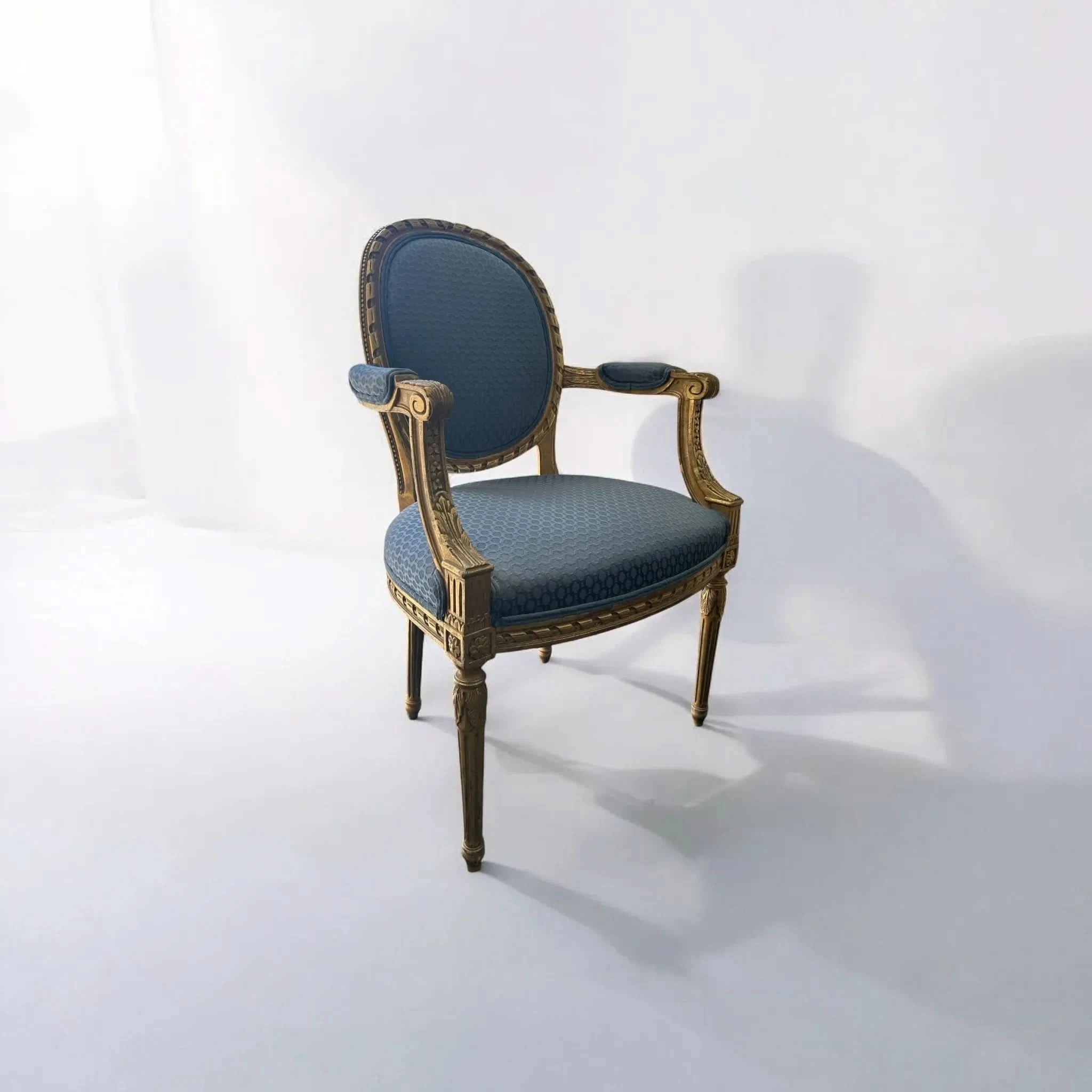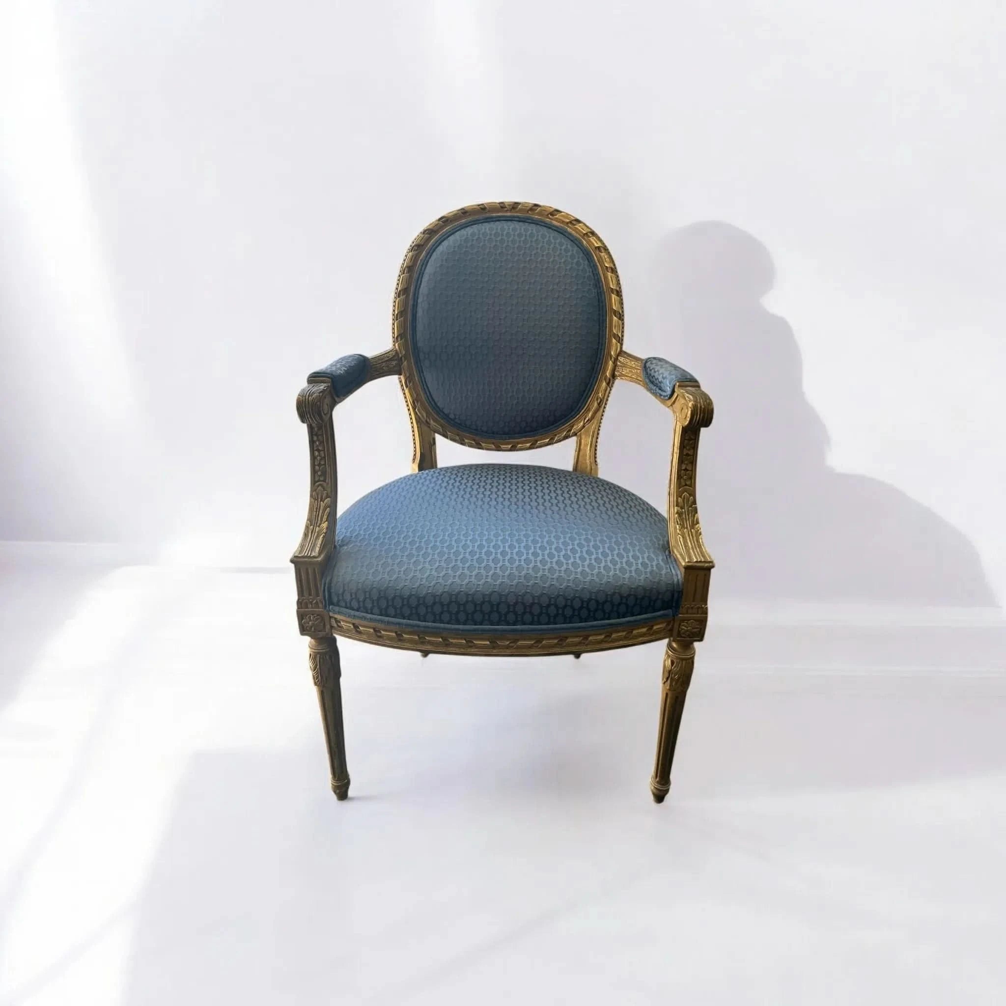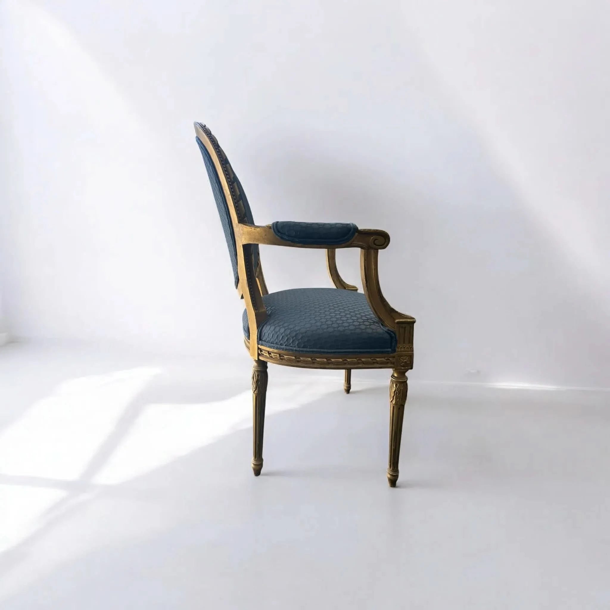 A beautifully aged LXVI-styles salon chair, likely of European origin, retaining its original gold-gilded frame with a rich patina that speaks to its history. Recently reupholstered in Ritz Fabrics’ Lagoon Collection, colour Navy, the deep blue velvet contrasts elegantly with the ornate detailing, highlighting the timeless craftsmanship pf the piece. With no maker’s marks, it’s exact provenance remains a mystery but its charm and character are undeniable. A striking addition to any interior, blending antique elegance with a fresh, modern touch.