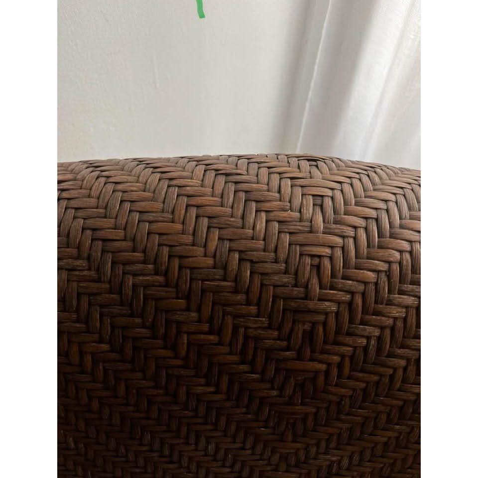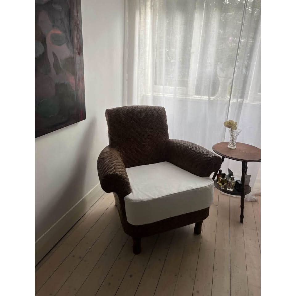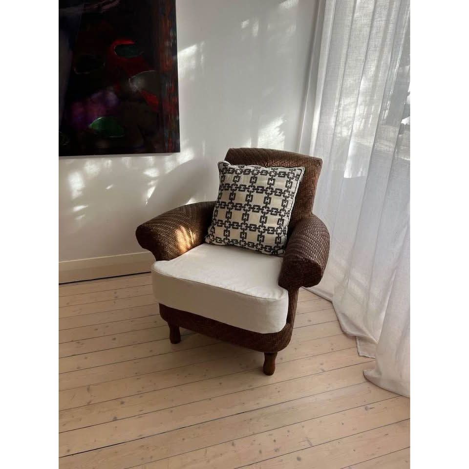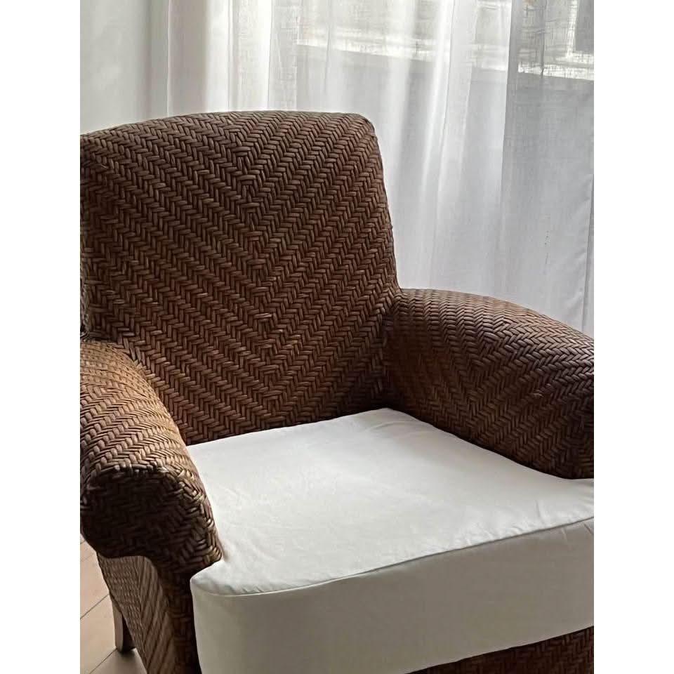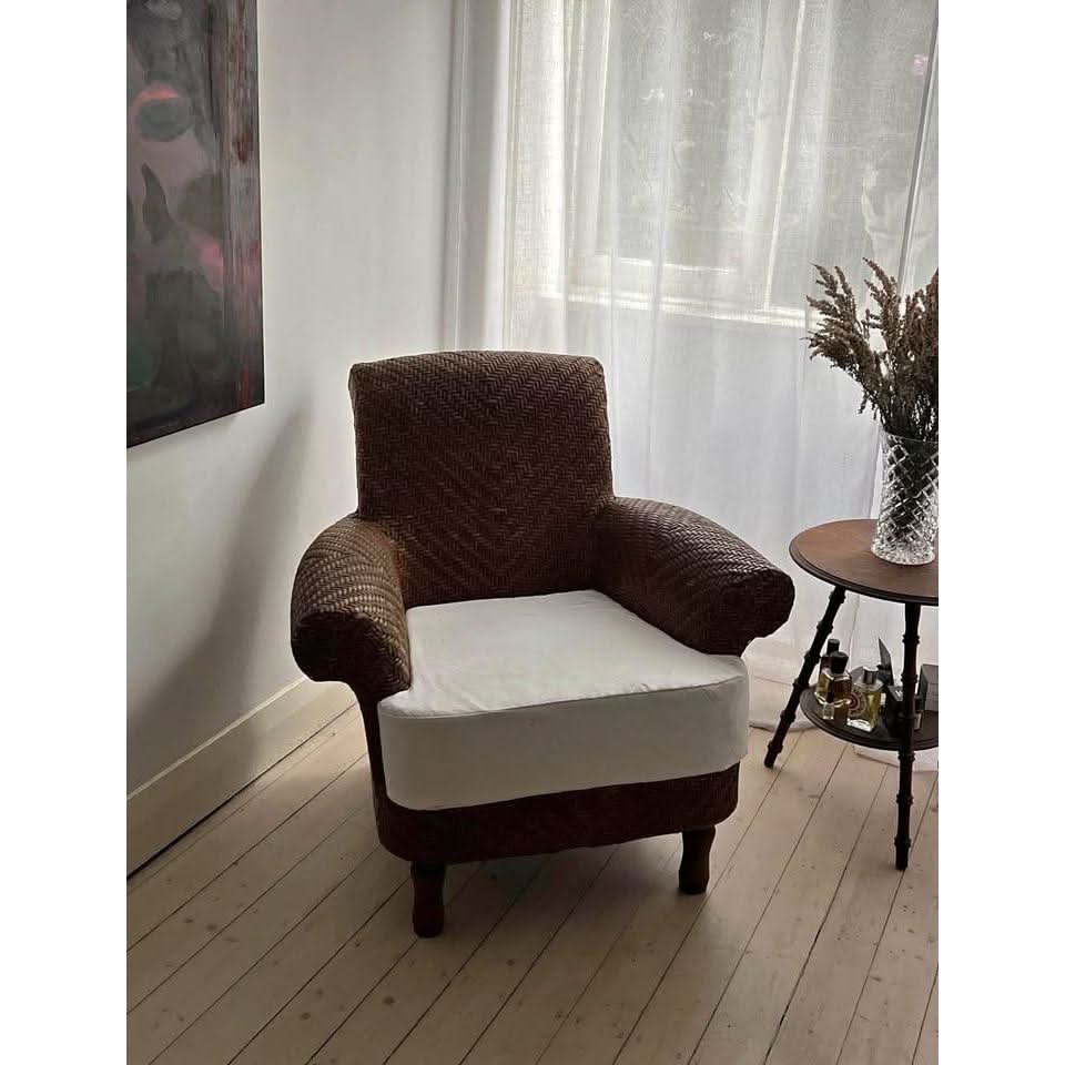 Vintage Italian rattan herringbone weave single seater lounge chair with white linen cushion