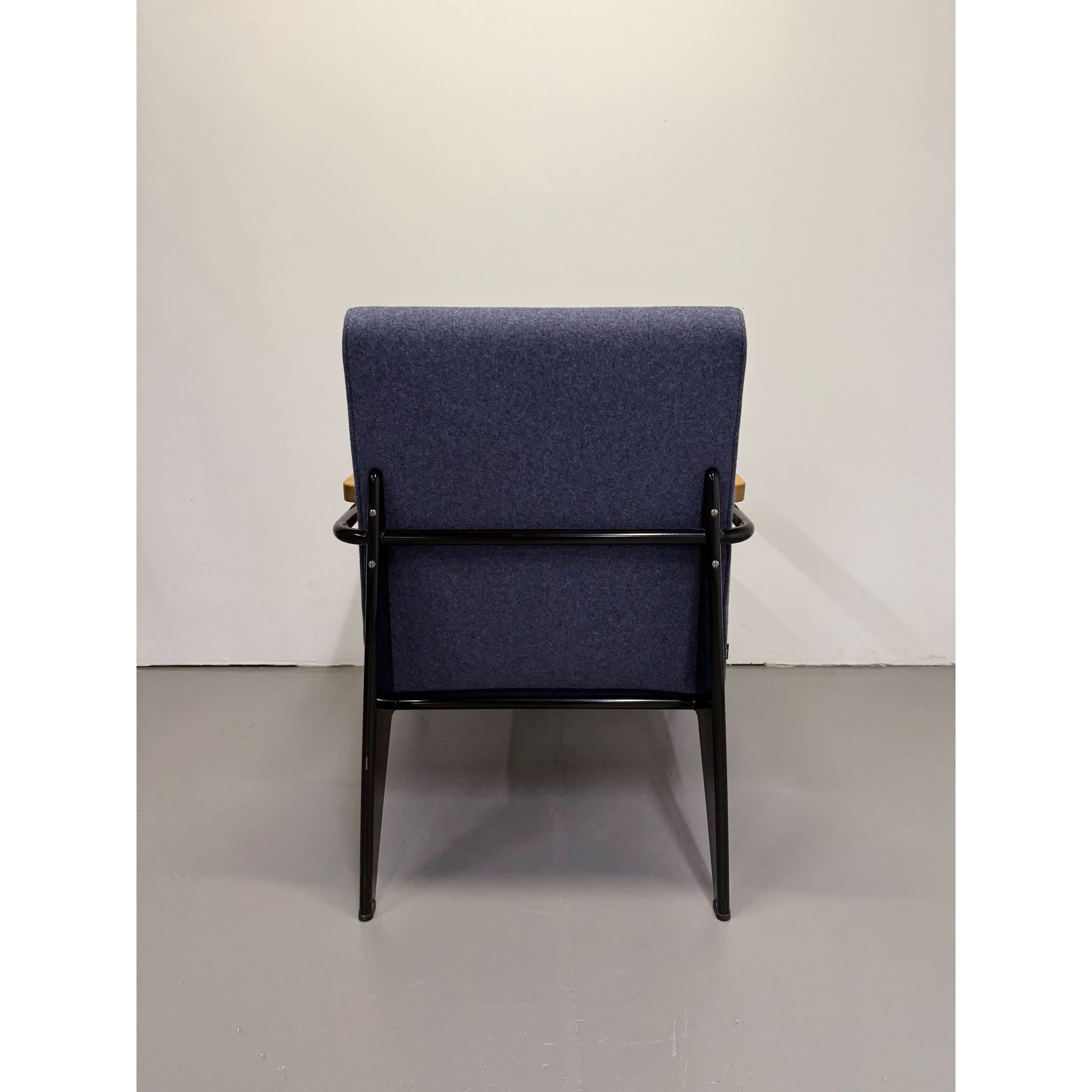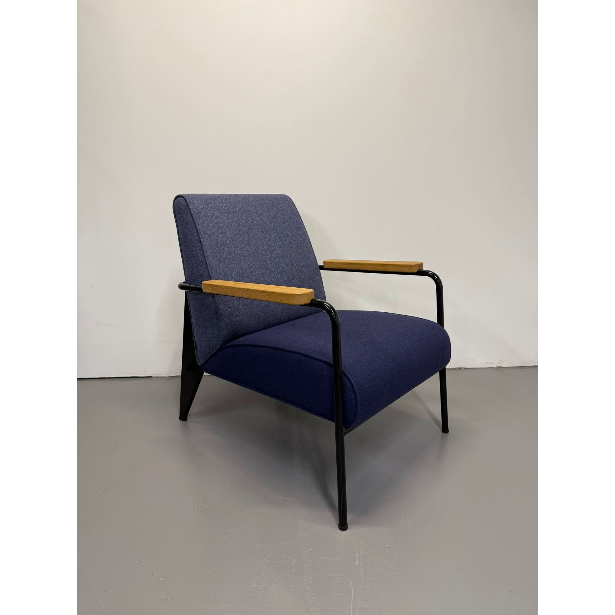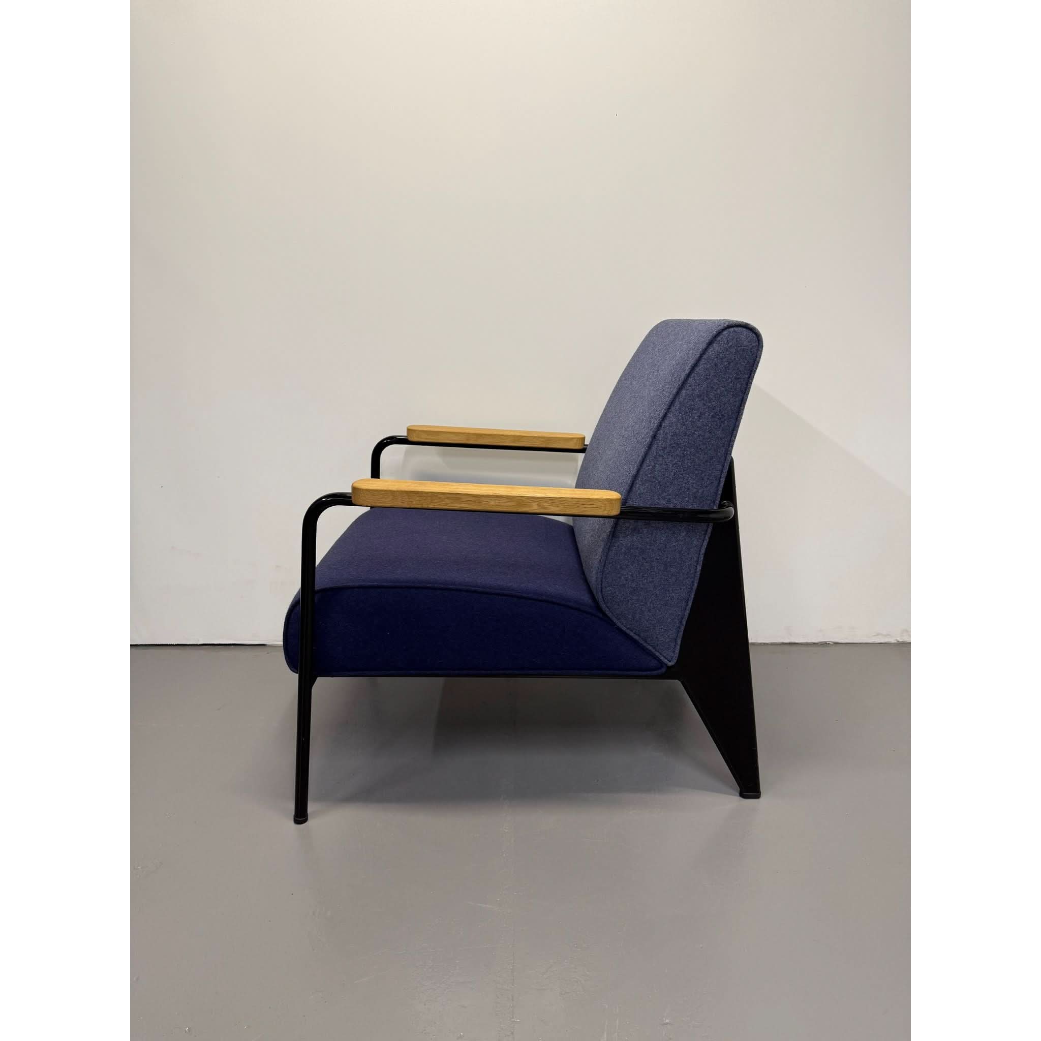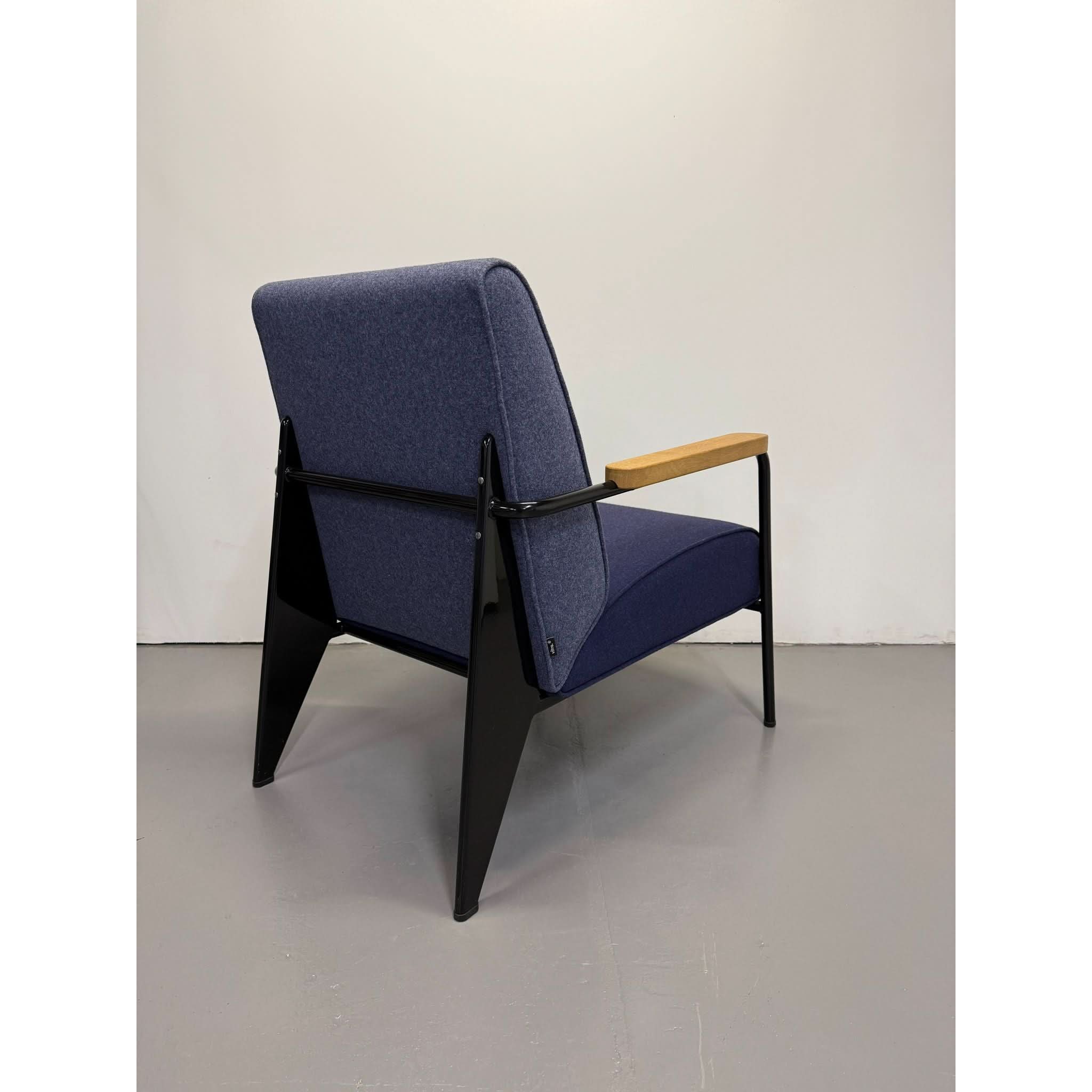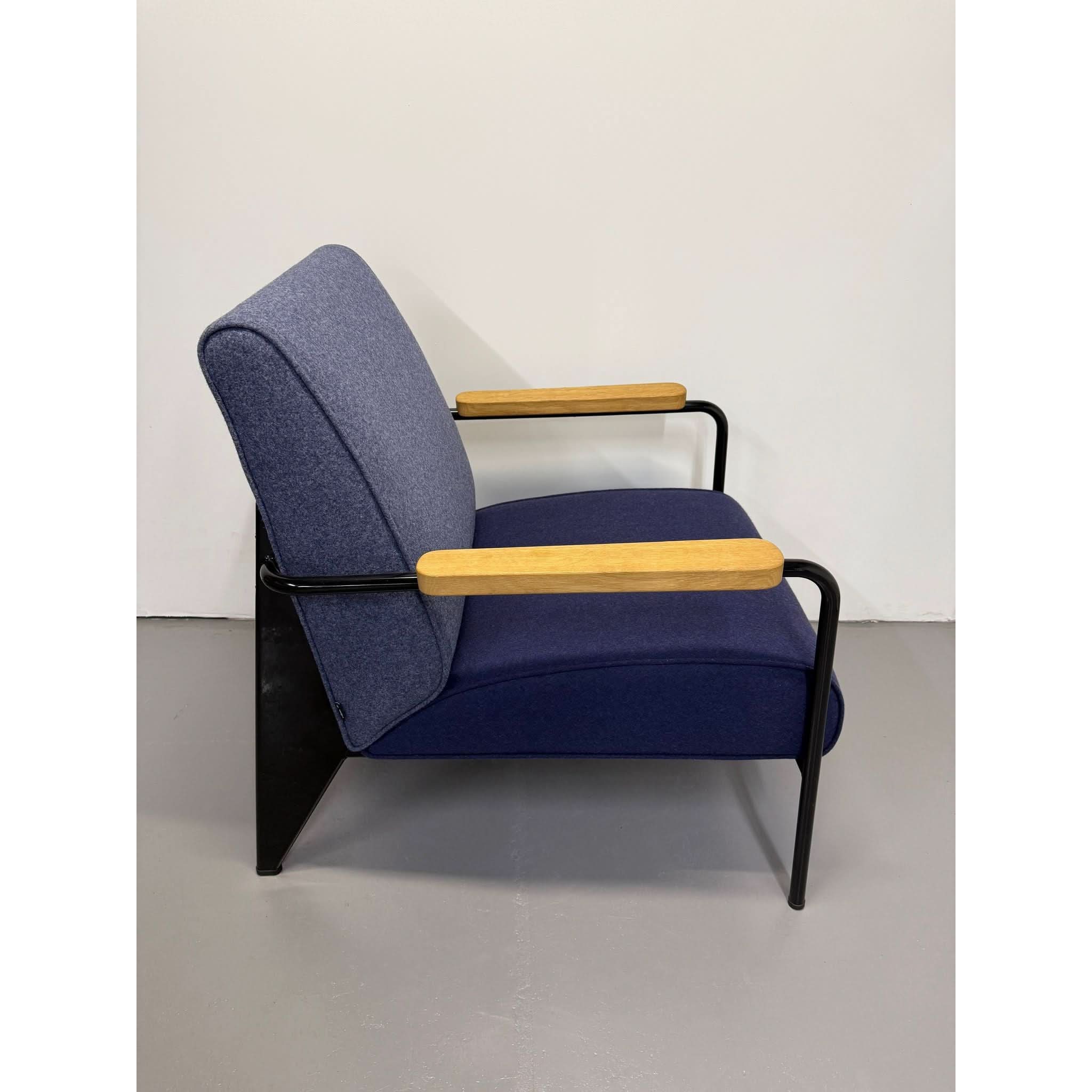 Its powder-coated steel frame evokes architectural strength, while solid oak armrests and structured seat/back cushions add warmth and sophistication. The balance of bold lines and comfortable form reflects Prouvé’s design philosophy: where engineering meets aesthetics.