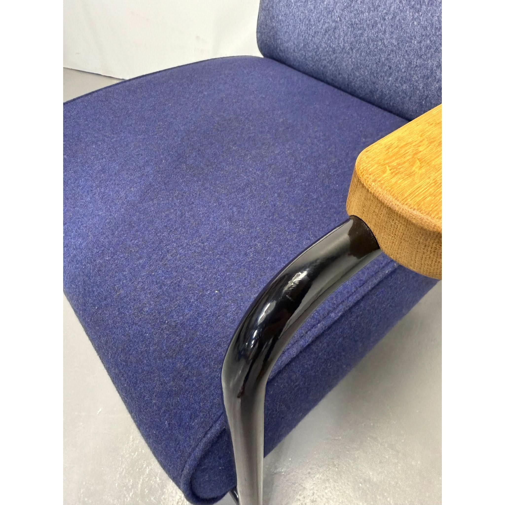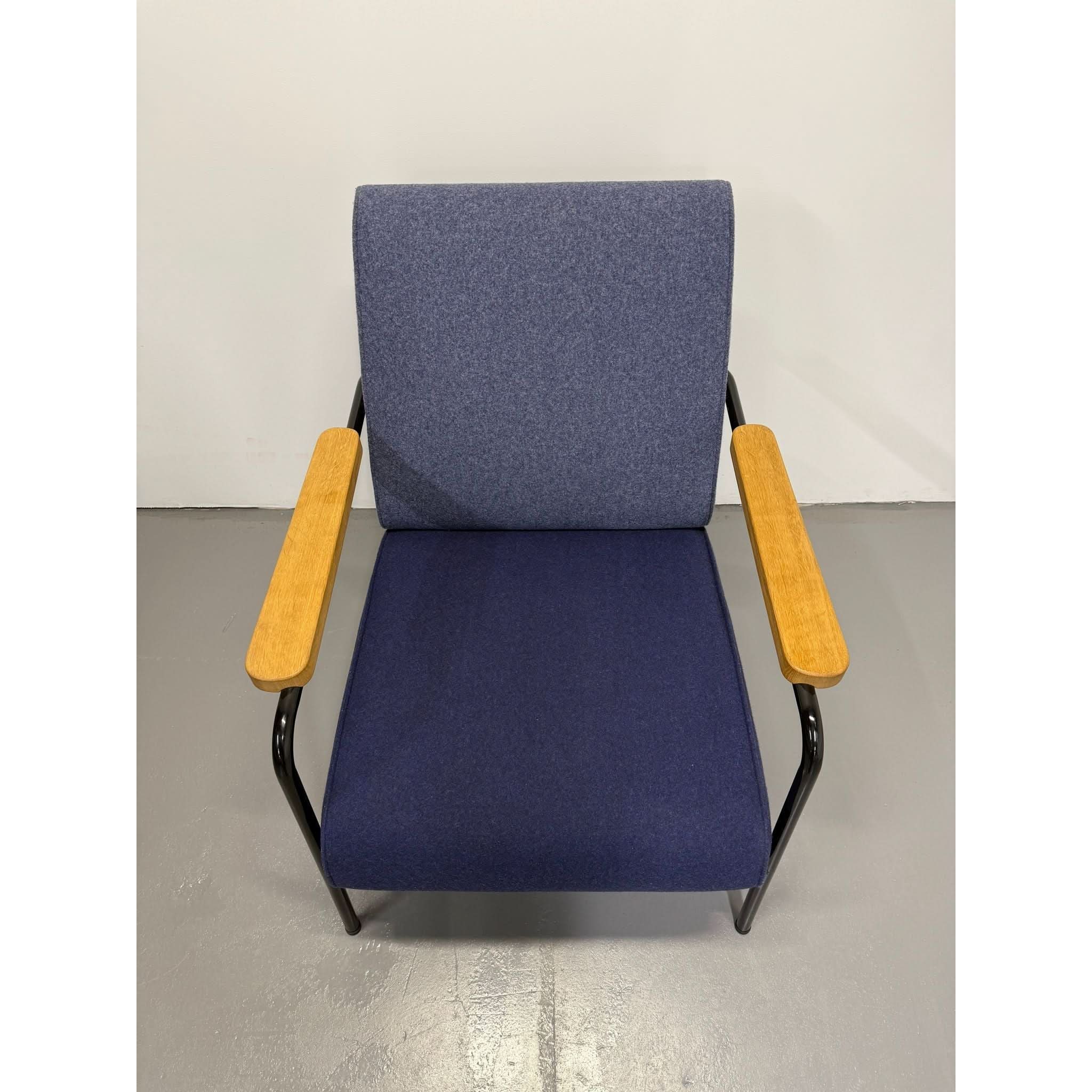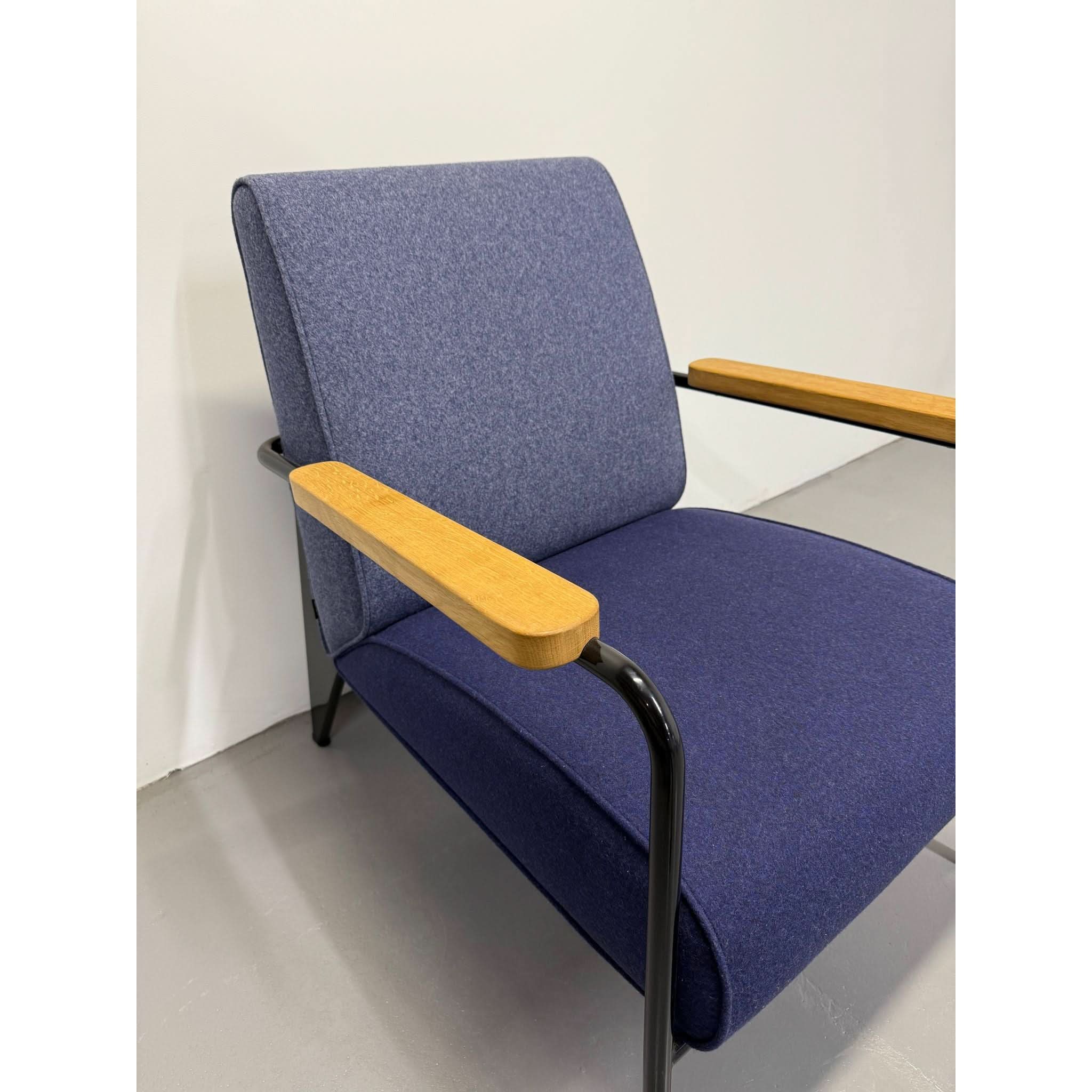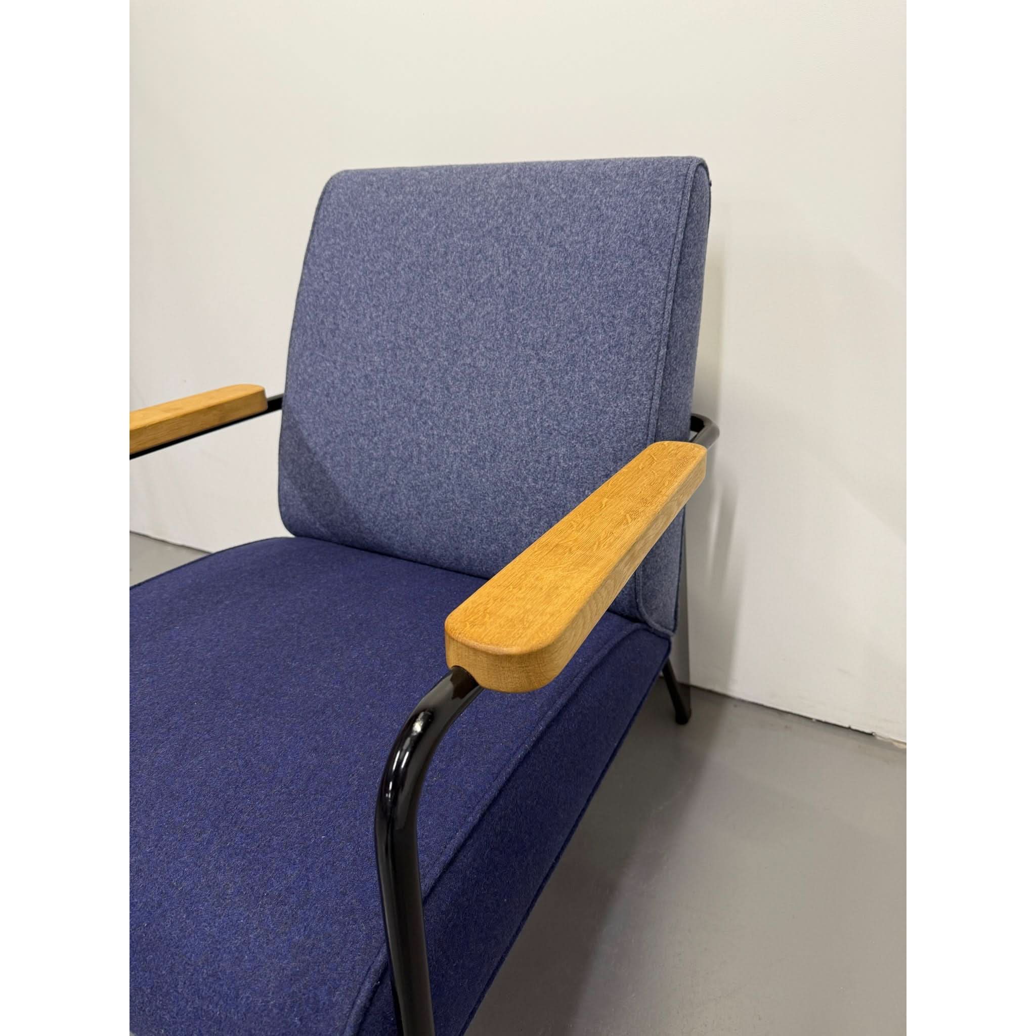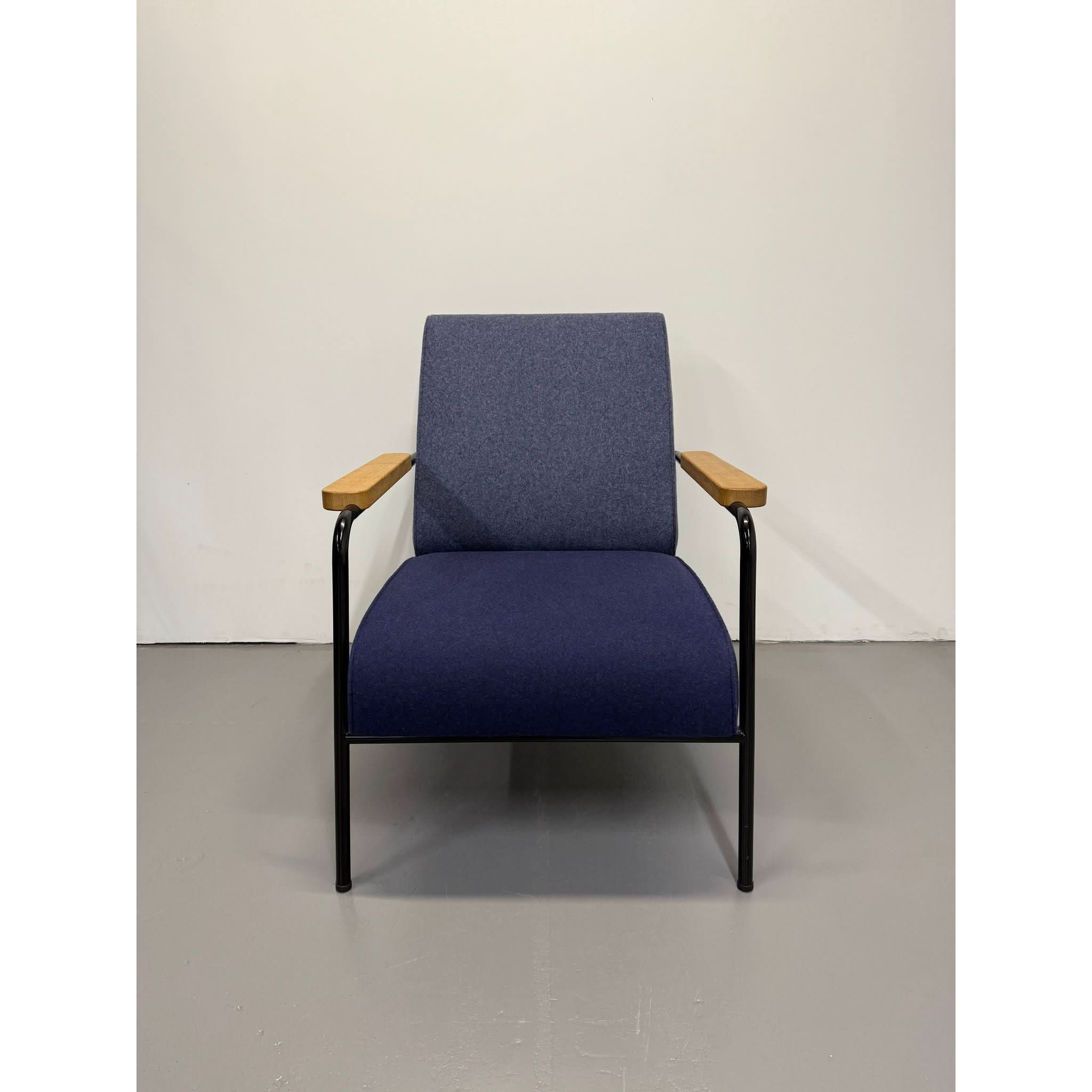 Its powder-coated steel frame evokes architectural strength, while solid oak armrests and structured seat/back cushions add warmth and sophistication. The balance of bold lines and comfortable form reflects Prouvé’s design philosophy: where engineering meets aesthetics.