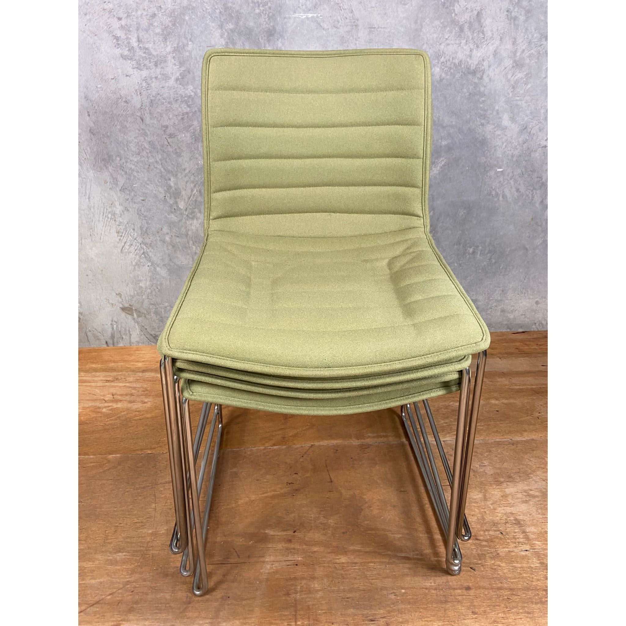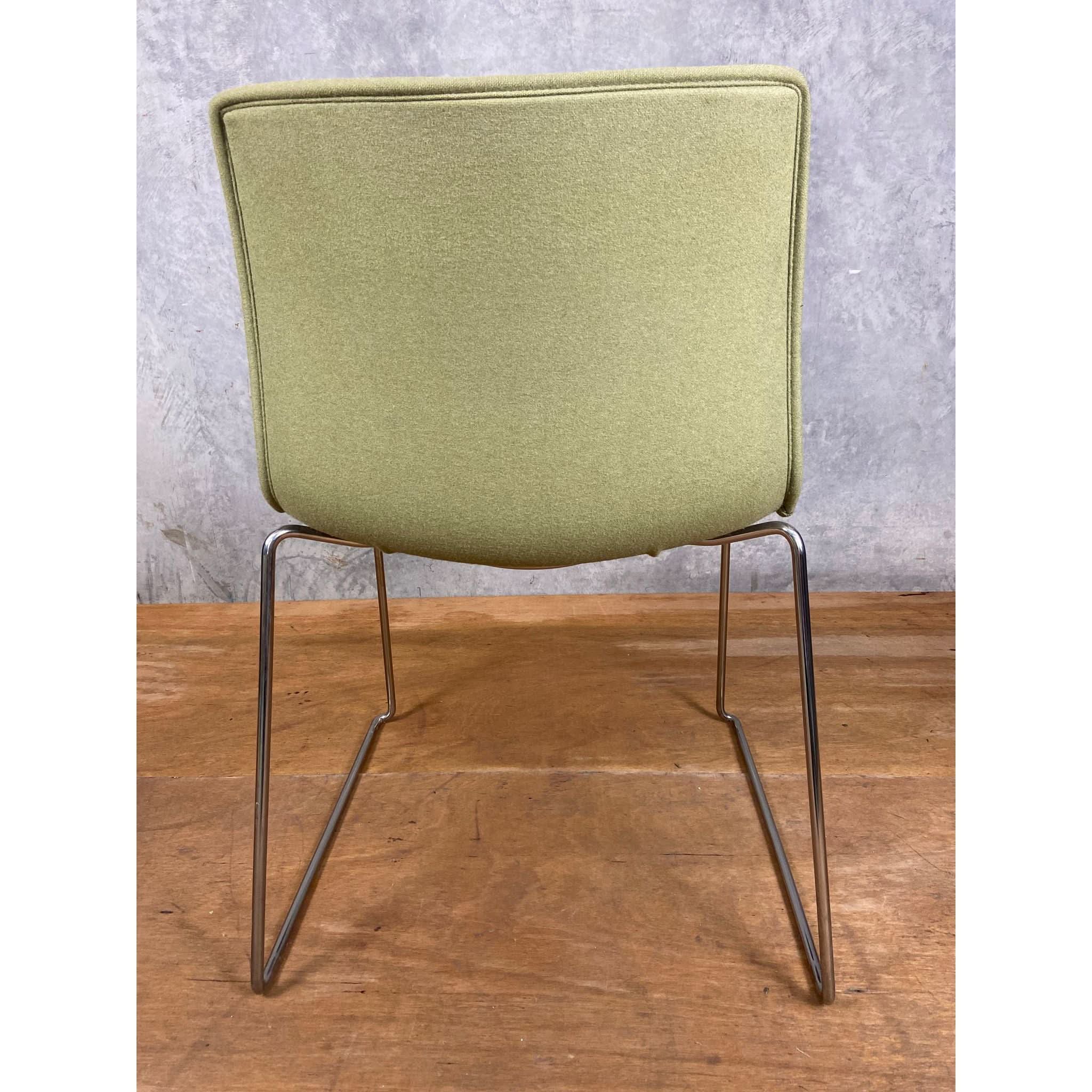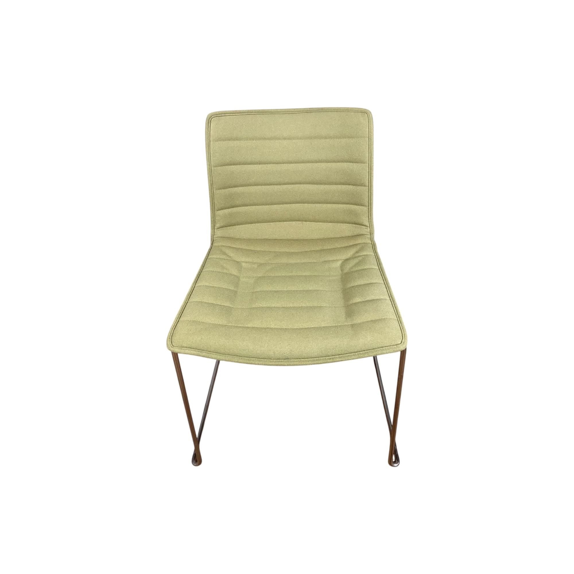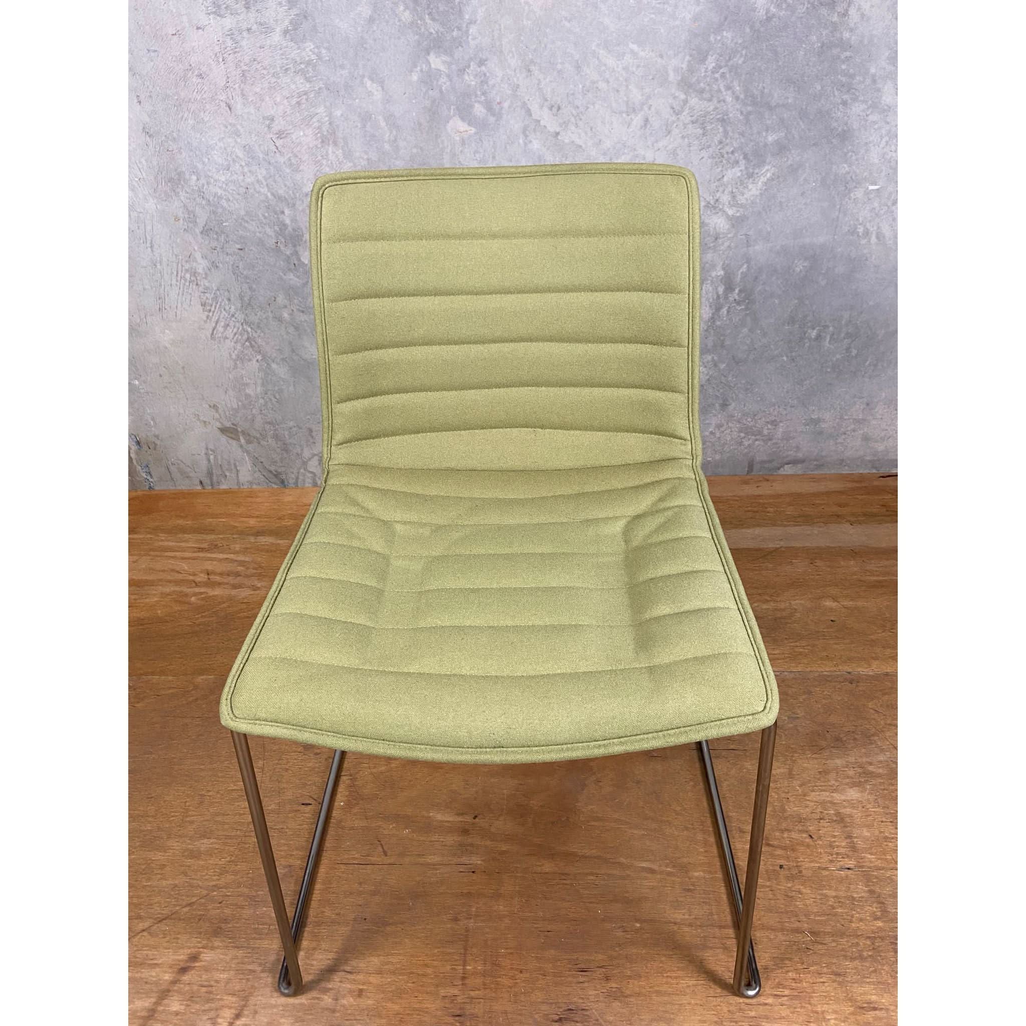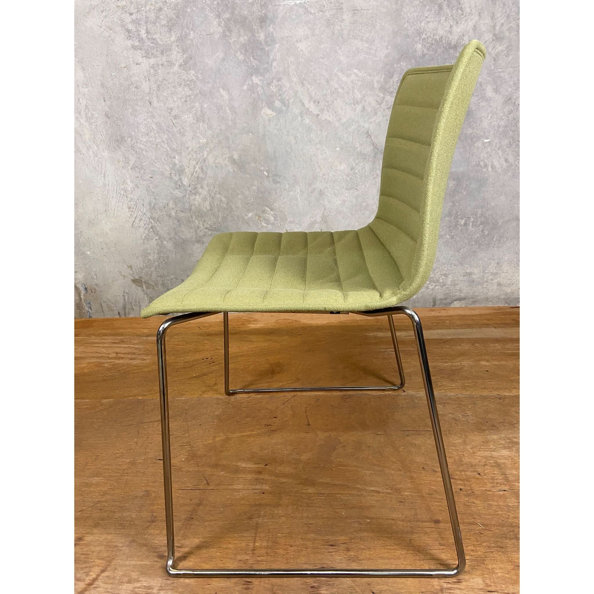 The Arper Catifa Upholstered Office Chair exemplifies refined ergonomic design with its polished chrome sled base providing stable support. Its technical polypropylene shell incorporates post-consumer recycled materials, while the premium woollen upholstery delivers professional comfort and environmental consciousness in one sophisticated seating solution.