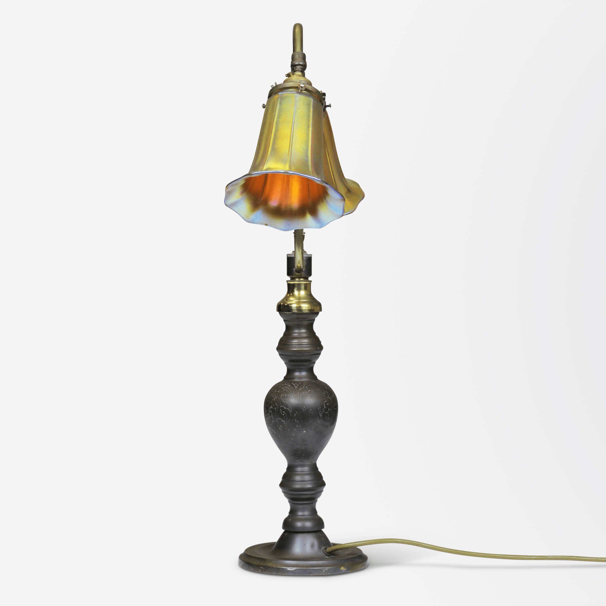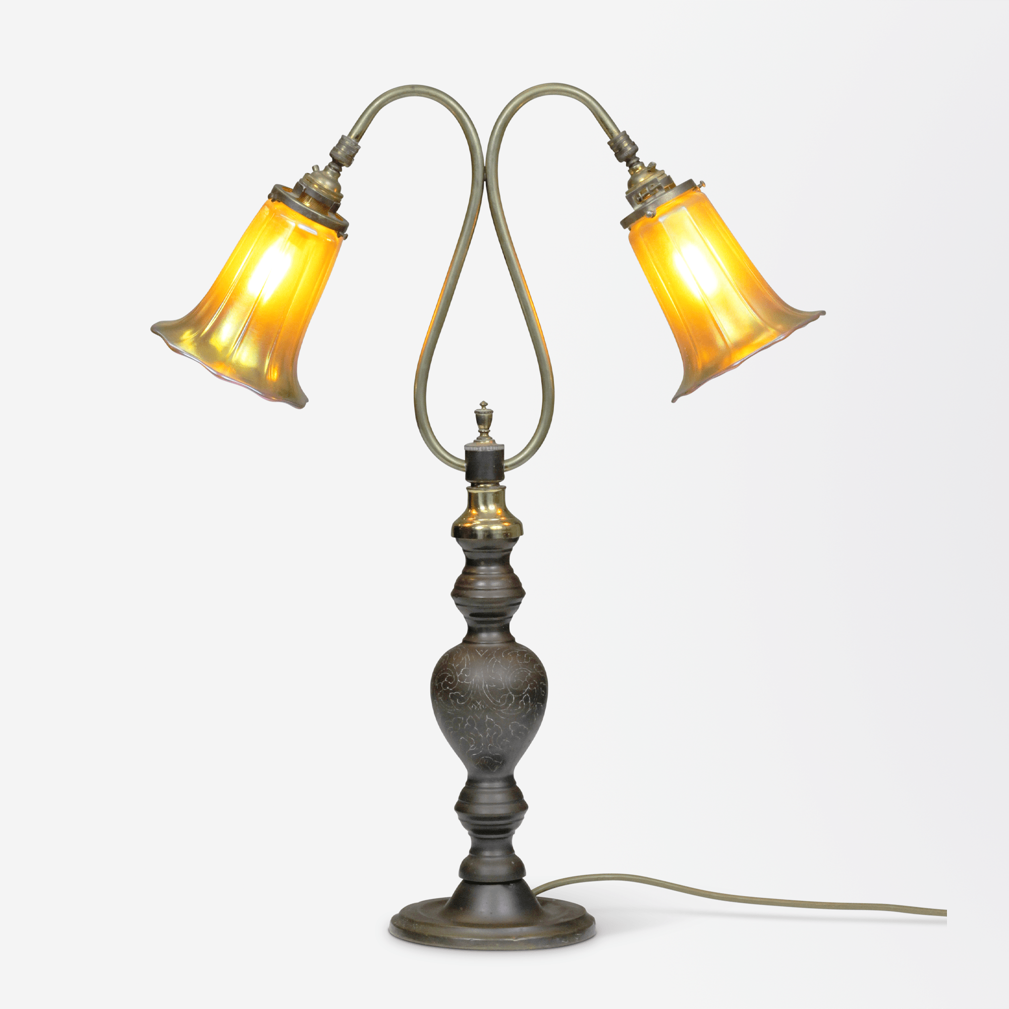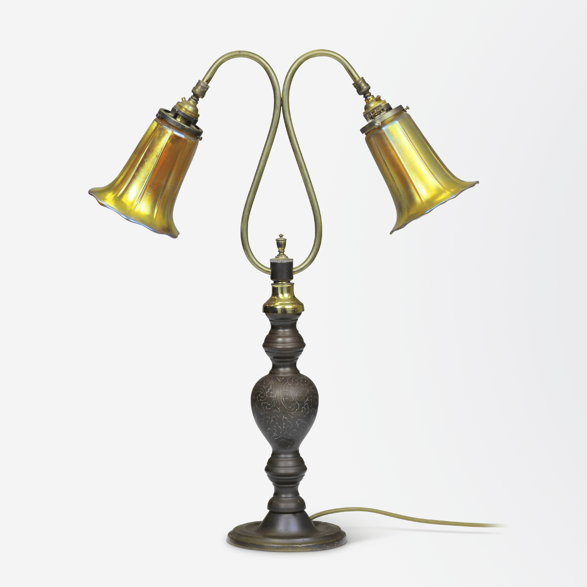 A bronze table lamp from the United States in the Art Deco period, with Tiffany Studio style glass shades in iridescent gold.