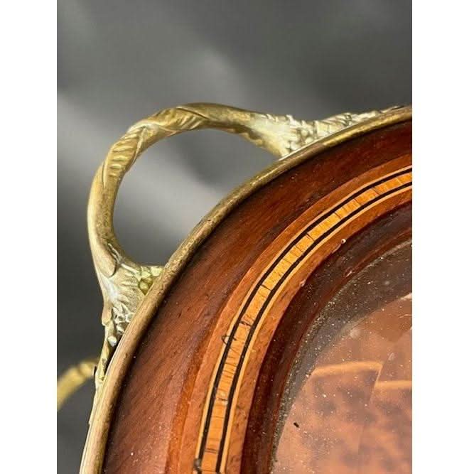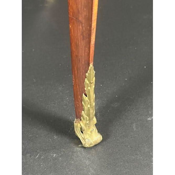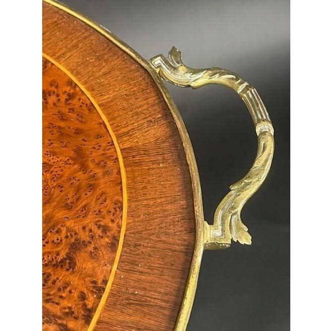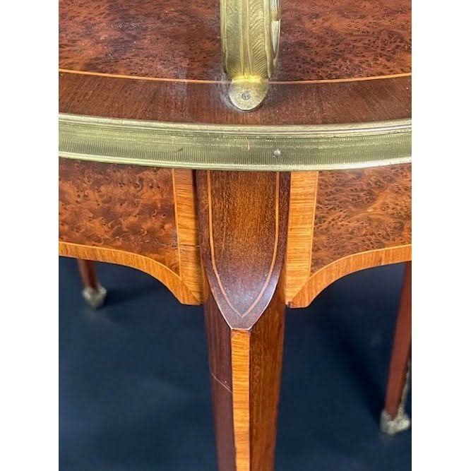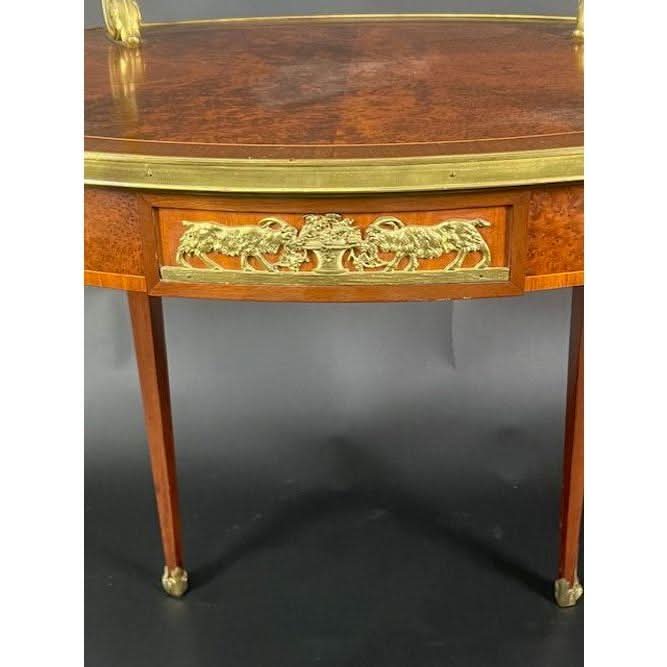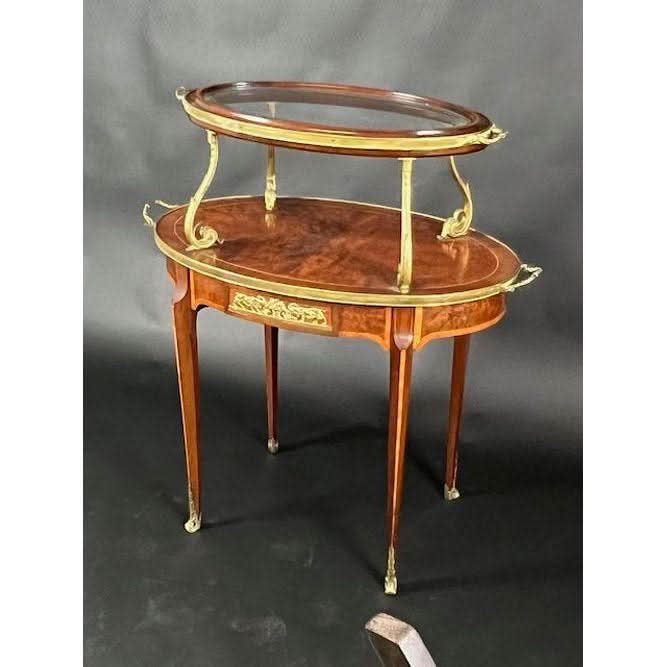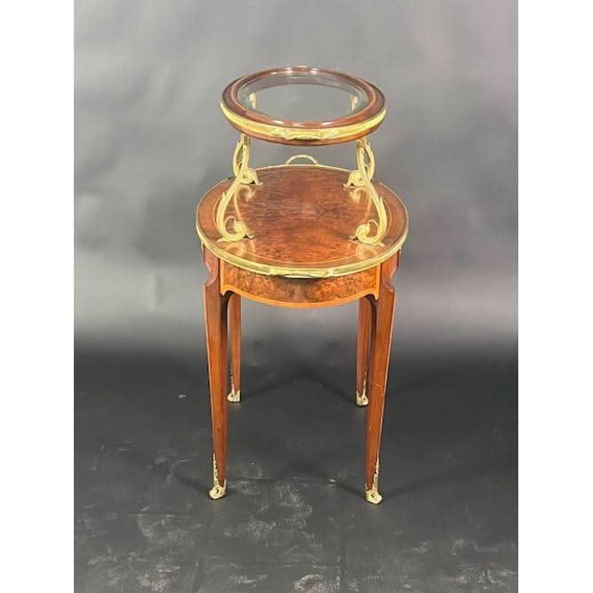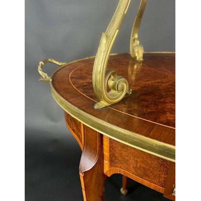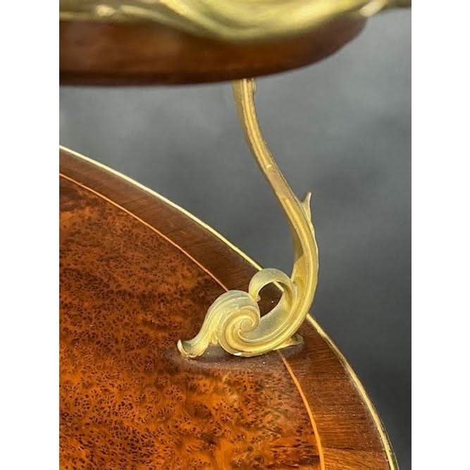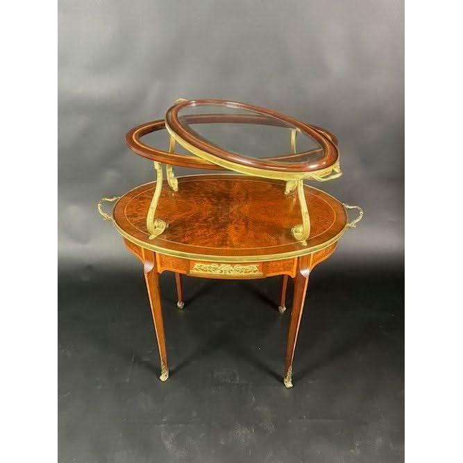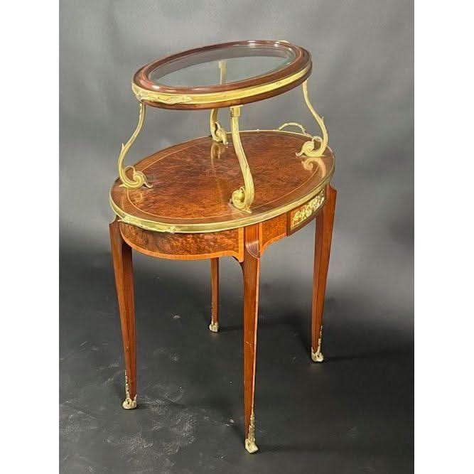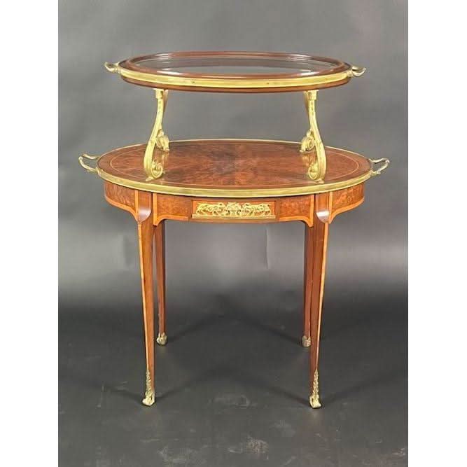This is a lovely quality and most useful piece of stylish furniture. It was made in France during the 1930s Art Deco period and blends some slight Deco influences with the Traditional 19th century style. This Etagere comprised of basically an oval table with a raised oval tier with a removable serving tray The tray is oval and Mahogany framed with cross banding detail, has cast gild decorative carry handles at both ends and a bevelled glass base. The lower section is also oval is finished with an outer cross banding and line inlay plus a book leaf matched rare Amboyna centre panel. there is a gilt brass edge molding around the whole perimeter. There are four cast bronze gilt ’S’ shaped scrolled supports for the upper tray tier. The apron is crossbanded and line inlaid so as to compliment the table top surface and is embellished with a classic motif applied front and rear gilt Bronze decorative panels and the arpon flows into the four elegant shaped and tapered cabriole legs which have cast and gild decorative toe sabots.