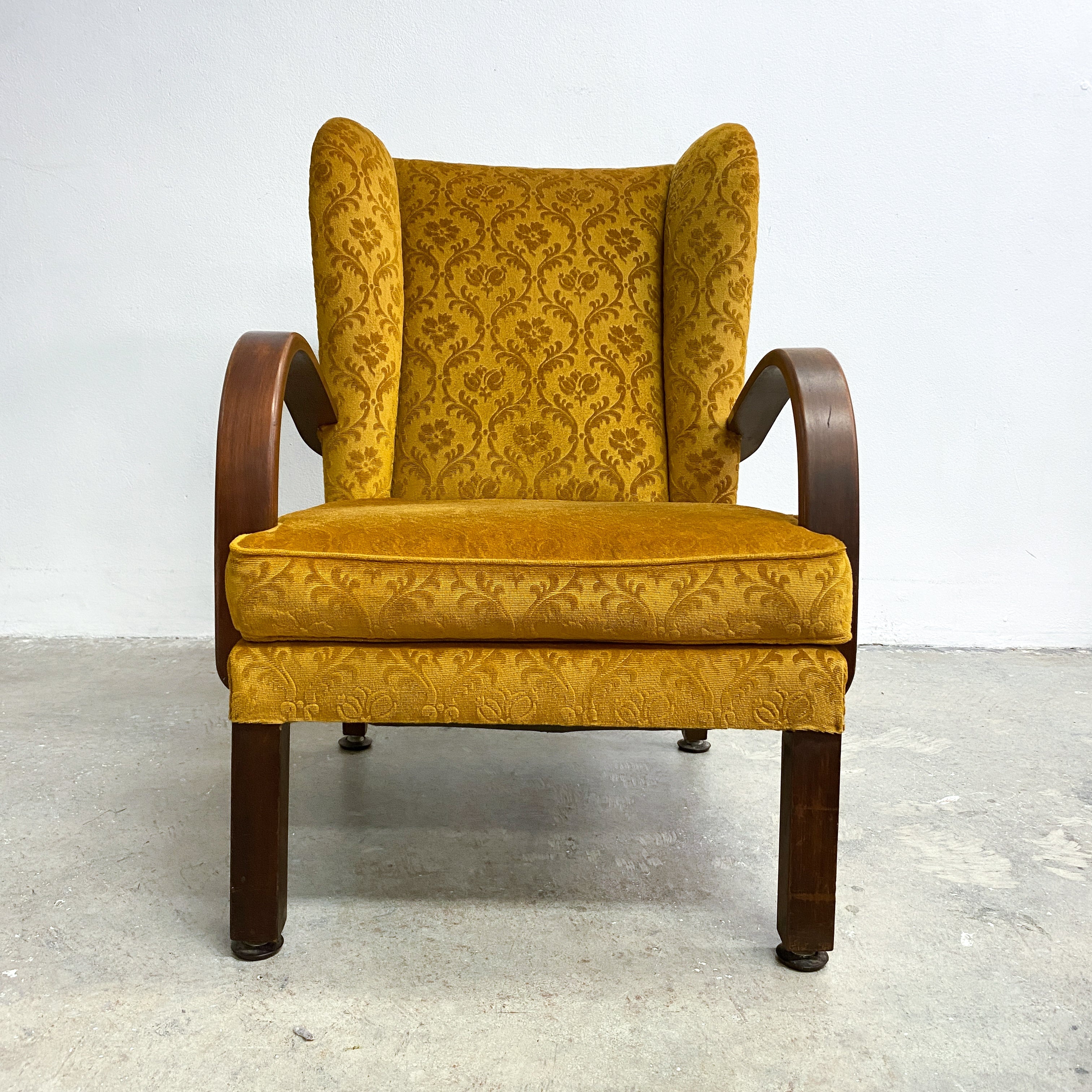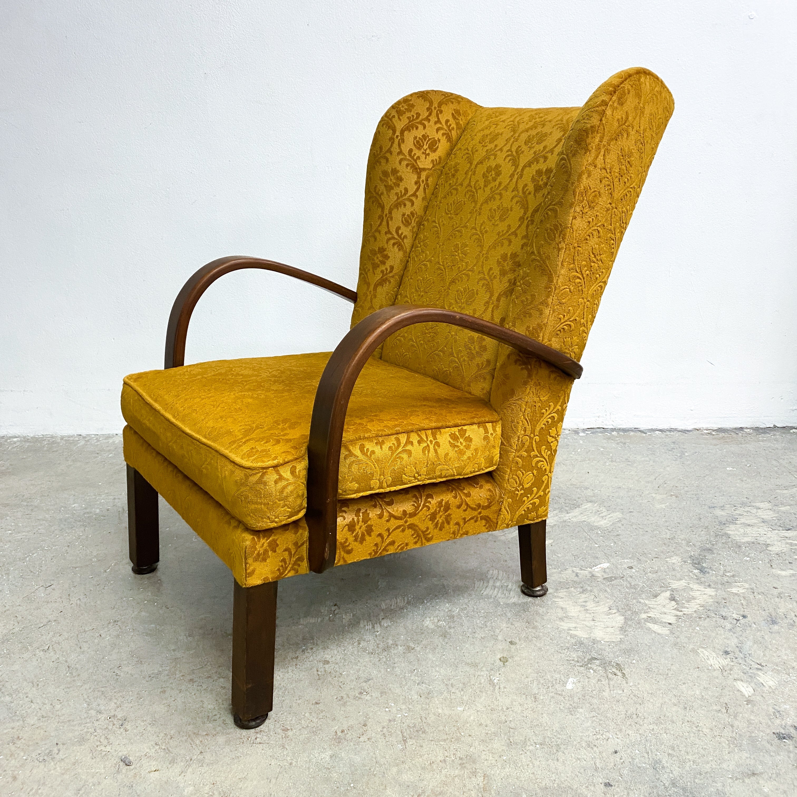 Elegance of the 1940s with this stunning Art Deco wingback armchair. Featuring beautifully curved bentwood arms and legs, upholstered in a luxurious golden damask fabric. Excellent vintage condition with minor wear consistent with age