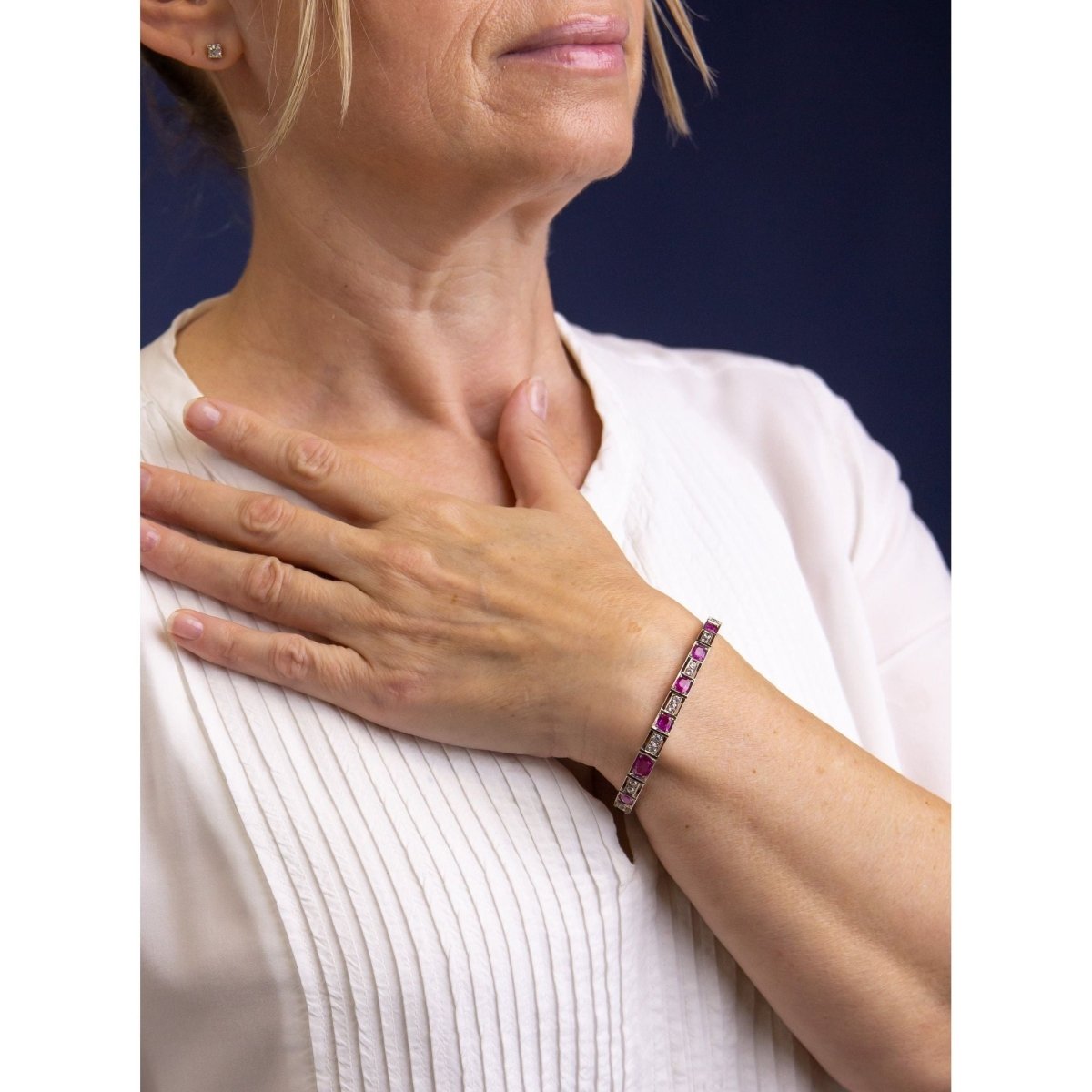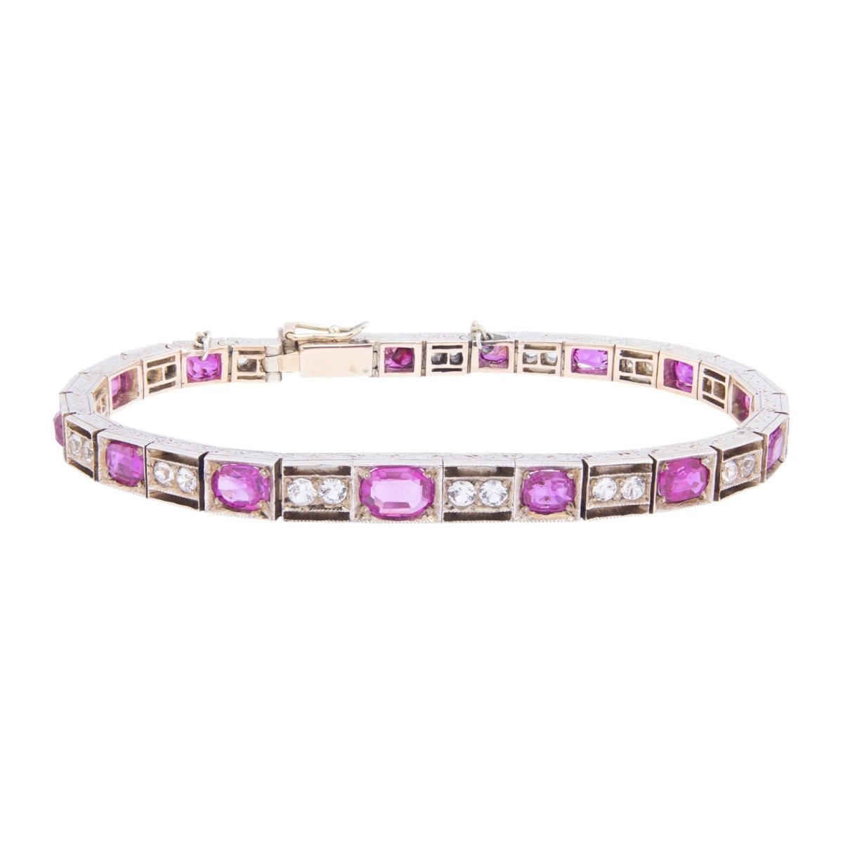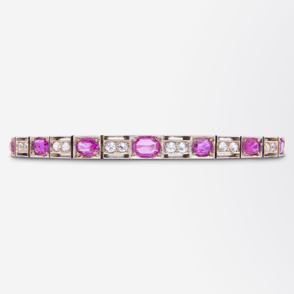 This rather exceptional natural Burmese ruby and white sapphire bracelet dates to the Art Deco period and possibly originates in India. The sterling silver and 9 karat rose gold frame has been hand crafted and contains 14 oval cut natural Burmese rubies along with 32 brilliant cut colourless white sapphires. The total ruby weight is calculated to be 8.40 carat and each are classed as 'pink red natural rubies, old Burmese' in colour and origin. The bracelet is slightly graduated with the closure ends being slightly narrower than the centre of the piece. The piece closes with an integrated tongue and box clasp which has a figure of eight safety clasp along with a safety chain for added security. The outside edges of this beautiful piece are engraved with a delicate floral pattern adding to the charm of the bracelet. This piece was sourced locally in Brisbane and according to the grand daughter of the original owner it was likely sourced in India when her grandparents were living there in the early 20th Century. An absolutely beautiful Art Deco bracelet which stands beautifully alone or could be combined with several diamond tennis bracelets for a really glamorous look.