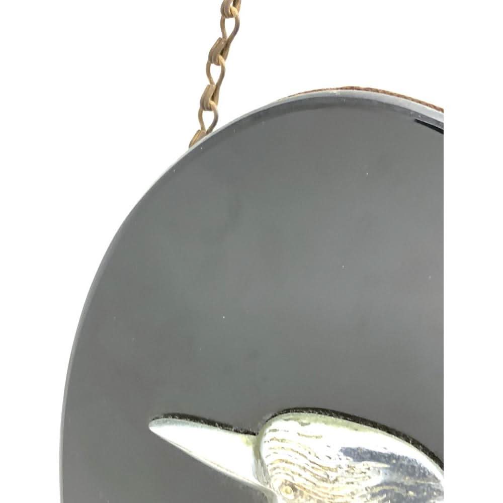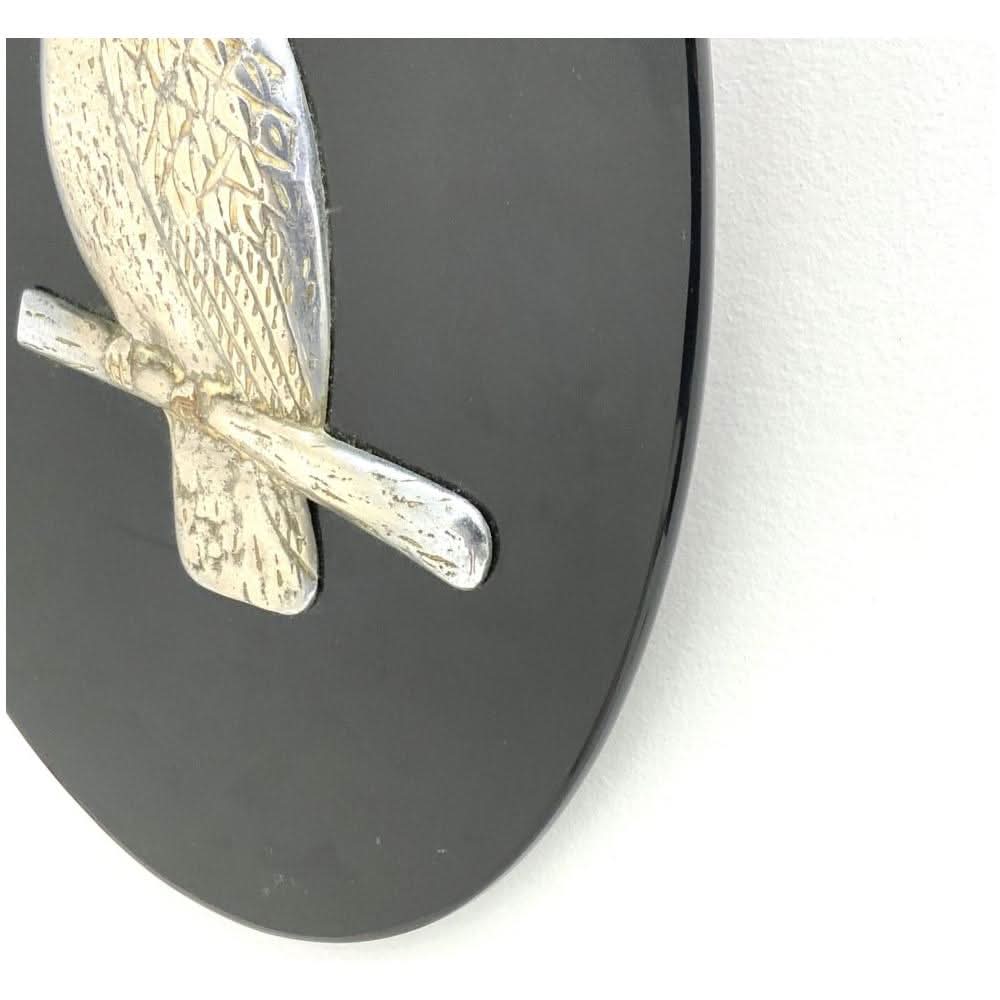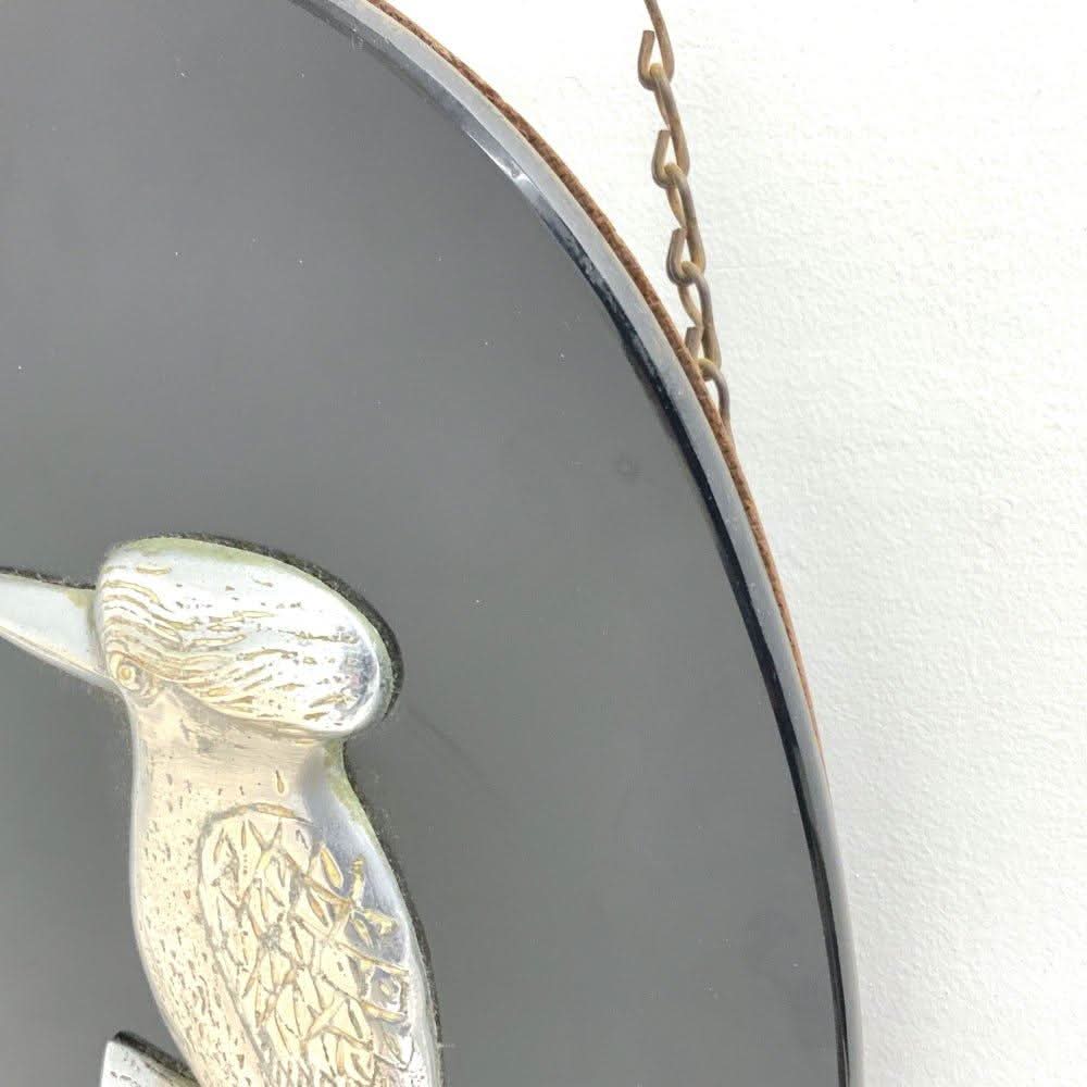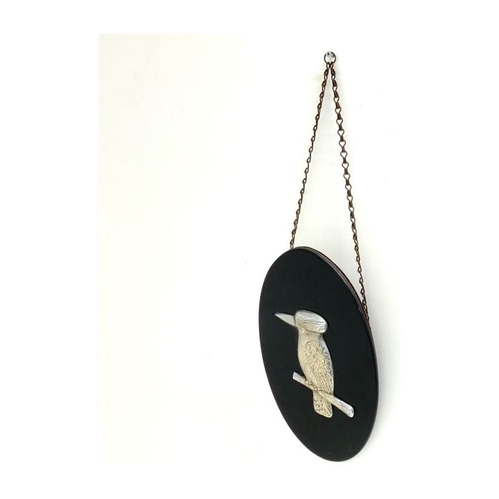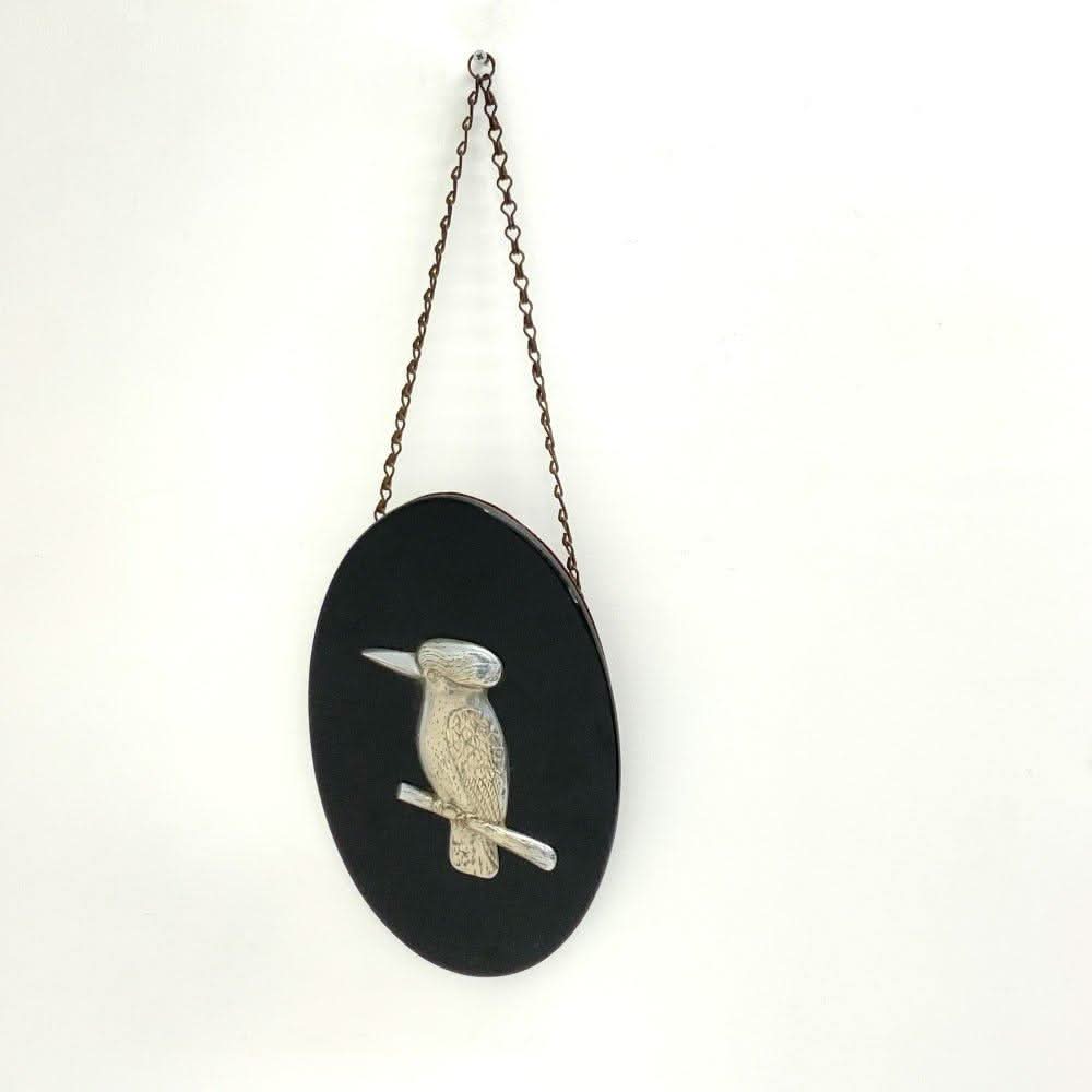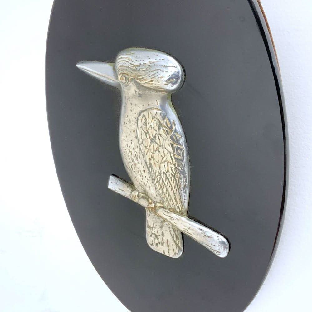 Art Deco hanging wall plaque. Chromed kookaburra on black oval glass.