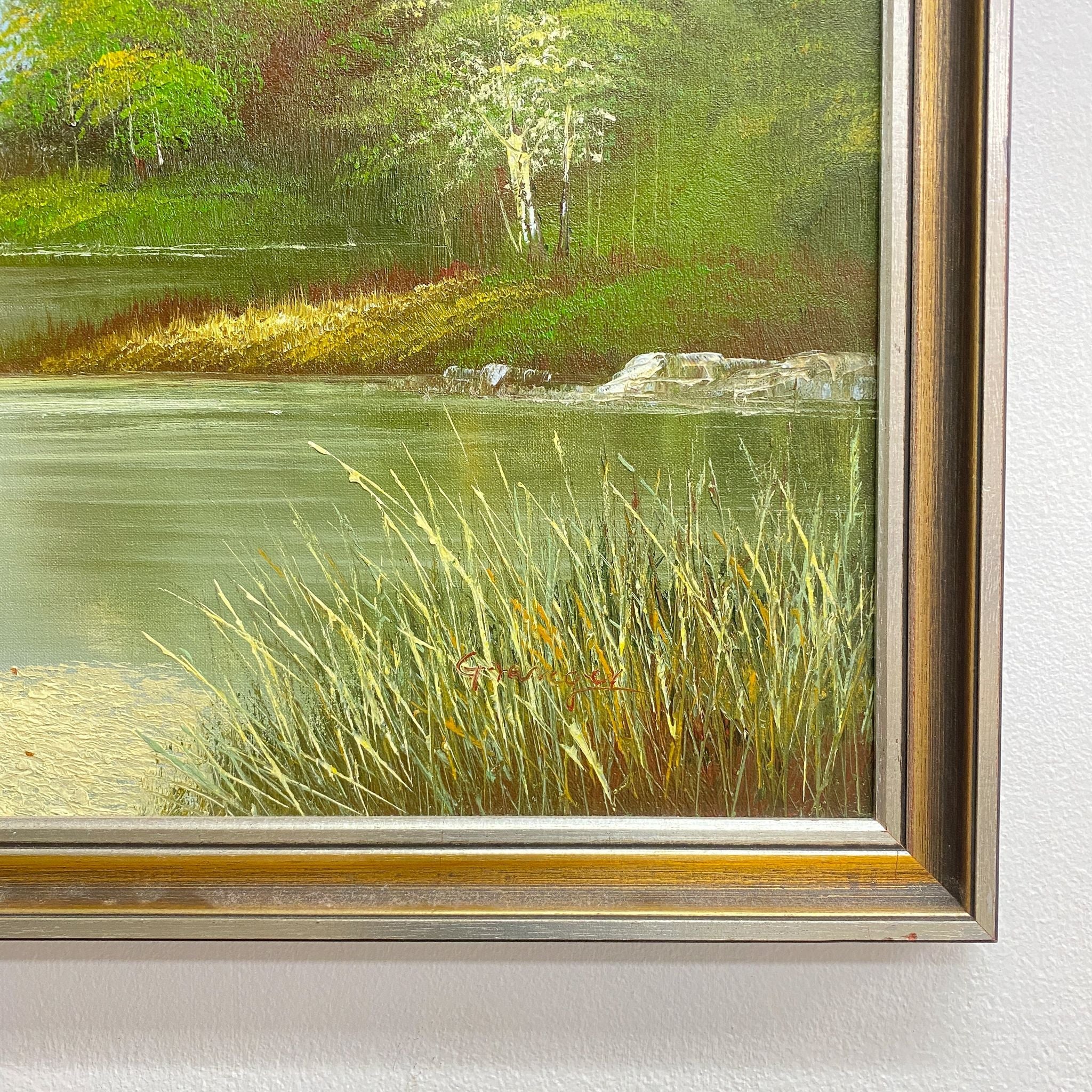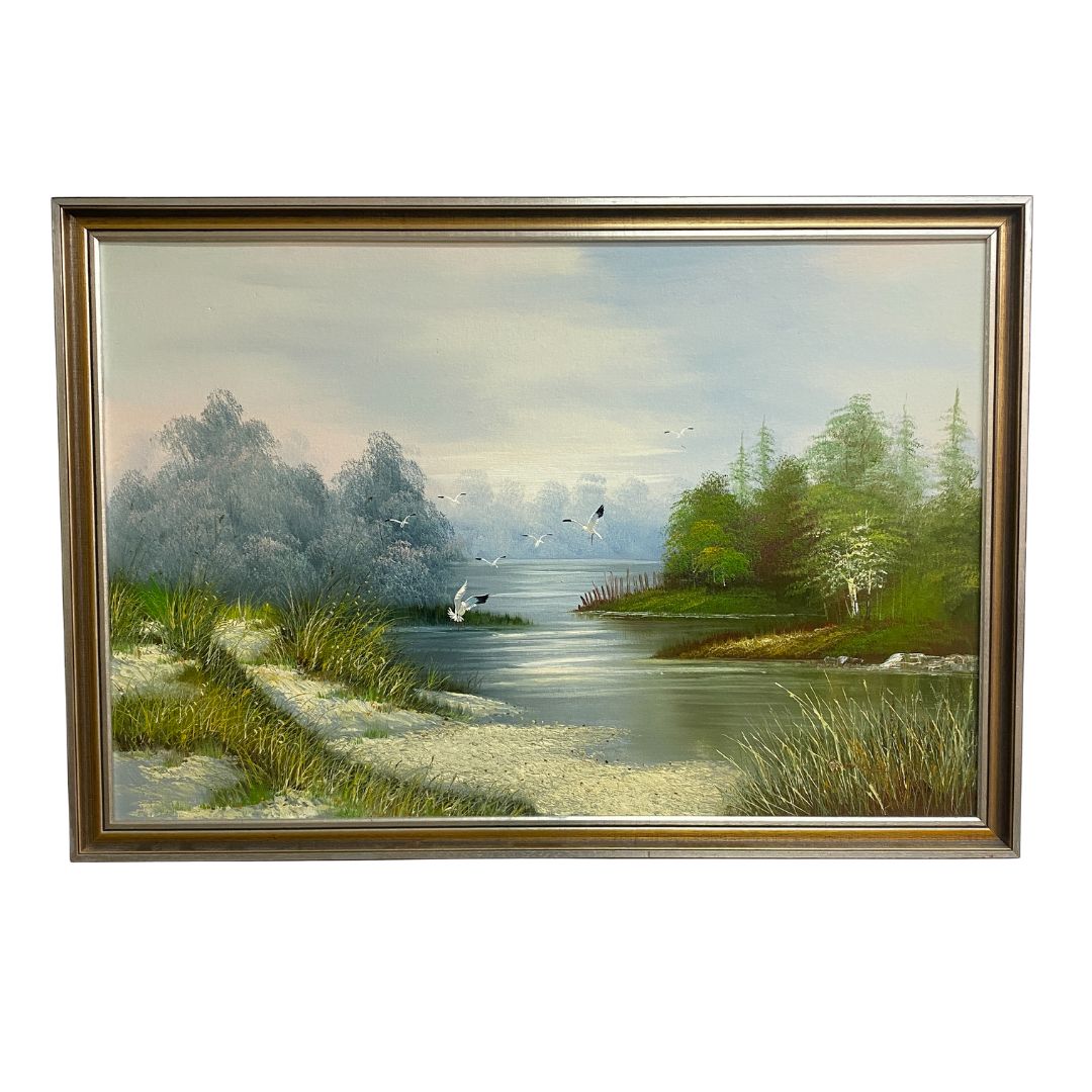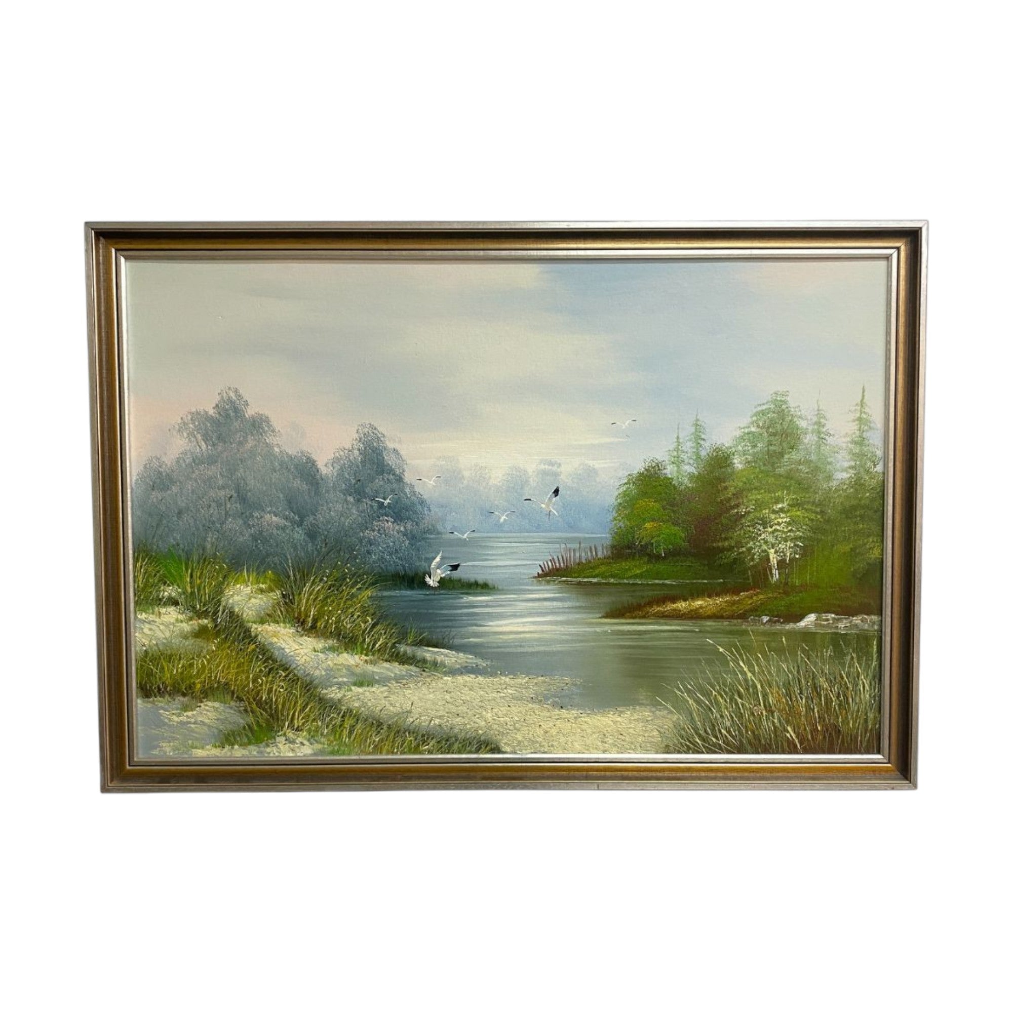 Vintage landscape painting depicting a tranquil river scene framed by lush greenery, soft misty trees, and graceful water birds in flight. Signed by the artist Granger in the lower corner
