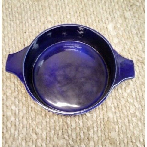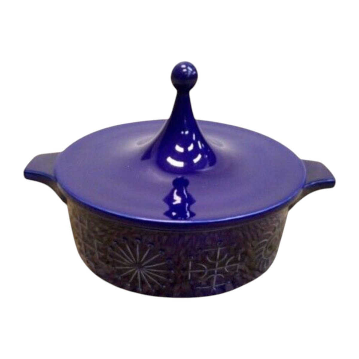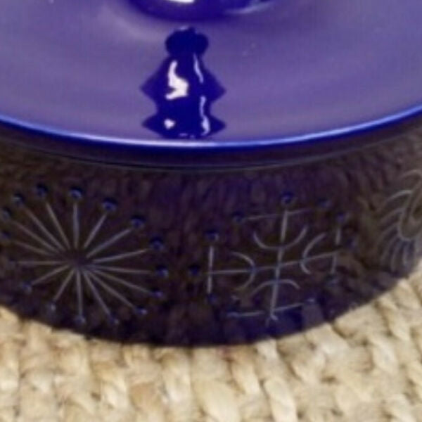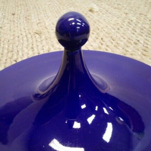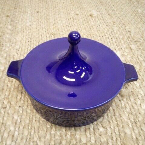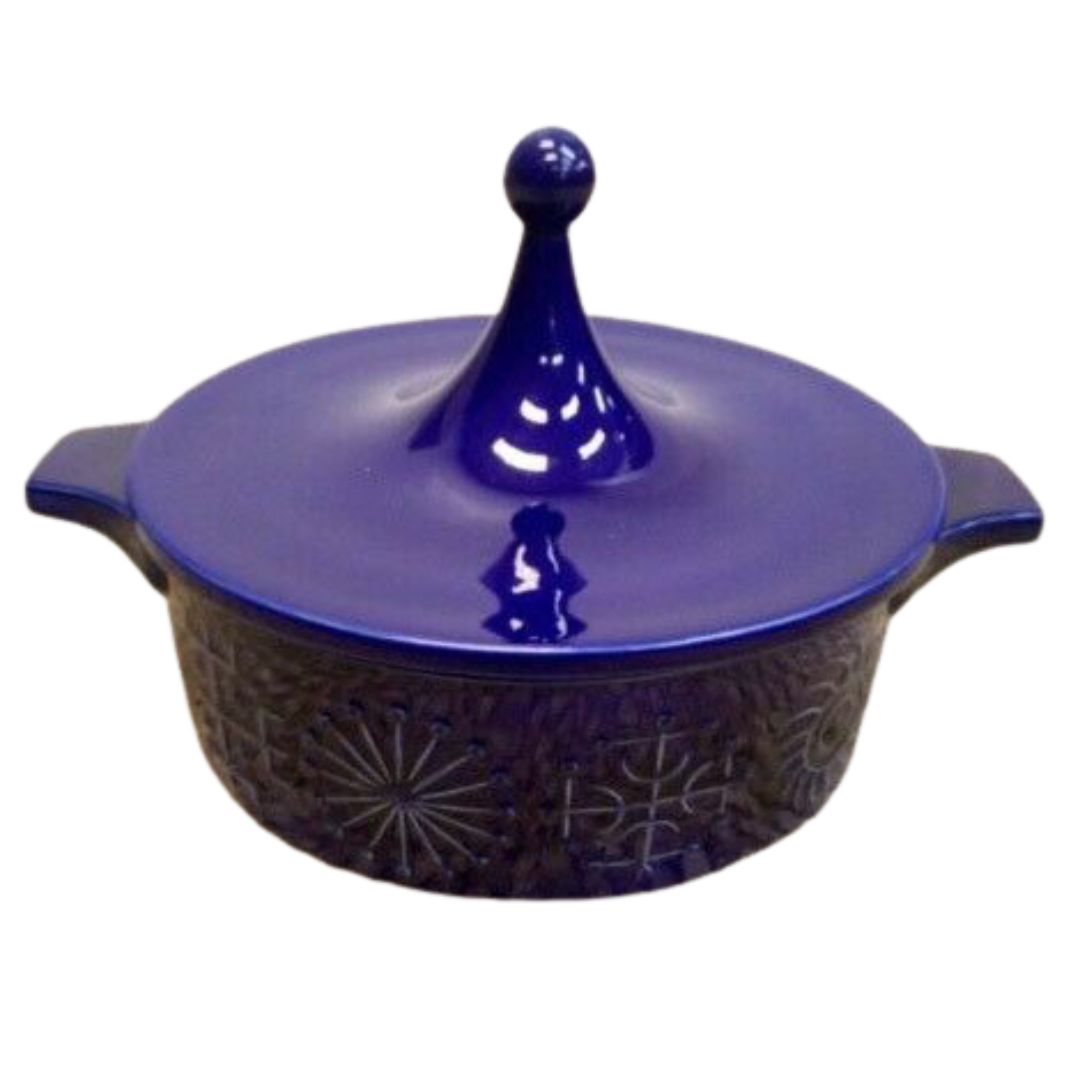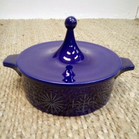 Circa 1960s this stunning example of English Studio Pottery is by Susan Williams Ellis for the Portmeirion Studio. The pattern/ decor/ range is called ‘Totem’ and various dinner services and cookware etc come in a range of colours. The cobalt blue glaze is the most coveted and collectable and thus much harder to come by. This Casserole Dish is even harder to find as the elegant lids were often broken! This example is in fabulous condition no chips or cracks