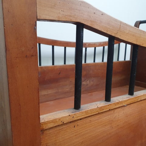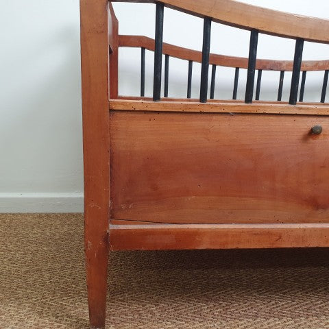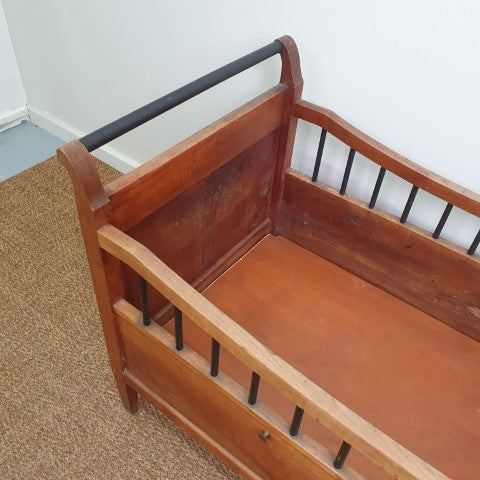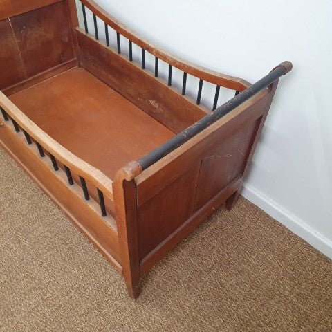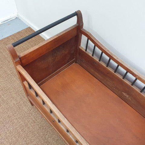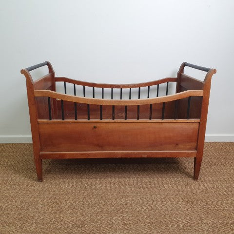 This antique Biedermeier-style cot dates from the 1820s–1850s and features a curved headboard and footboard with contrasting dark vertical spindles against a warm-toned wood frame. Its slightly splayed legs and elegant proportions reflect the refined simplicity of the Biedermeier era. The cot is now best suited for decorative display, such as showcasing dolls or toys, rather than practical use.