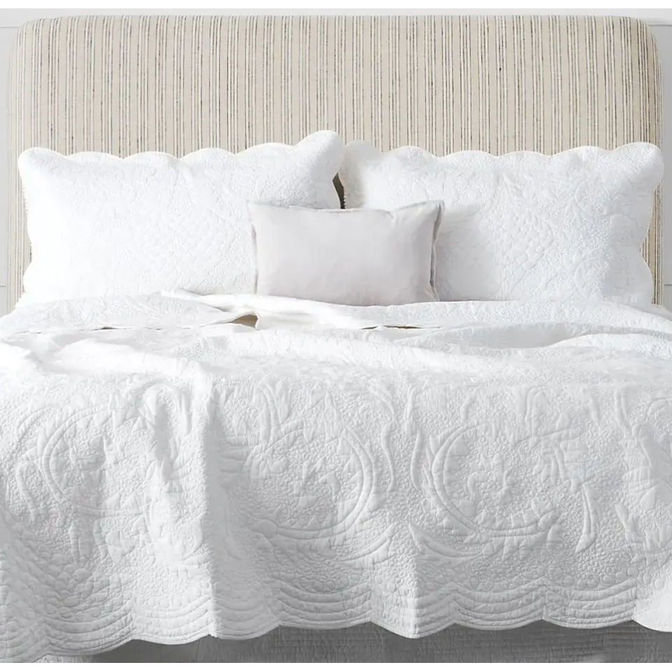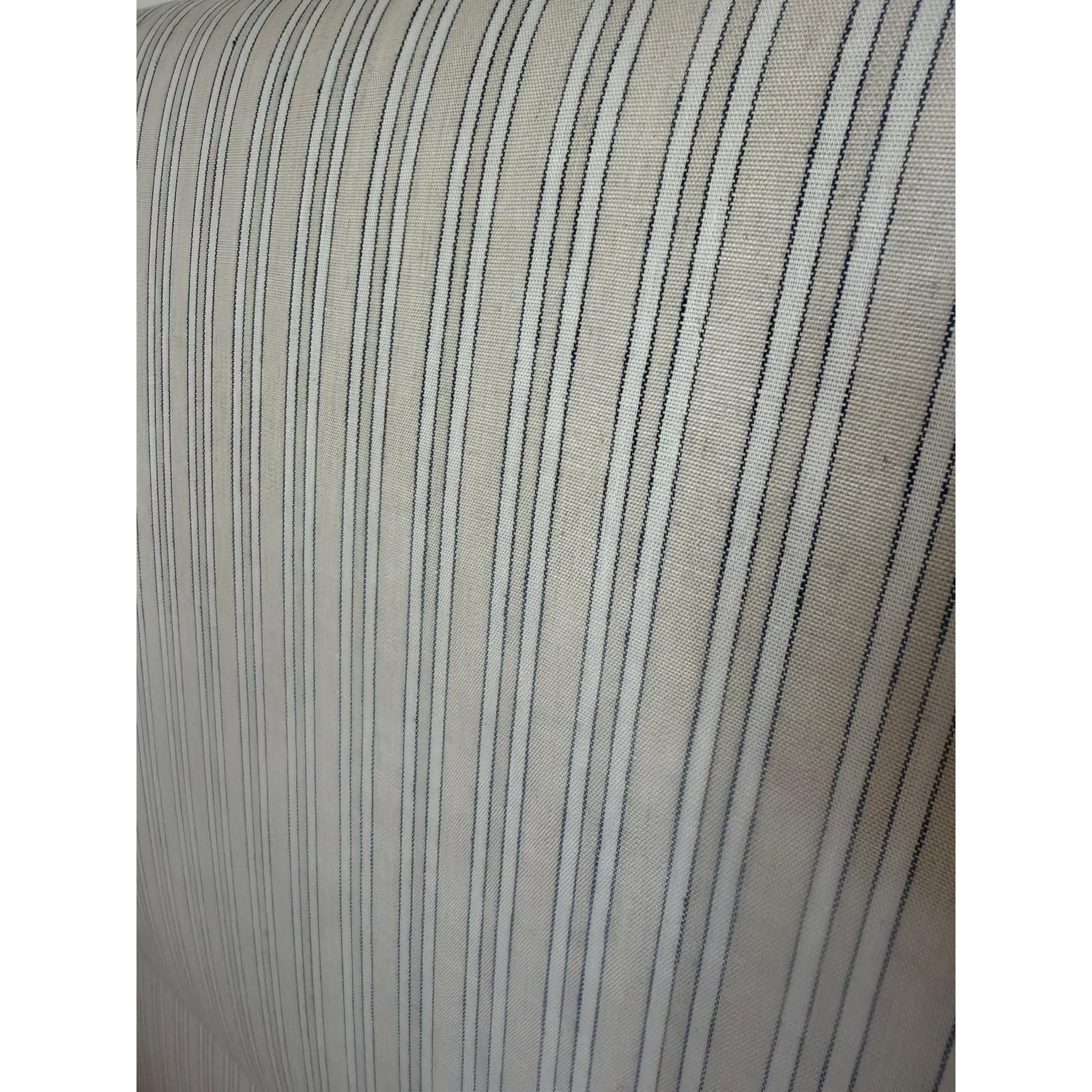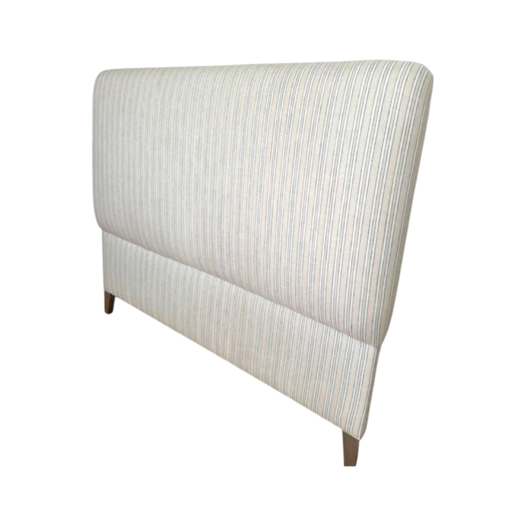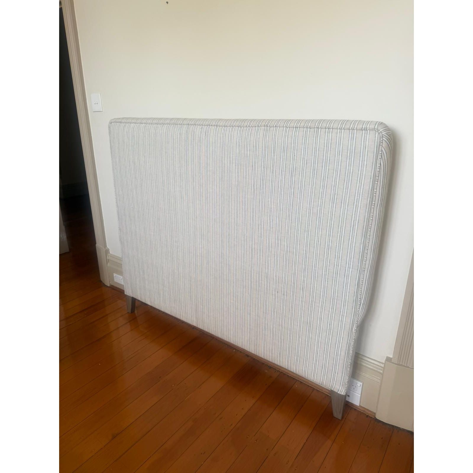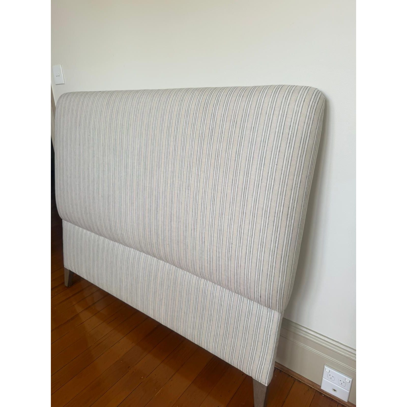 Purchased originally from Provincial Home Living, never used as new Queen size bedhead. The Arcadia Bedhead is a stylish blend of comfort and elegance. Supported by sturdy oak legs, it features subtle, striped linen upholstery for a touch of sophistication. Thoughtfully designed, the bedhead offers a padded, supportive backdrop for relaxing or reading, making it both functional and stylish. With its quality craftsmanship and versatile appeal, the Arcadia Bedhead is a refined addition to any bedroom.