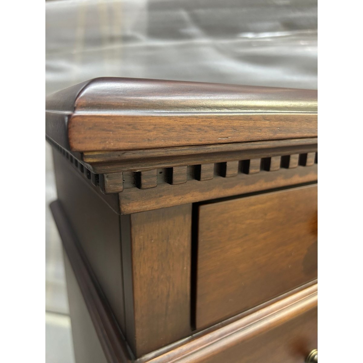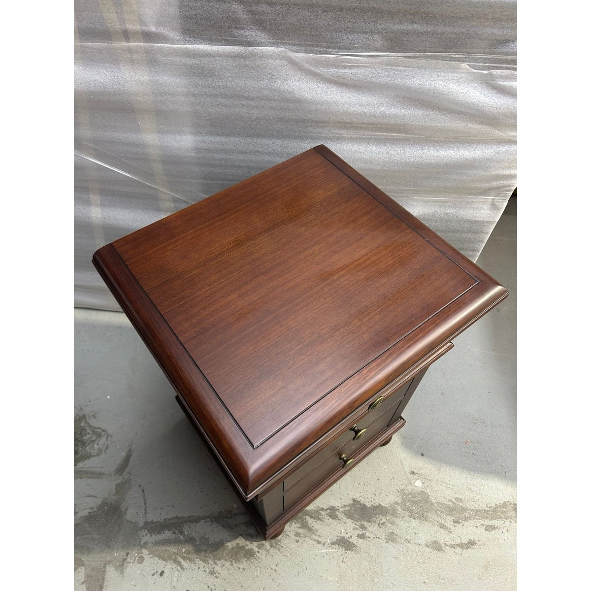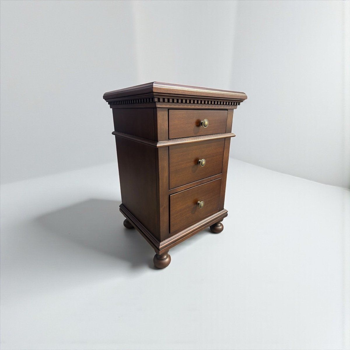 Crafted with a focus on quality and longevity, this solid timber bedside table brings a classic, tailored presence to any space. The walnut polished timber complimented by traditional detailing, including a stepped top profile, dentil edging and turned bun feet— giving the piece a refined, timeless character.
