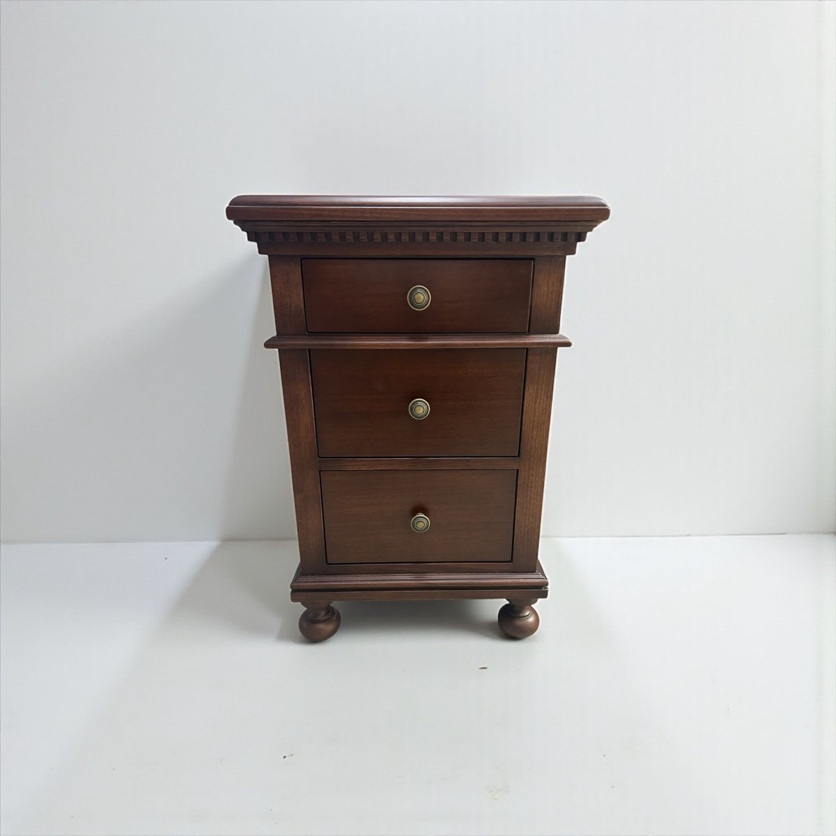 Designed for practical storage, it features three generous drawers fitted with brass hardware, offering smooth functionality and a warm, understated elegance.