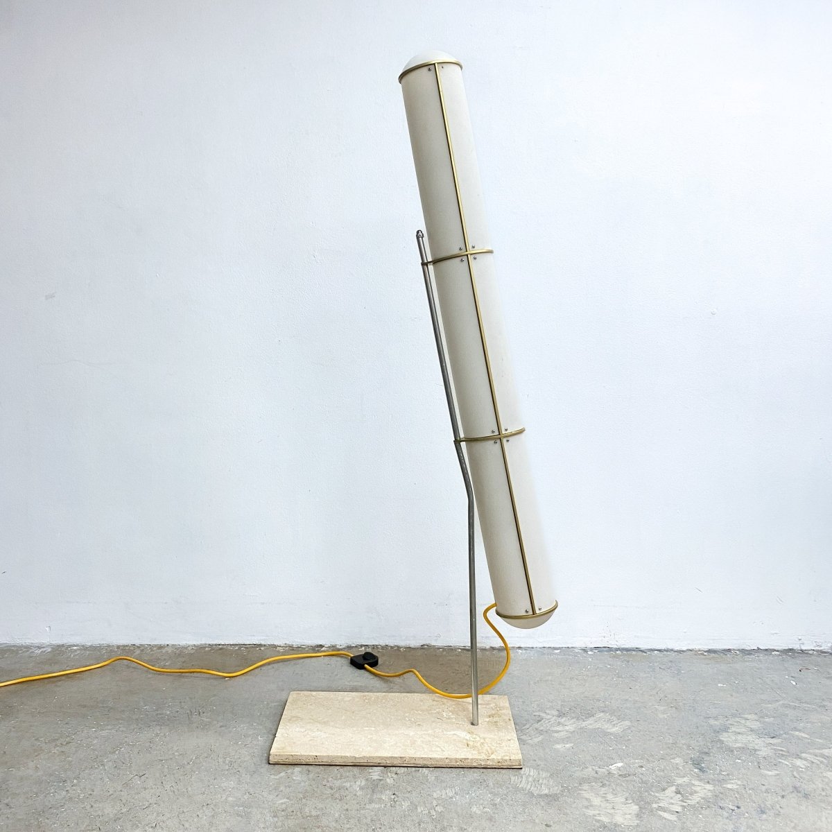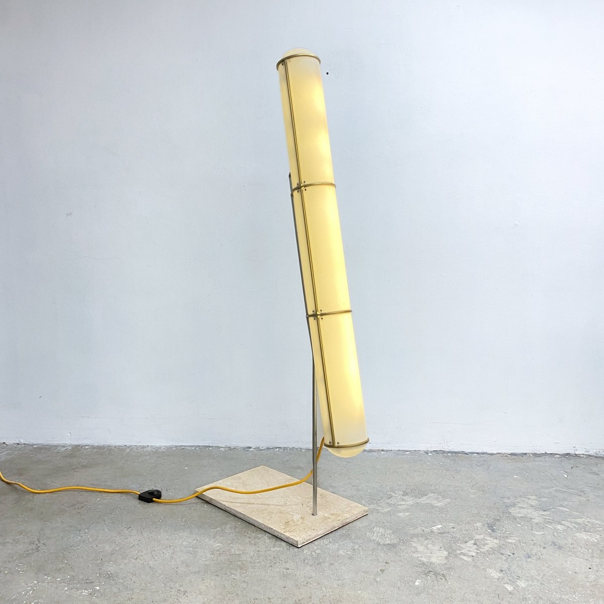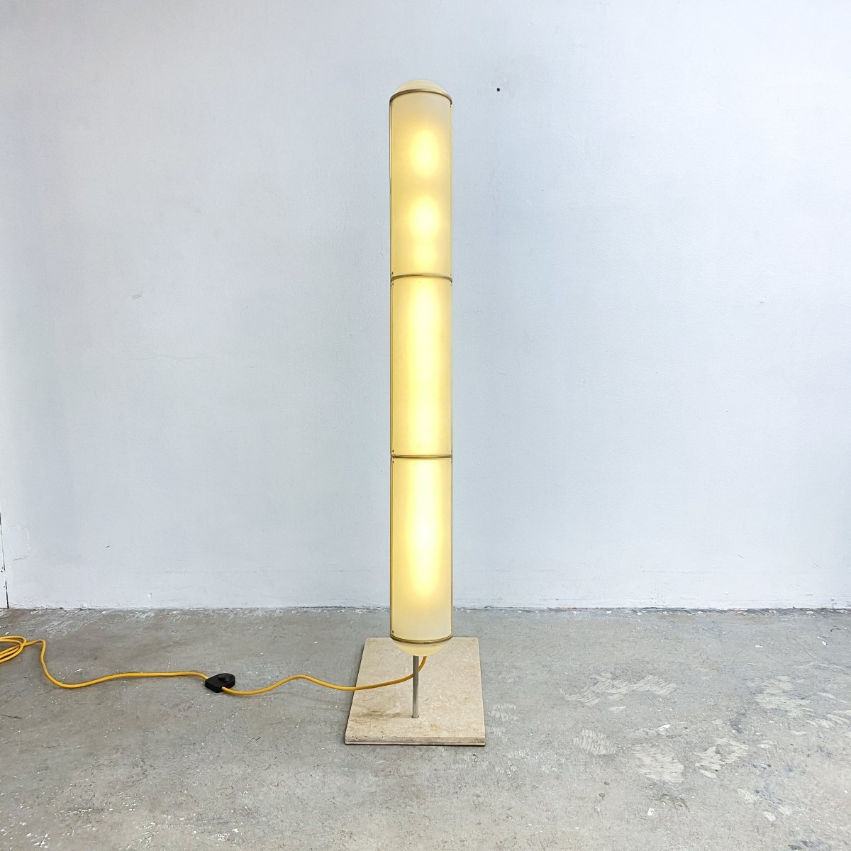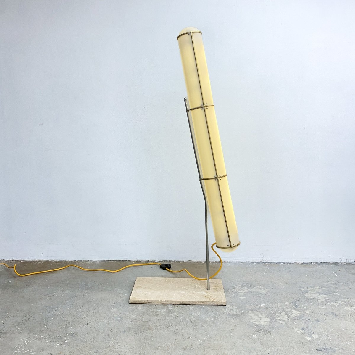 Reimagined from Jason Millar 'Endless' range, this horizontal light has been redesigned into this stunning floor lamp by From The Boneyard, with a travertine base.