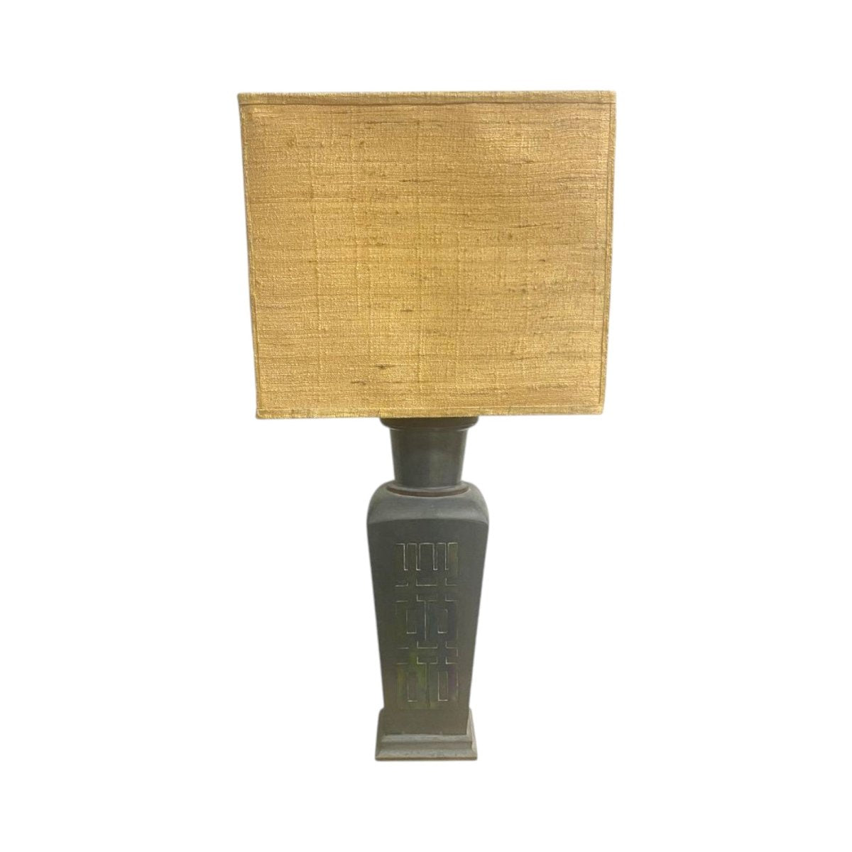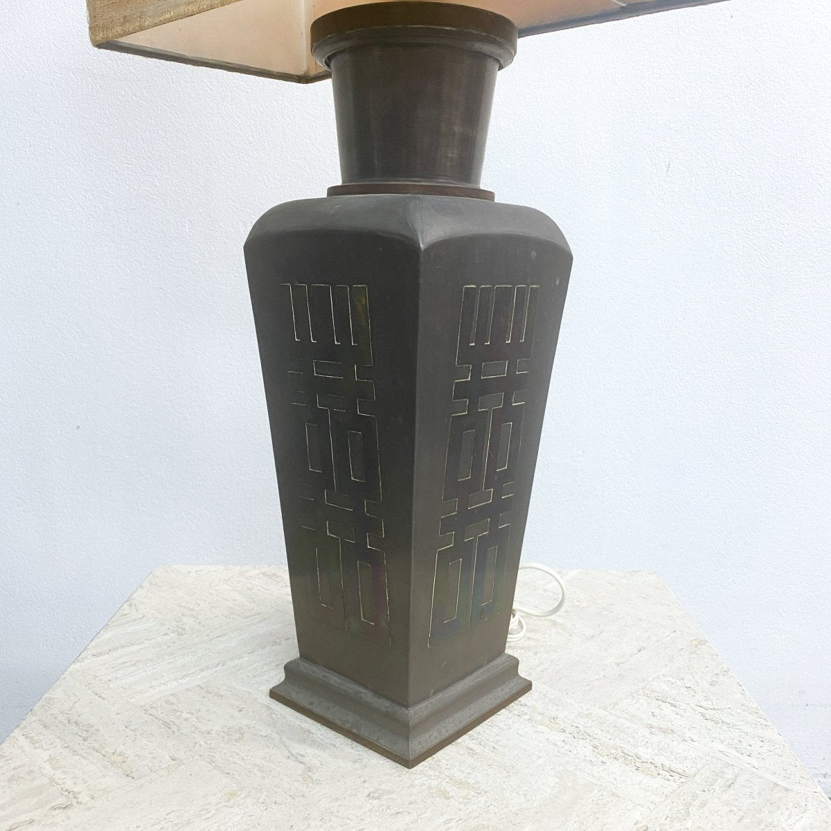 Stunning mid century 1960s pewter lamp with brass Chinoiserie pattern overlay and original raw silk shade. Made in Hong Kong.