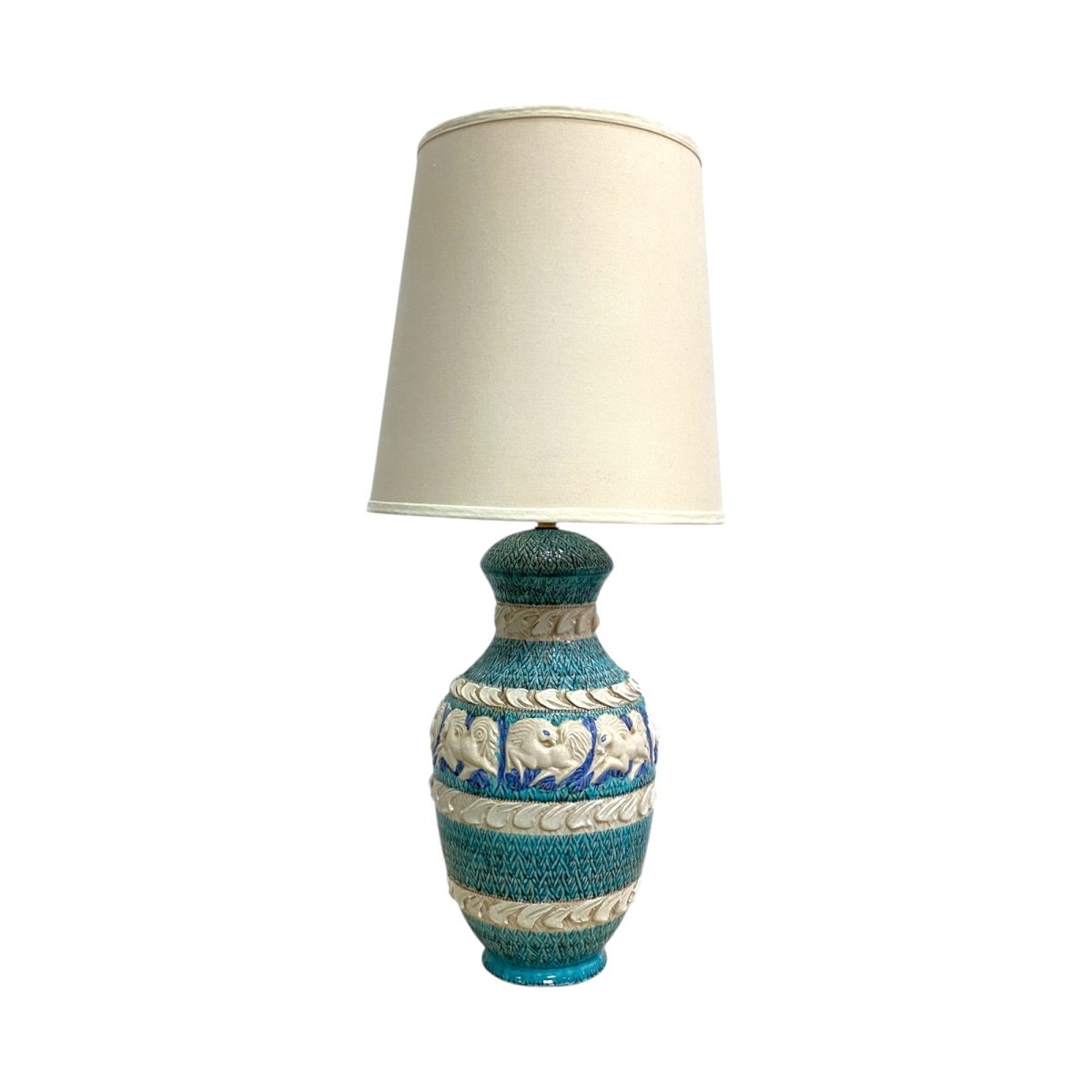 Fabulous mid century Italian ceramic table lamp for Erica designed by Fratelli Fanciullacci. Featuring a textured blue and white base, with a glossy glaze finish and adorned with a band of galloping white horses.
