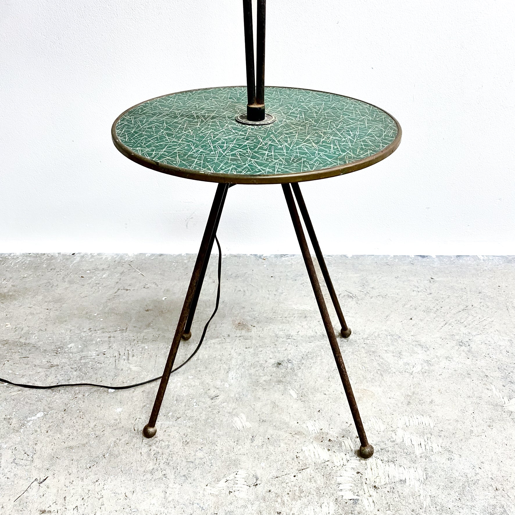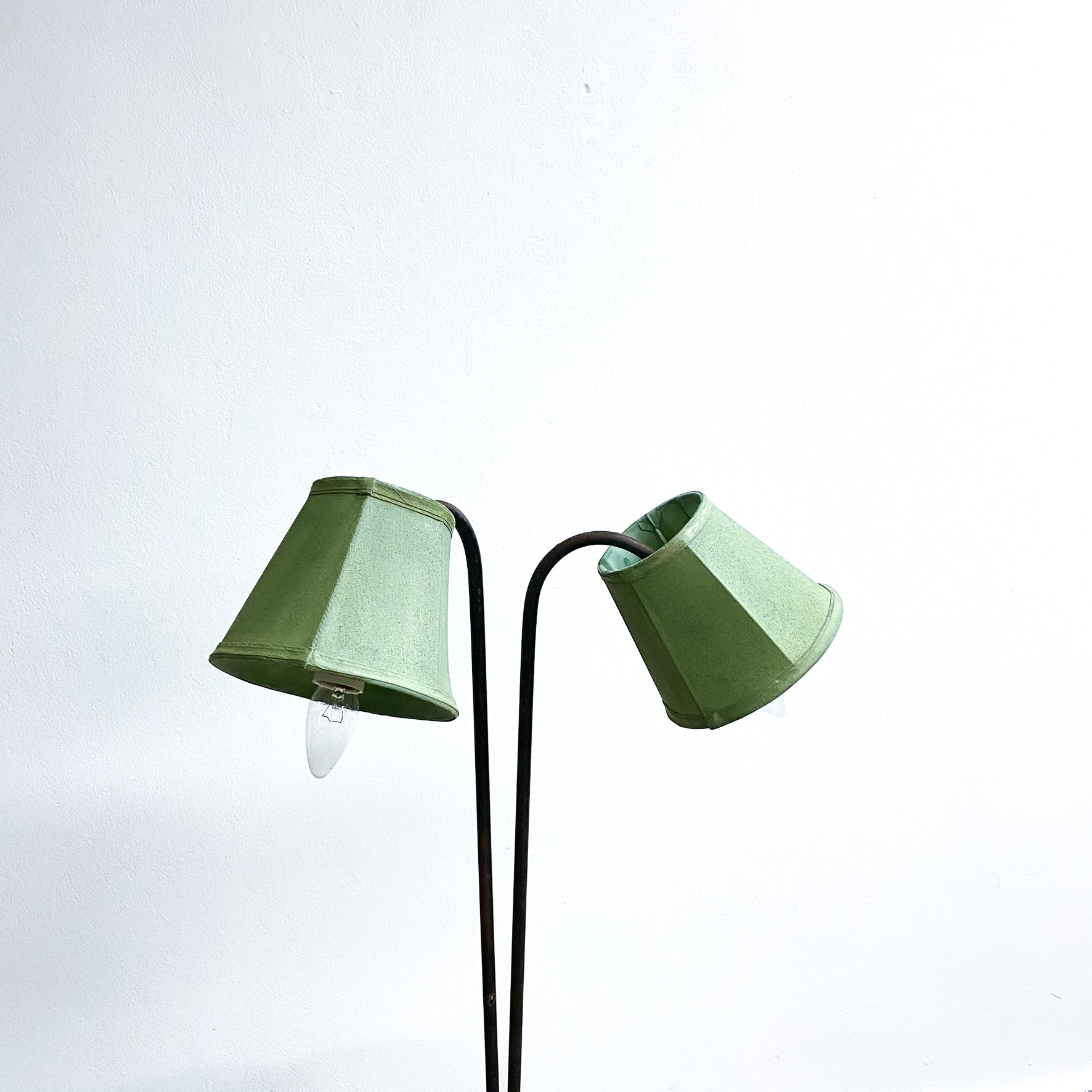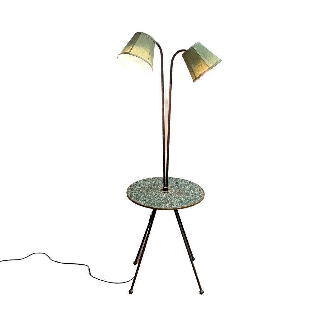 Fabulous mid century 50s/60's twin head floor lamp. Featuring a built in round table with a green patterned top and 2 green fabric shades on a black metal stand.