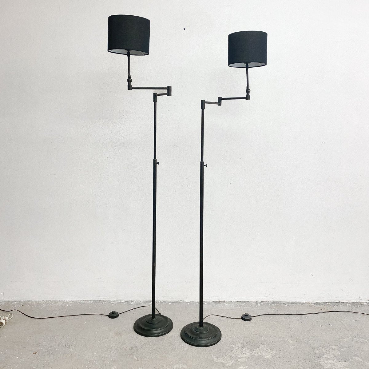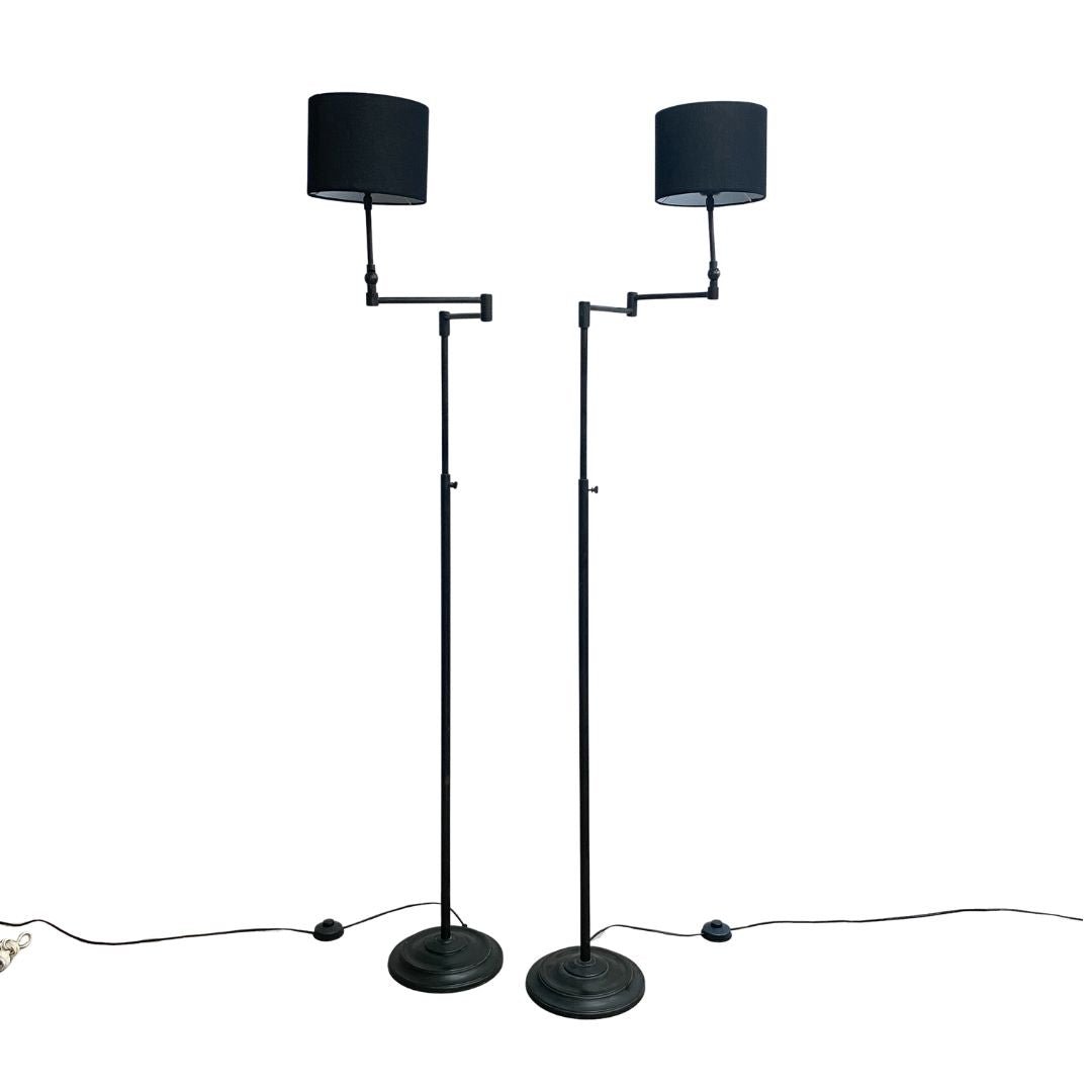 Great pair of blackened brass adjustable floor lamps, with articulated swing arms, sturdy base and foot switch. Perfect for any modern living space. In excellent condition.