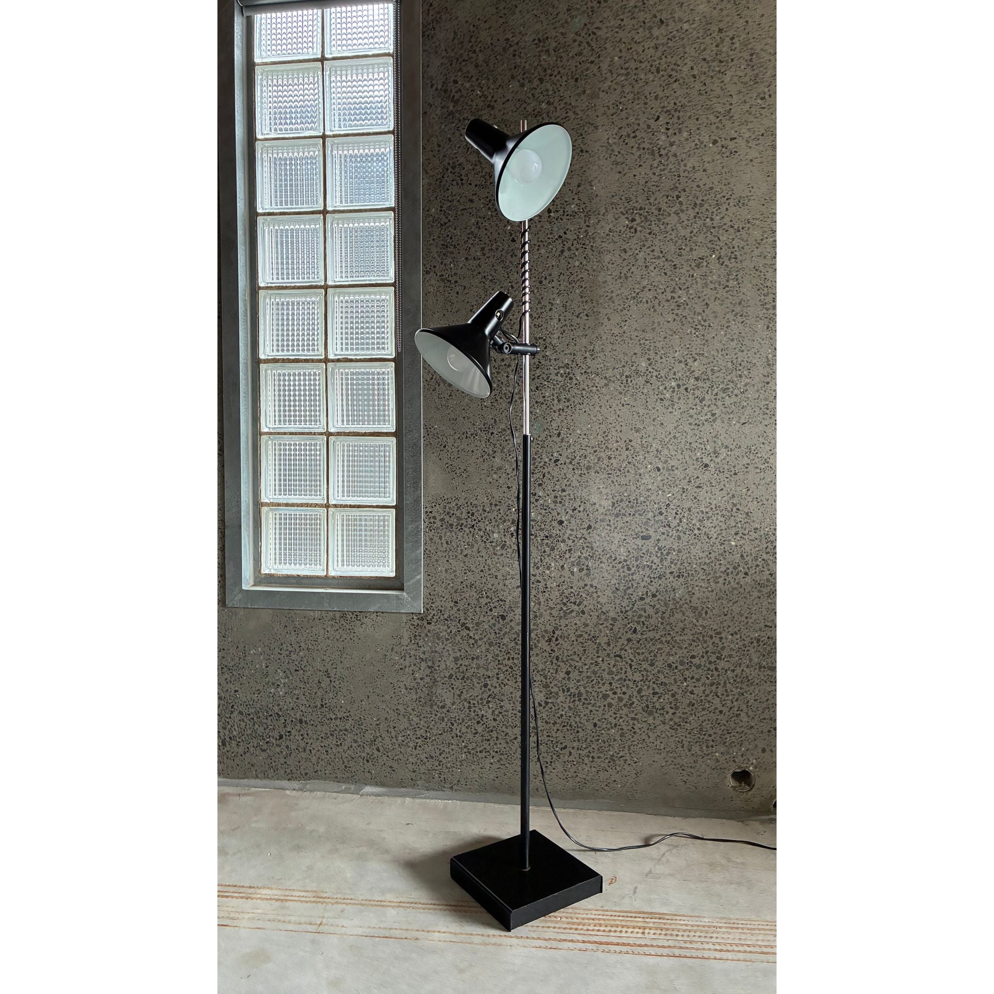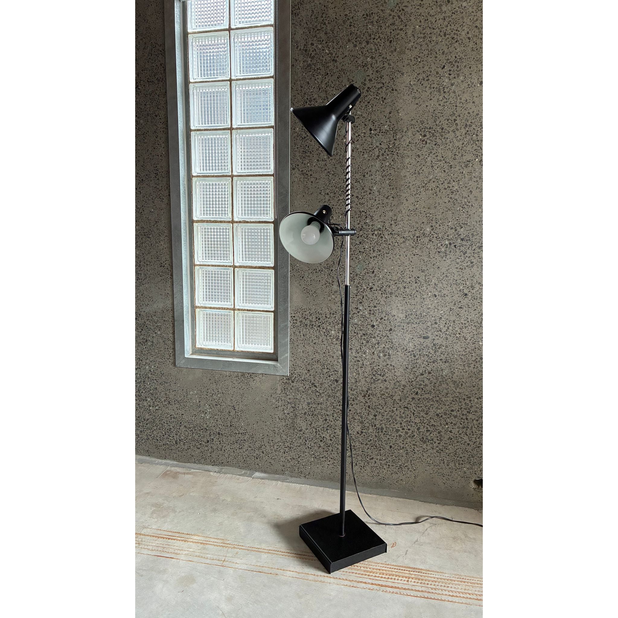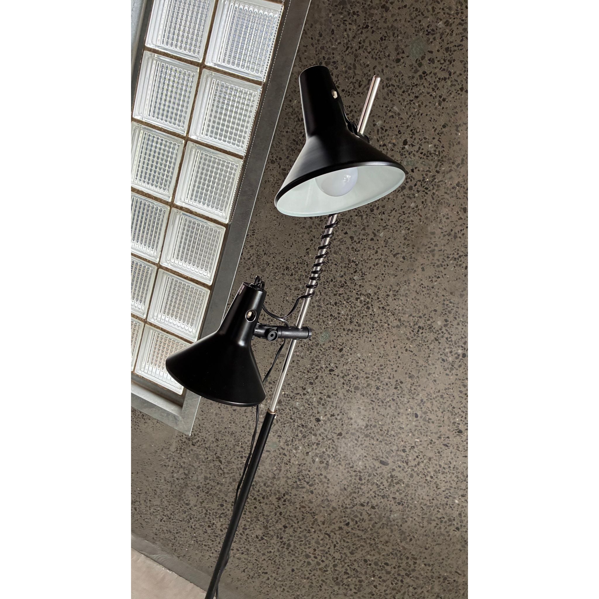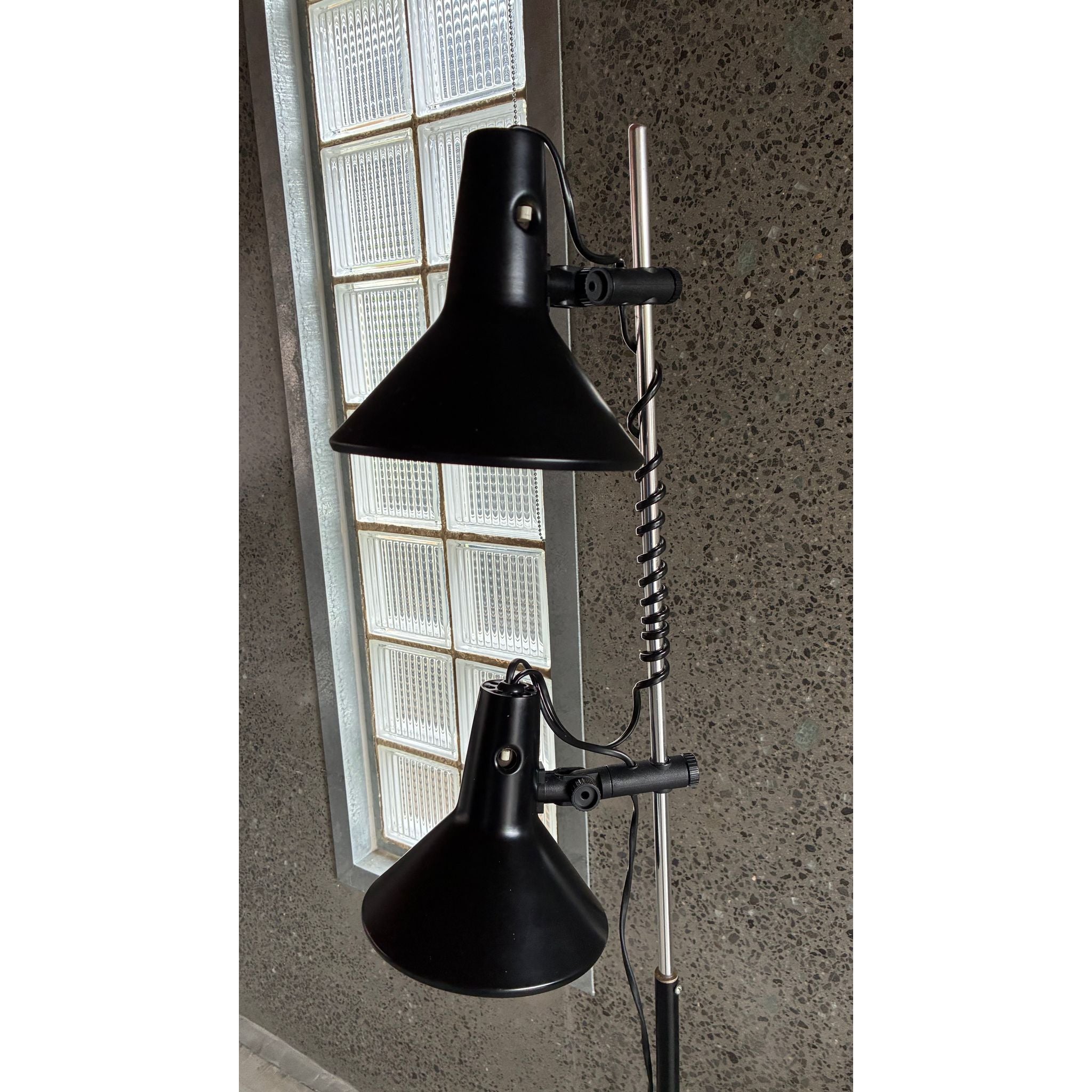 This example features two origional spun metal shades, each fully adjustable and mounted on the signature spring-wrapped chrome stem, allowing the light to be directed exactly where needed. The black enamel finish, square weighted base and clean vertical profile give the lamp a quiet sculptural presence - equally suited to a reading corner, studio or bedside.