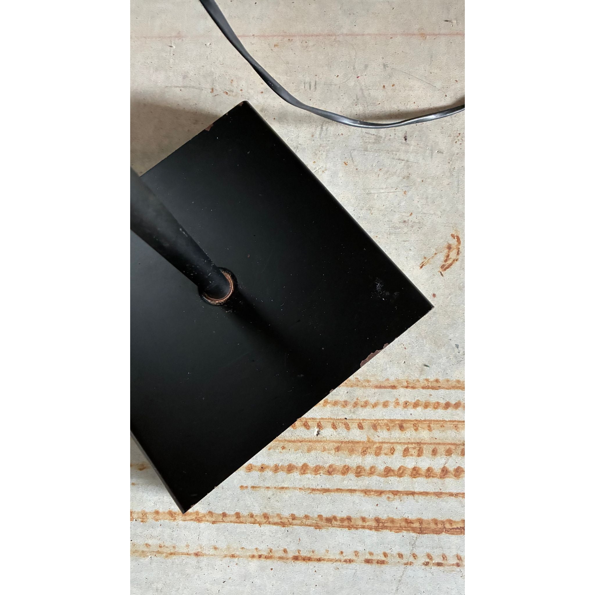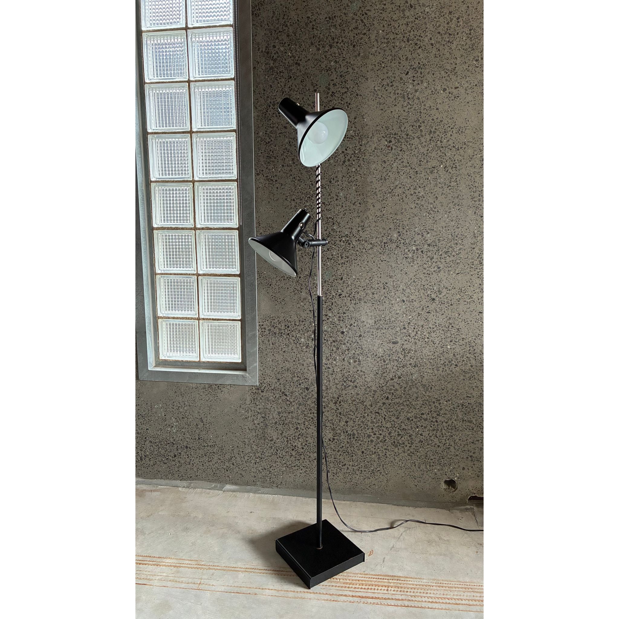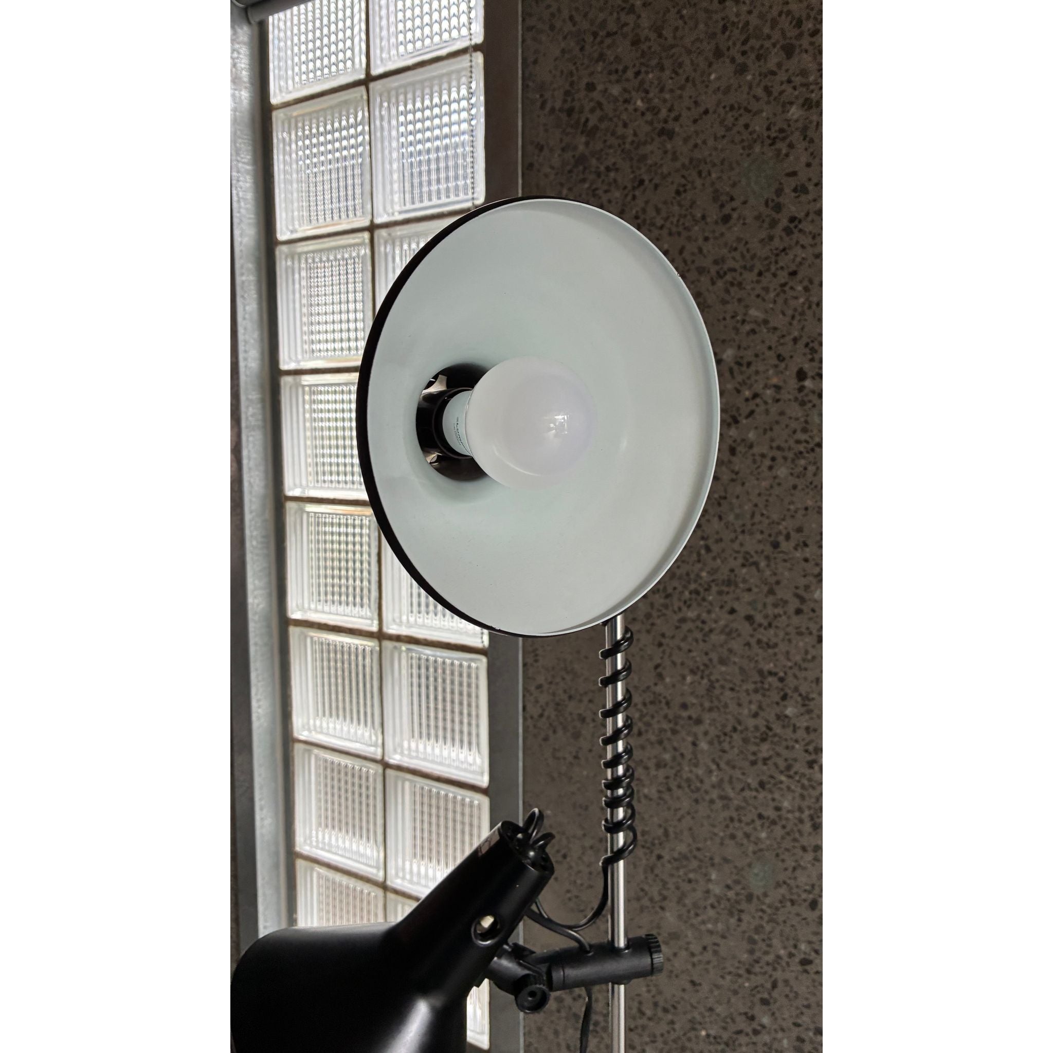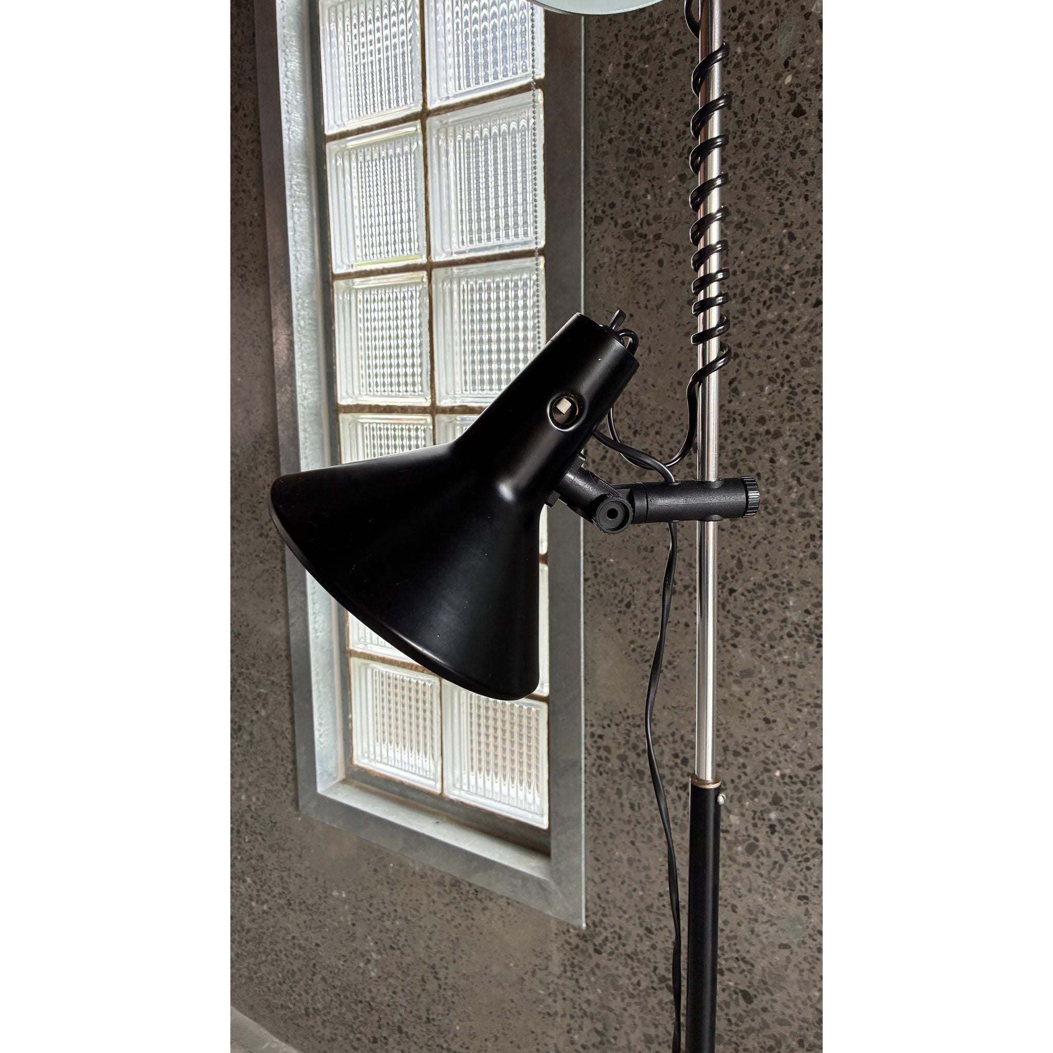 This example features two origional spun metal shades, each fully adjustable and mounted on the signature spring-wrapped chrome stem, allowing the light to be directed exactly where needed. The black enamel finish, square weighted base and clean vertical profile give the lamp a quiet sculptural presence - equally suited to a reading corner, studio or bedside.