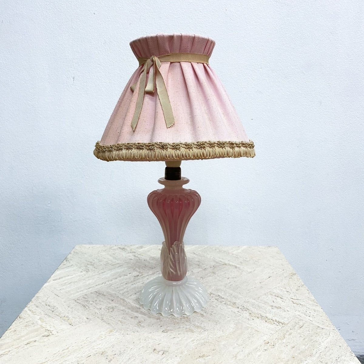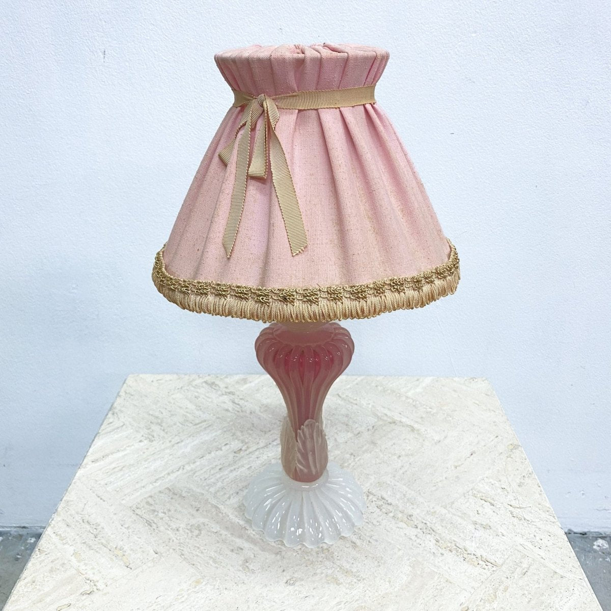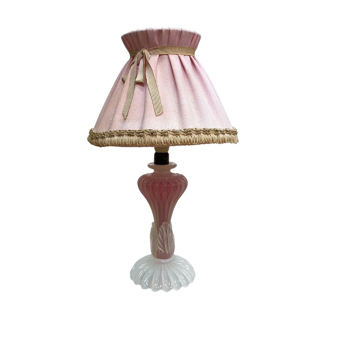 Gorgeous vintage 1960s Murano pink and white art glass table lamp with original pale pink pleated lamp shade. In great original condition with some signs of use, mainly on the shade, commensurate with age.