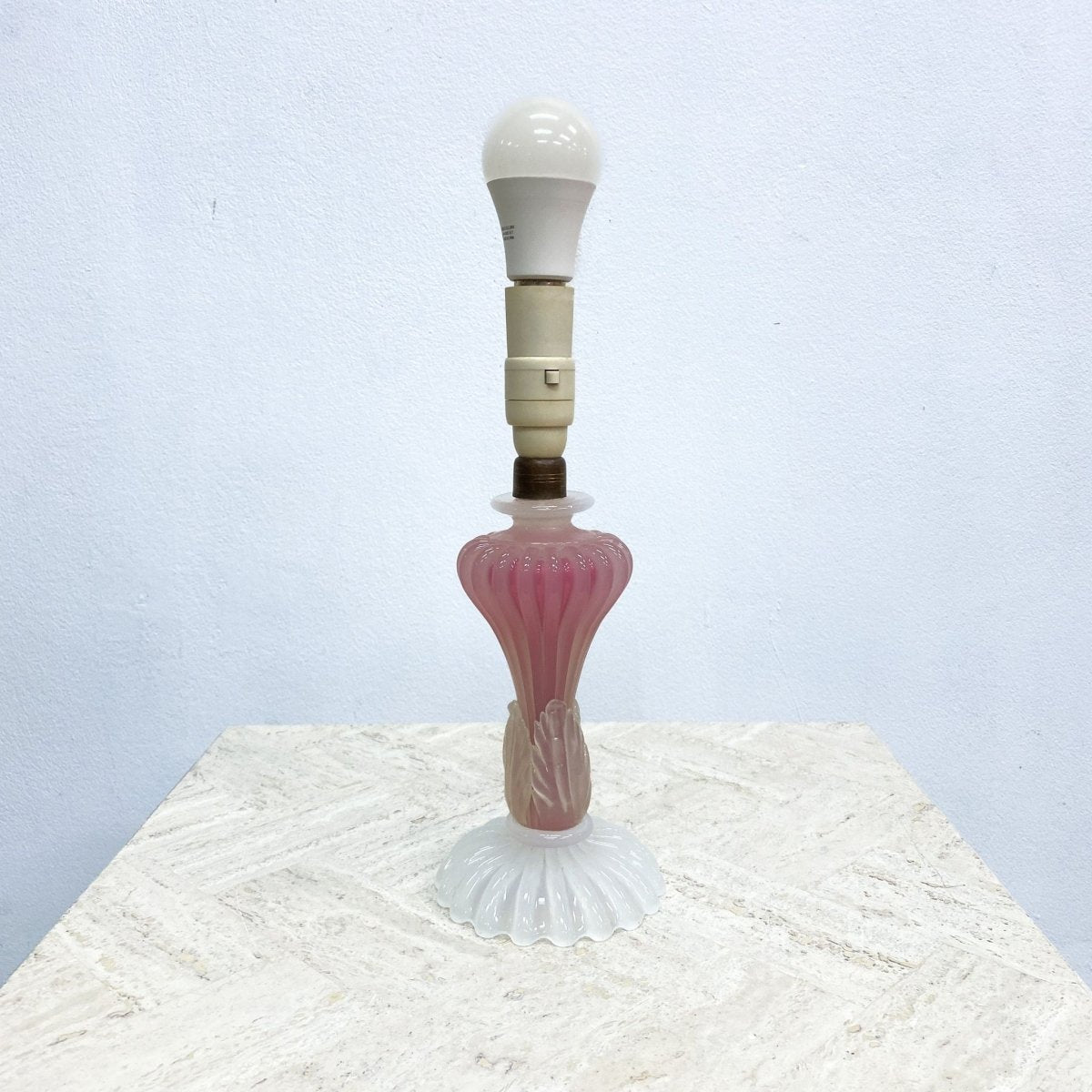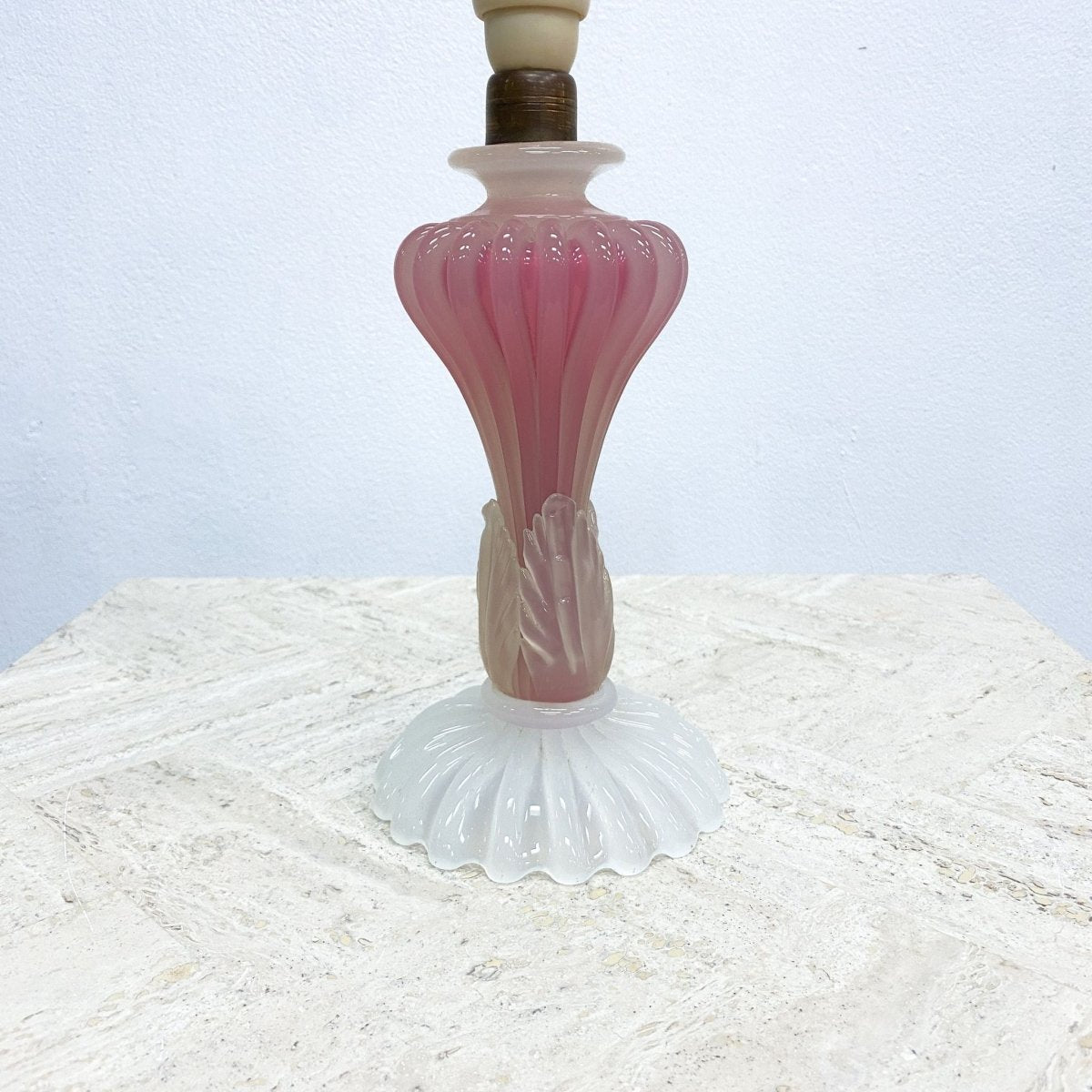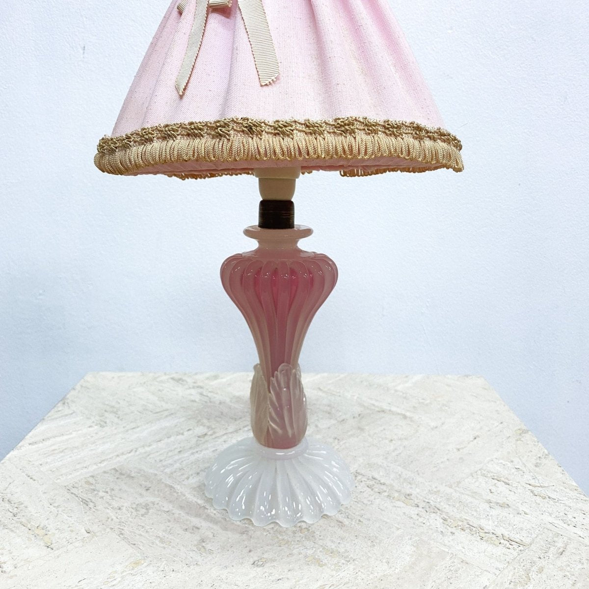 Gorgeous vintage 1960s Murano pink and white art glass table lamp with original pale pink pleated lamp shade. In great original condition with some signs of use, mainly on the shade, commensurate with age.