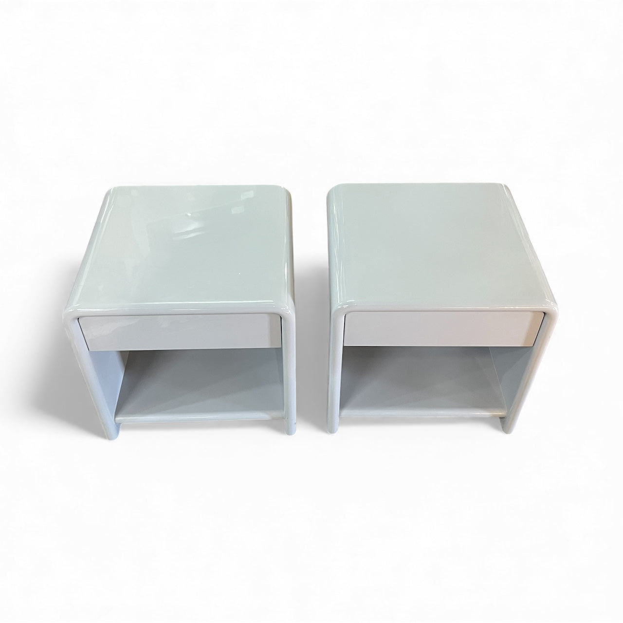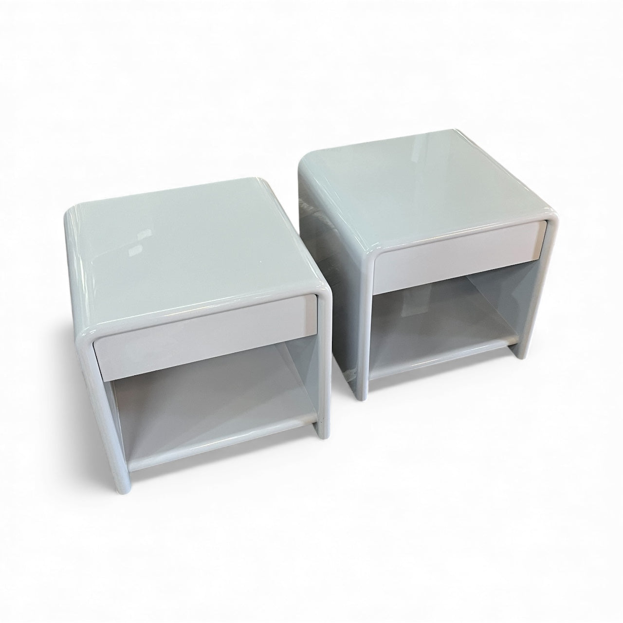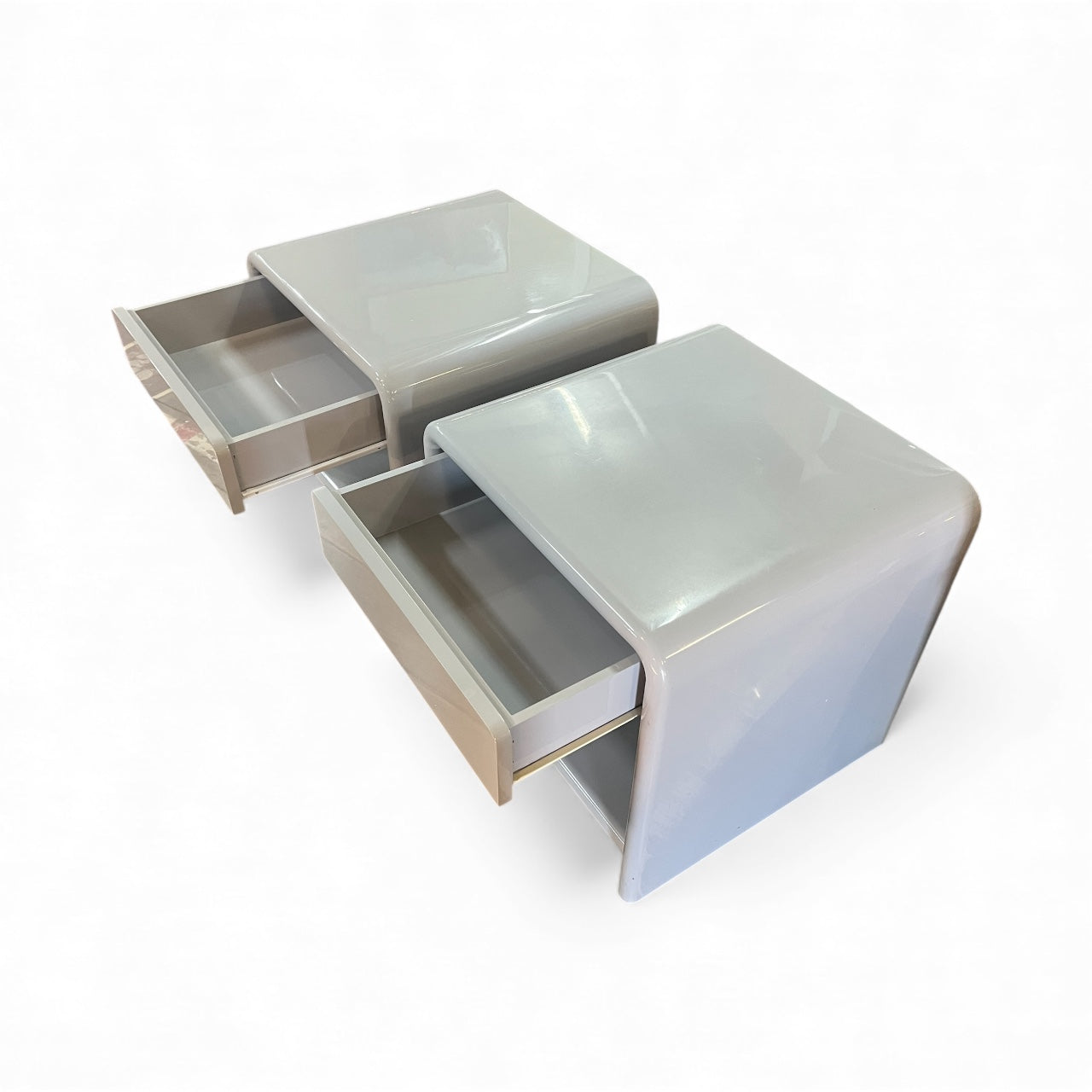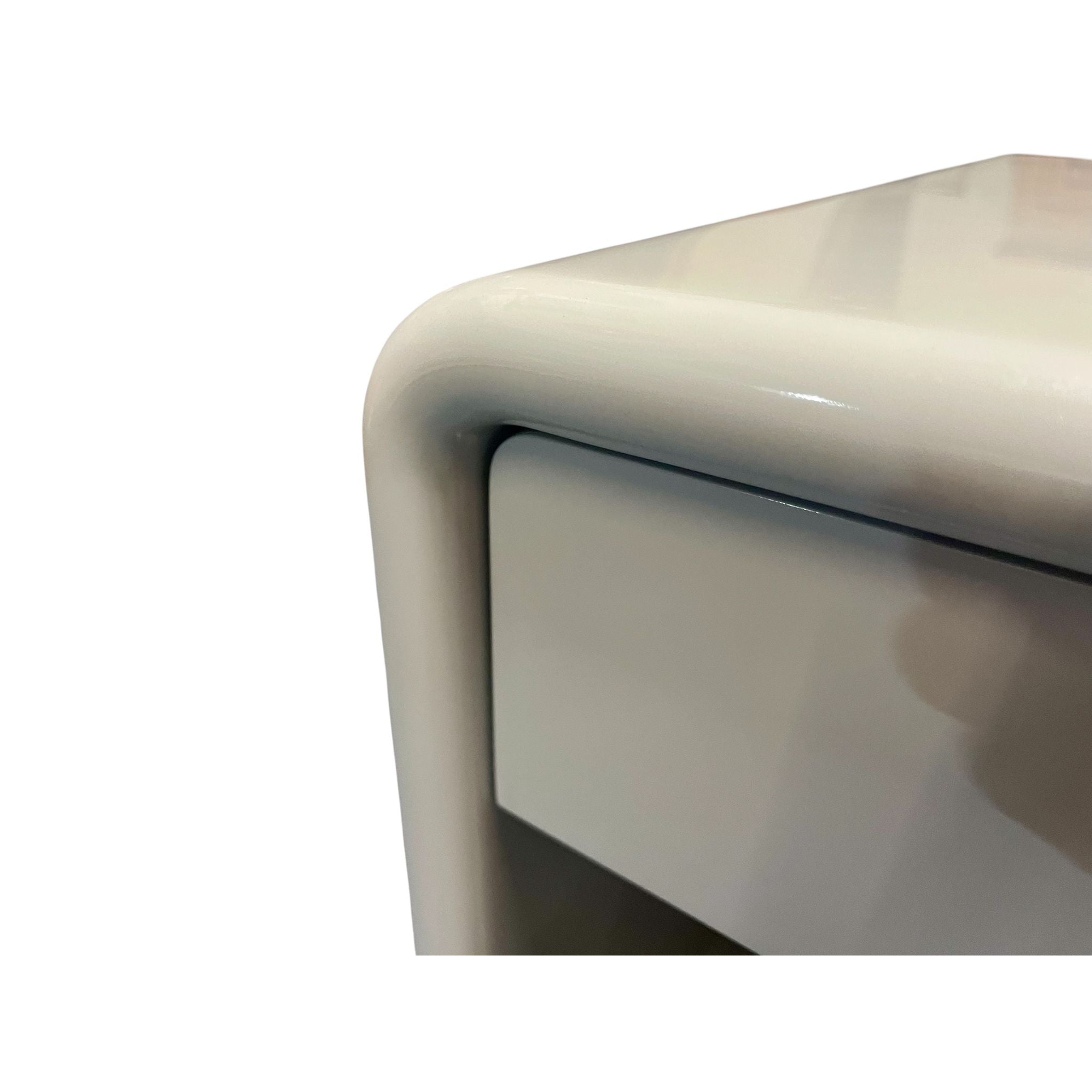 Vintage Bauhaus bedside shelf and drawers mid-century modern pair 1980's. Solid MDF 1 one bedside drawer and shelf with curved top, Bauhaus and Art Deco style. Rounded edges. Freestanding. Two pack high grey gloss finish. Mid-century modern style. Sourced within the Mornington Peninsula.