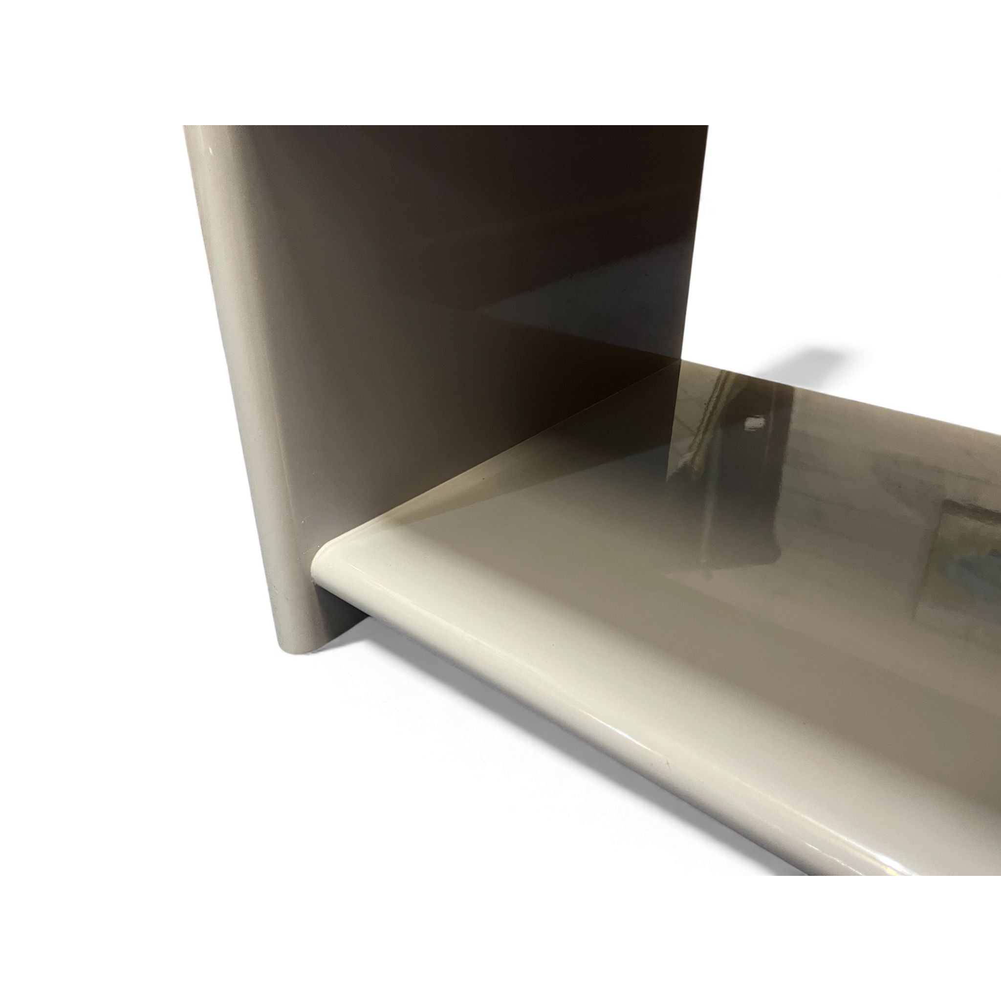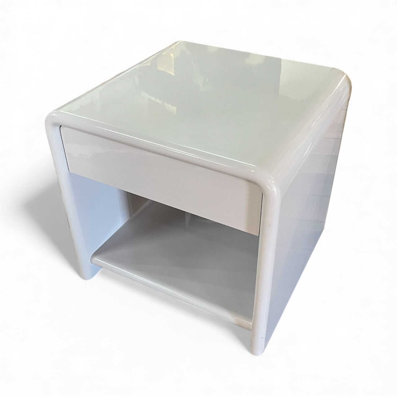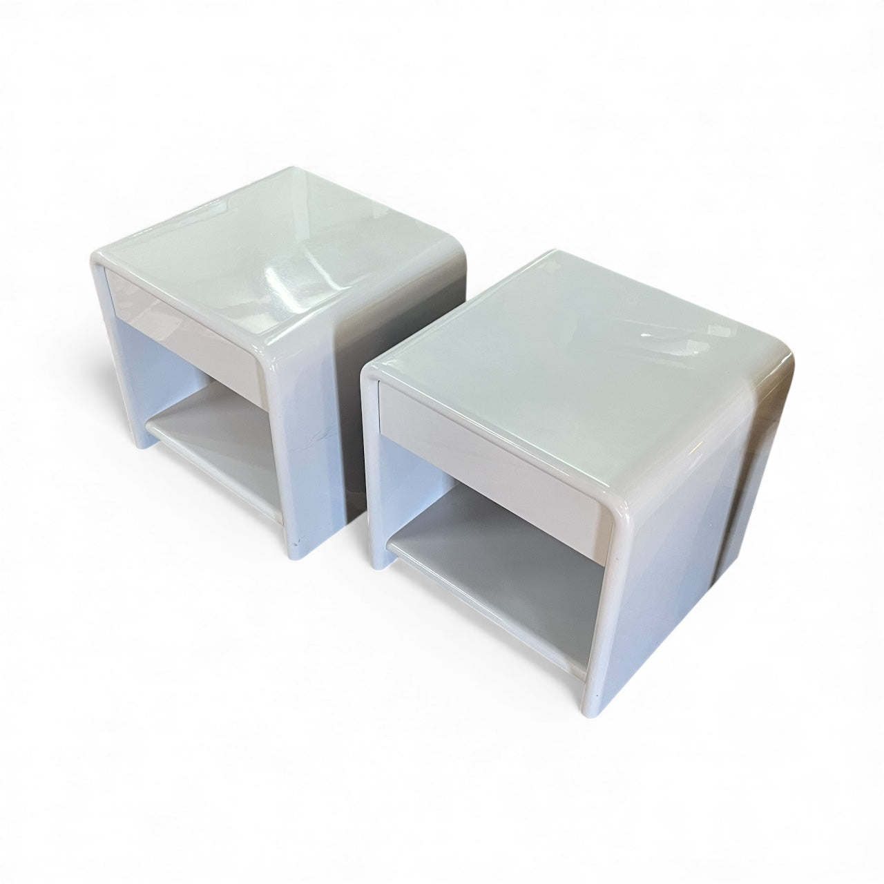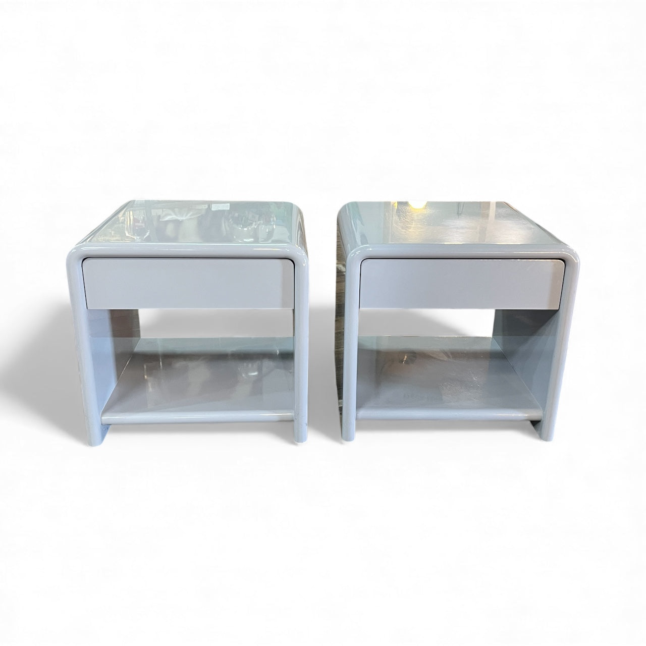 Vintage Bauhaus bedside shelf and drawers mid-century modern pair 1980's. Solid MDF 1 one bedside drawer and shelf with curved top, Bauhaus and Art Deco style. Rounded edges. Freestanding. Two pack high grey gloss finish. Mid-century modern style. Sourced within the Mornington Peninsula.