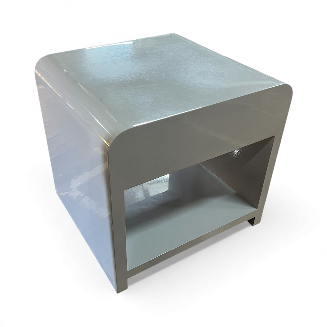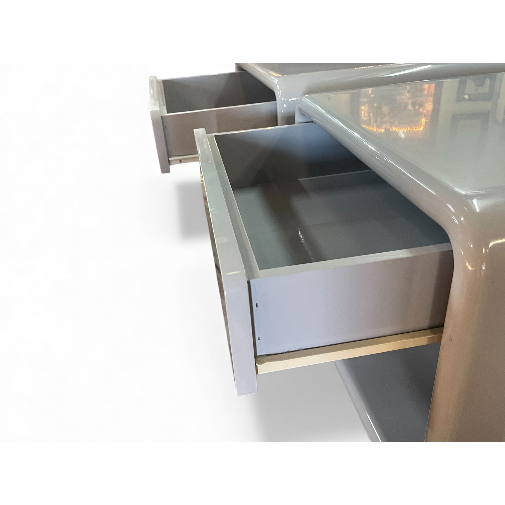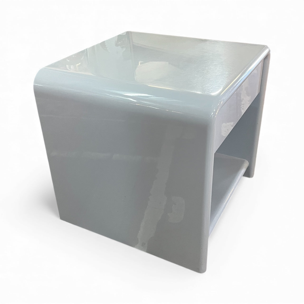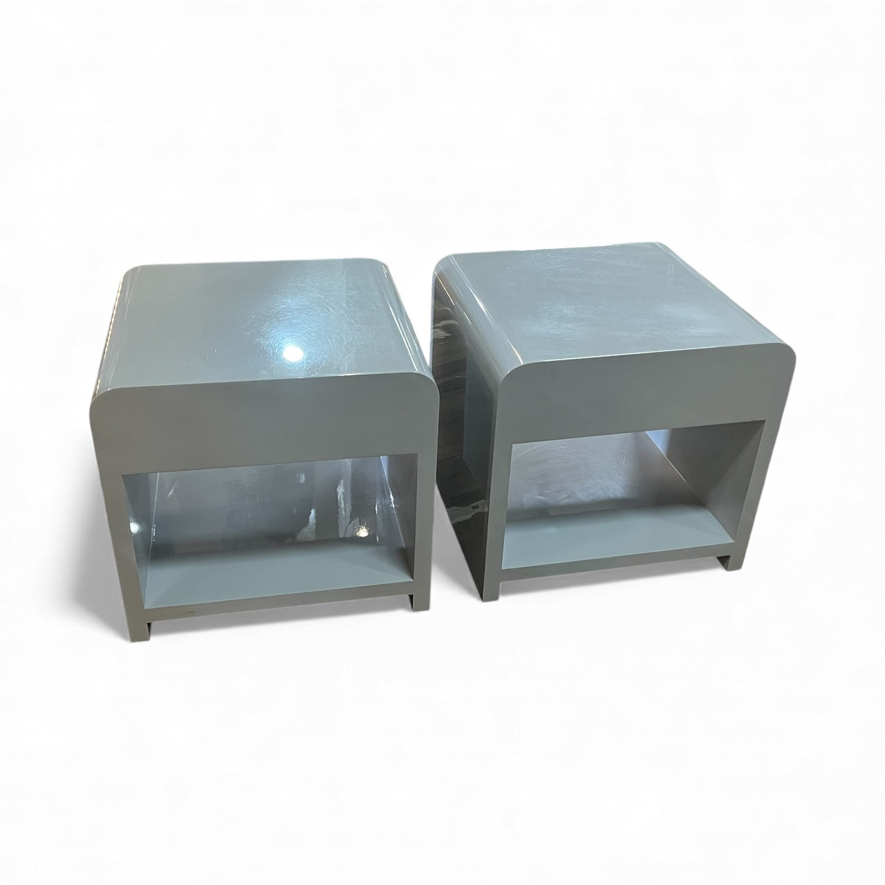 Vintage Bauhaus bedside shelf and drawers mid-century modern pair 1980's. Solid MDF 1 one bedside drawer and shelf with curved top, Bauhaus and Art Deco style. Rounded edges. Freestanding. Two pack high grey gloss finish. Mid-century modern style. Sourced within the Mornington Peninsula.