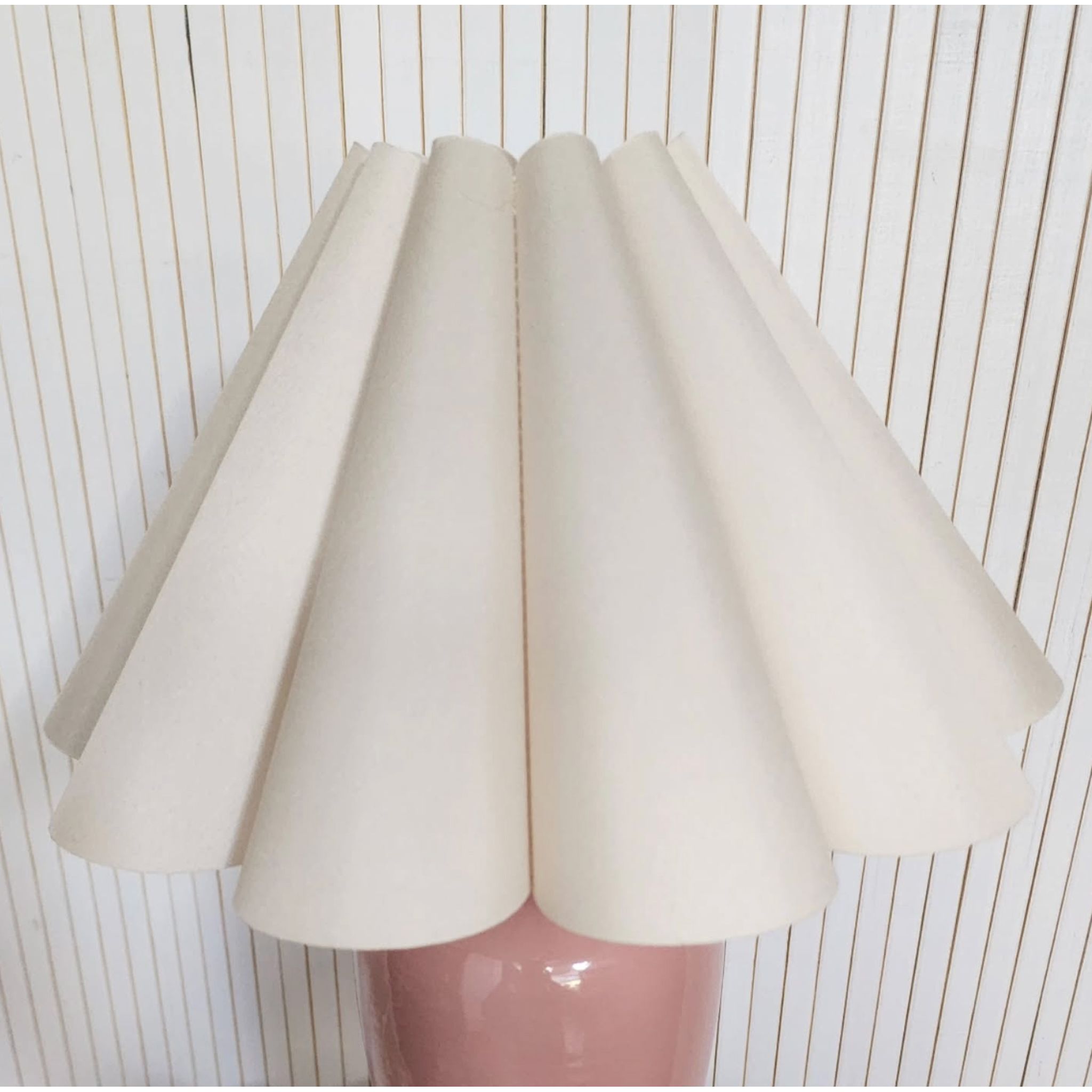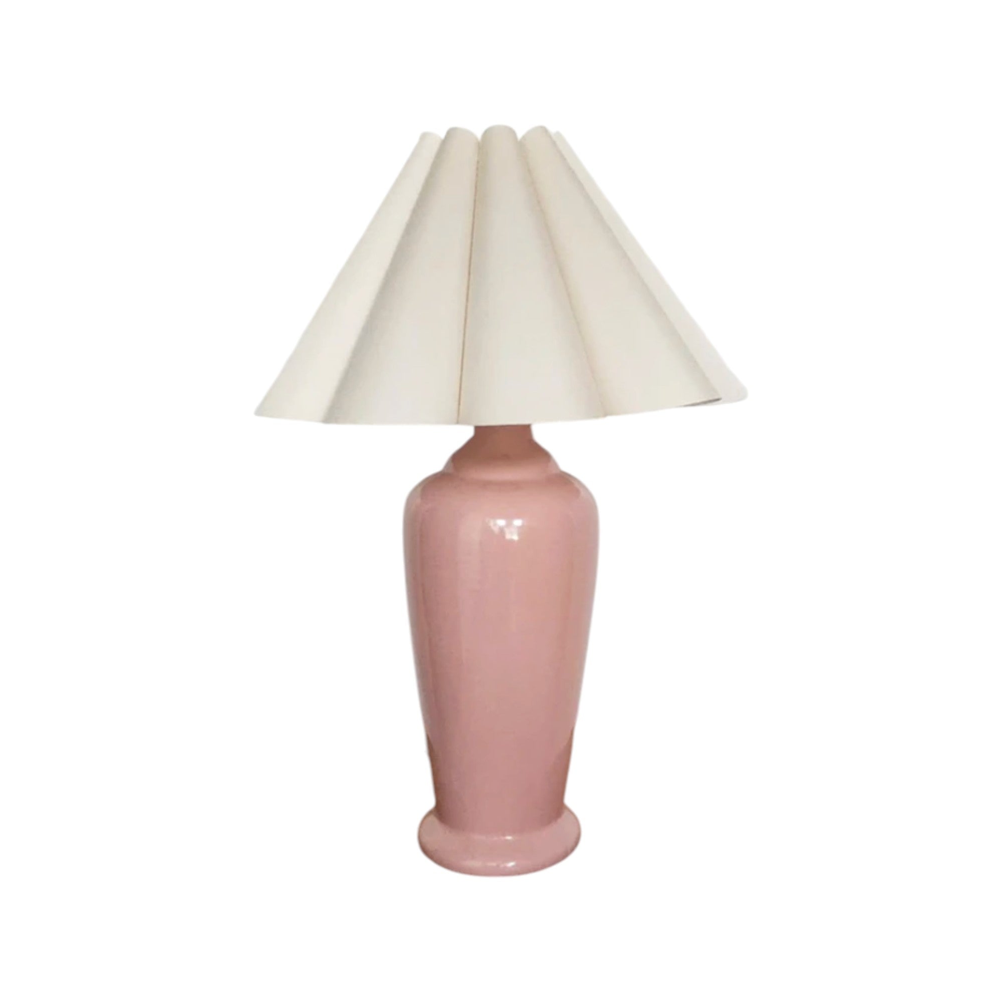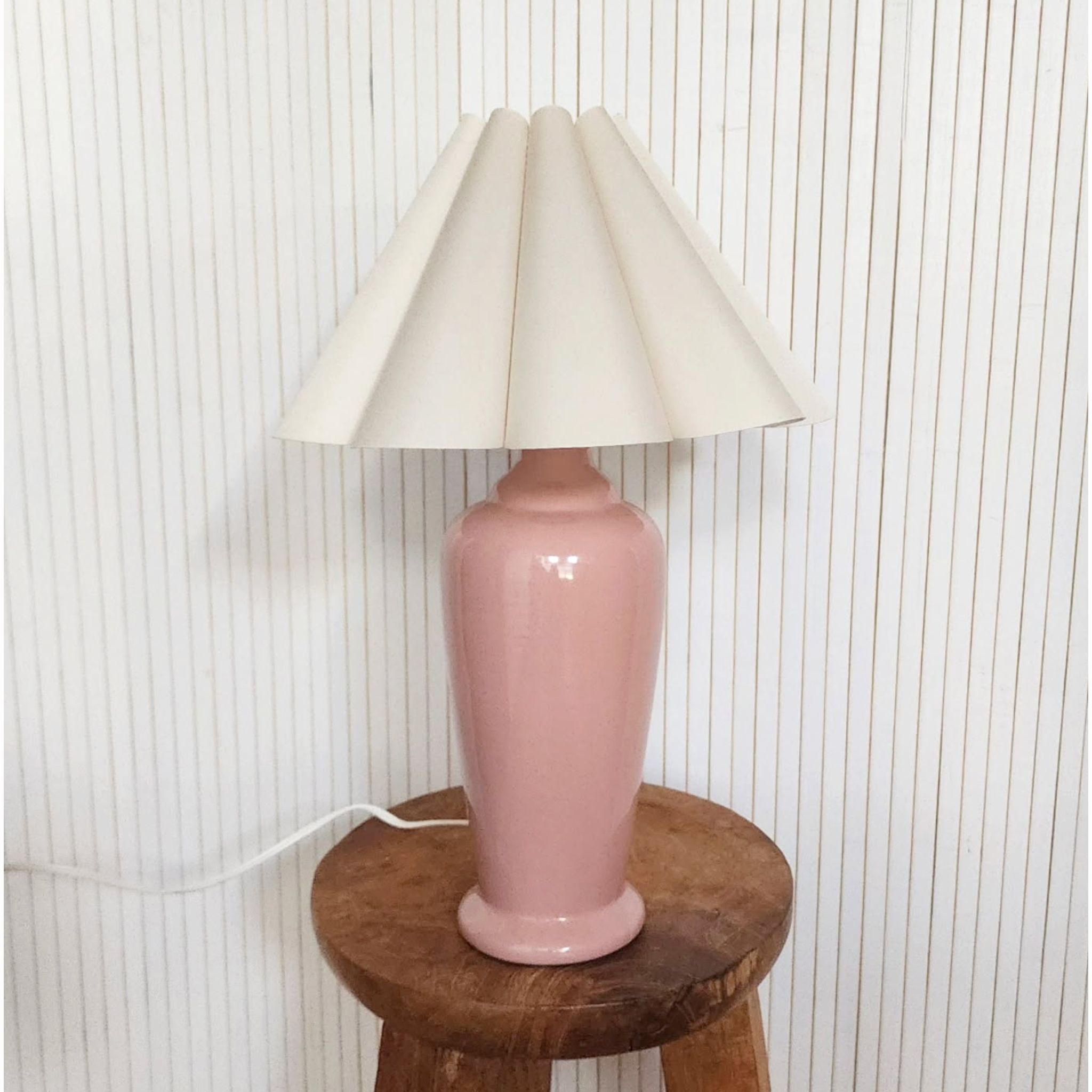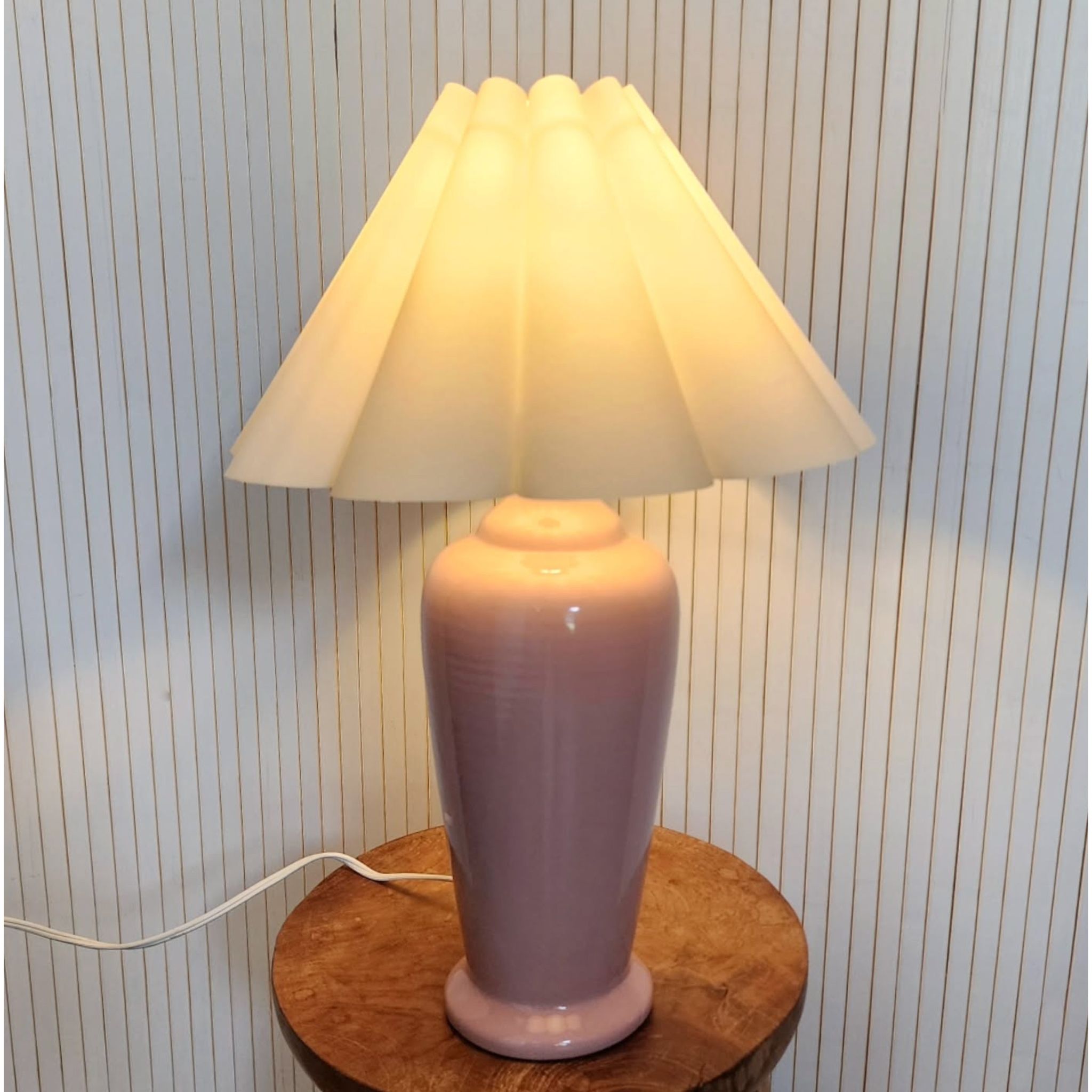 Vintage pink ceramic lamp base, completed with new creamy tulip pleated lampshade. Base is in great condition.