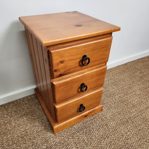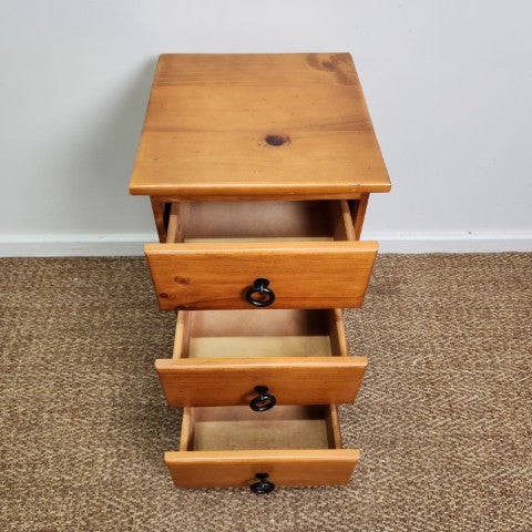 This vintage timber bedside features a simple three-drawer design with clean, classic lines. The natural timber finish highlights the grain and gives the piece a warm, understated character.