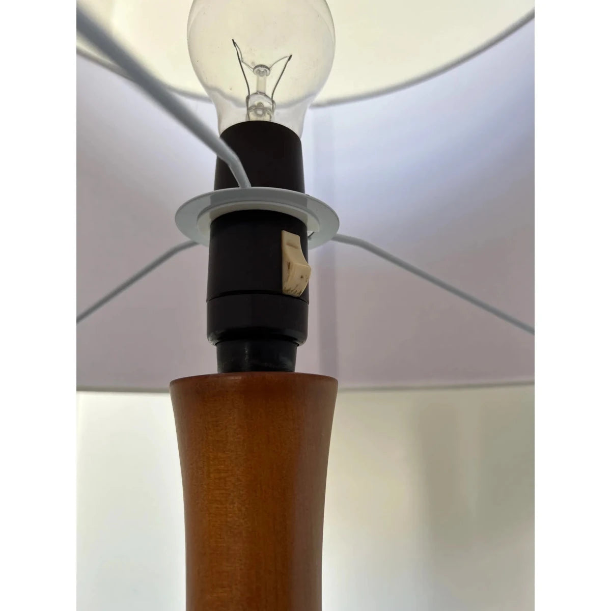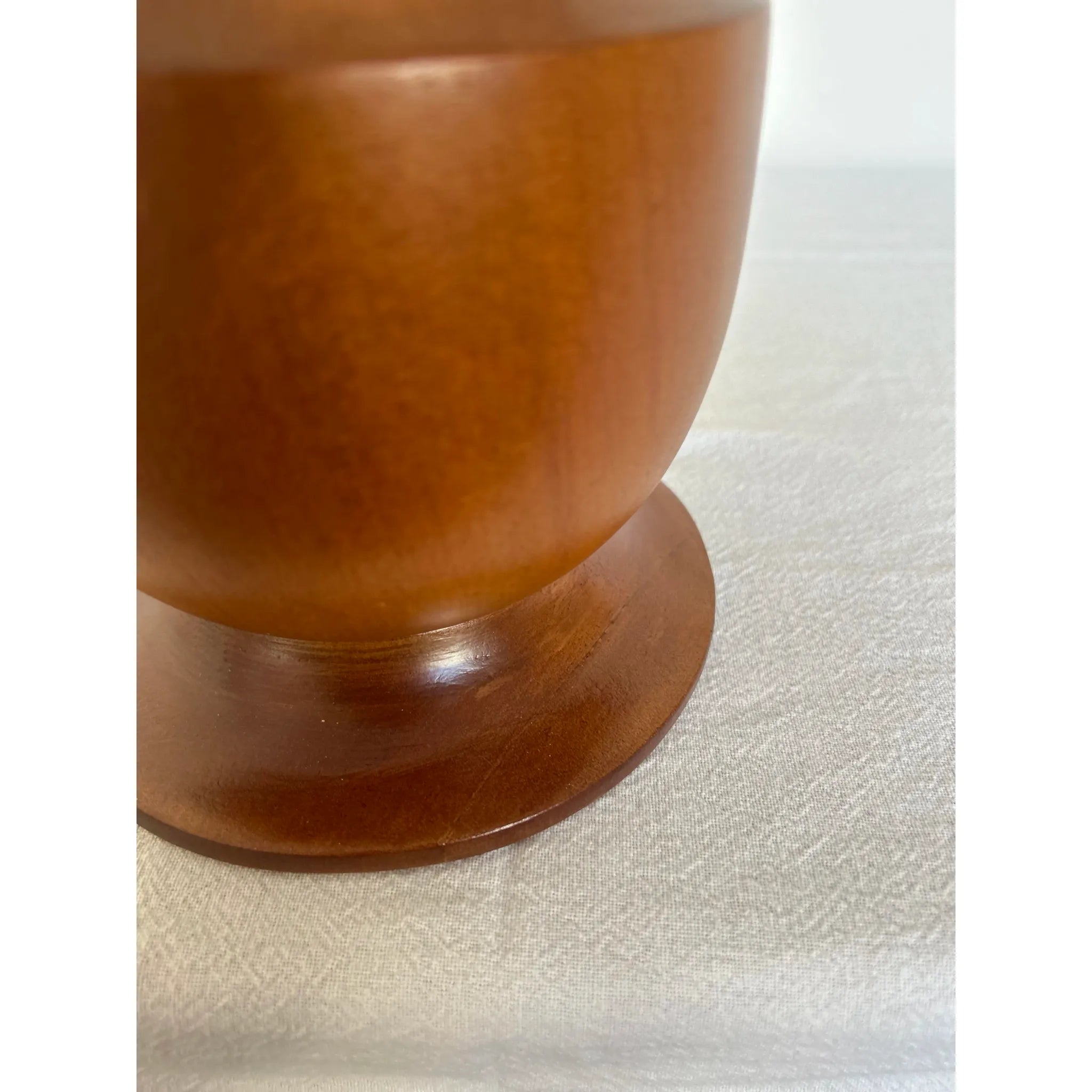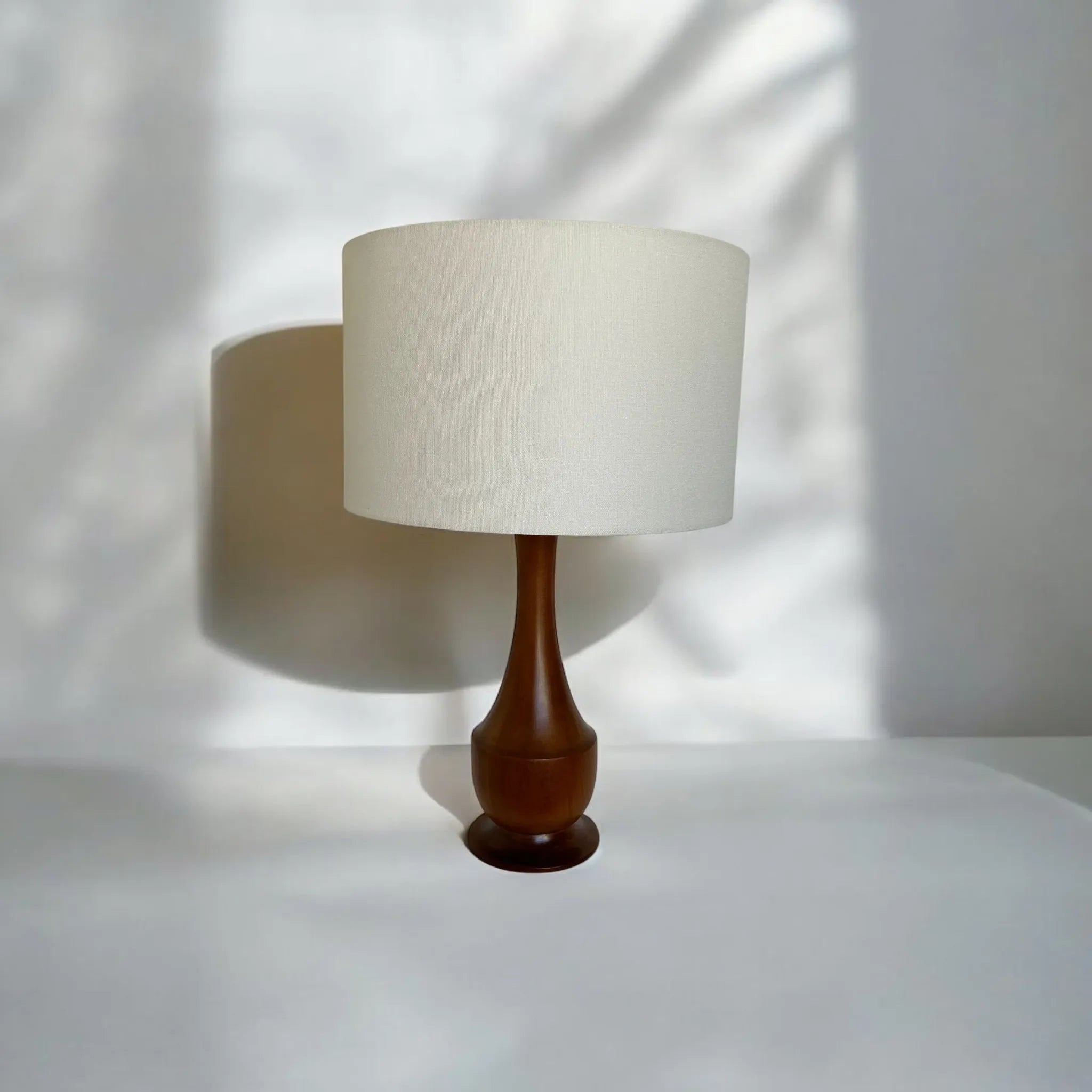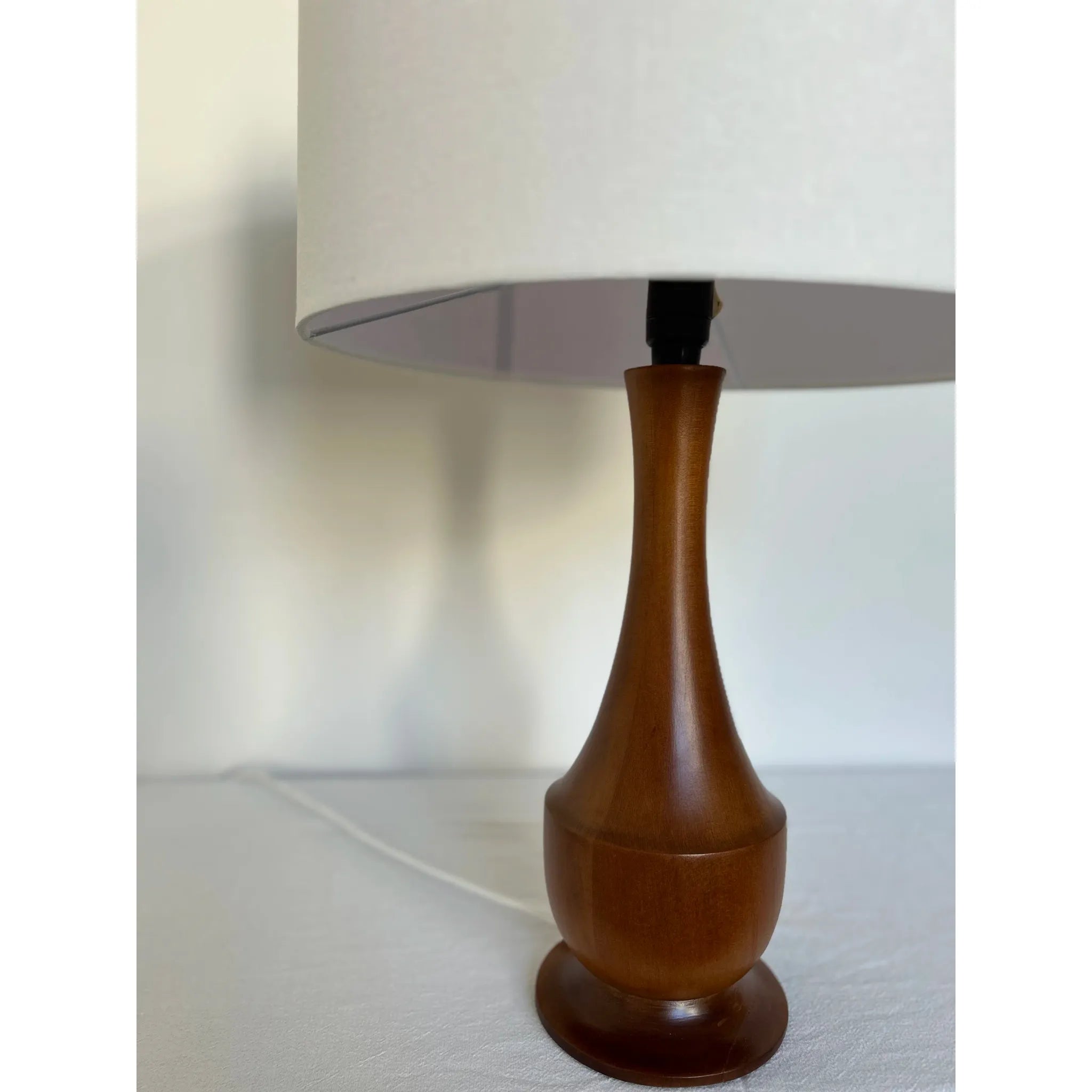 This vintage timber table lamp will make the perfect addition to any interior space. With a lovely sculptured timber base and all new linen shade, this vintage lamp has been reinvented for a modern world. The lamp base has been fully restored after there were some minor breaks and joint expansion issues however, now that the base is finished in a teak coloured polish, these markings are less visible. The lamp has been rewired to meet Australian standards and requires a bayonet bulb. Sourced in Sydney, no maker’s marks found.