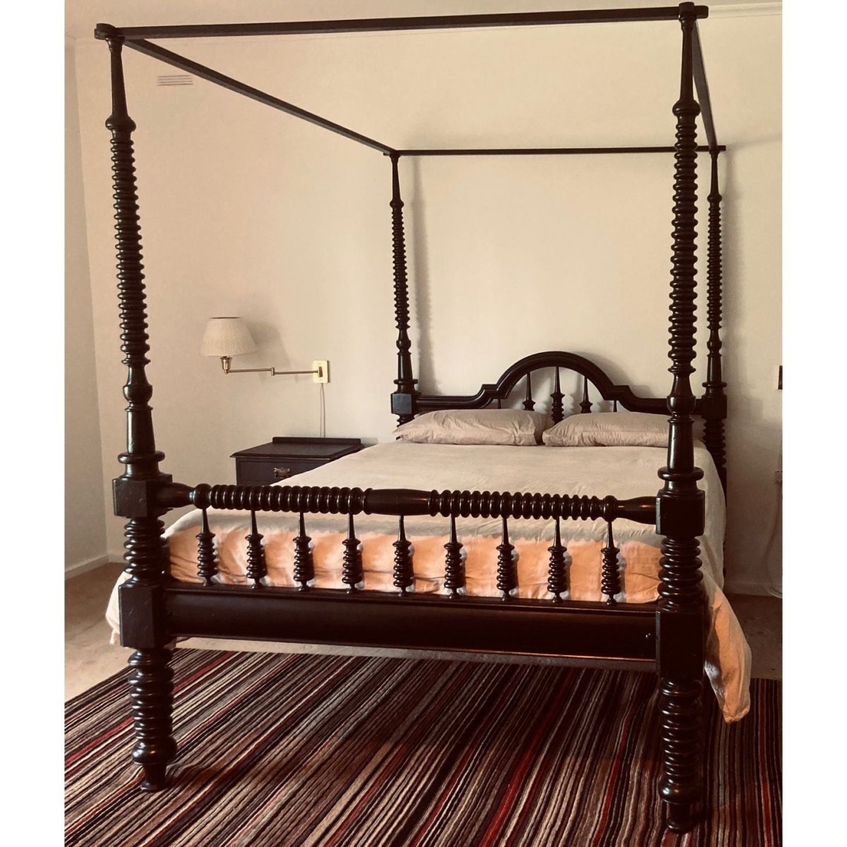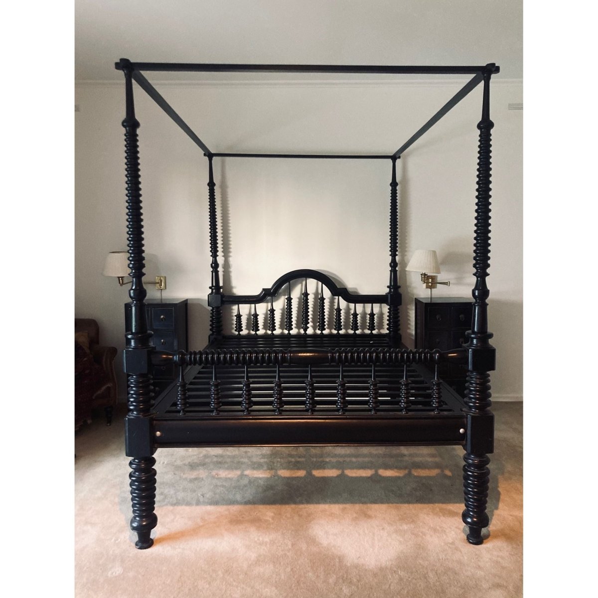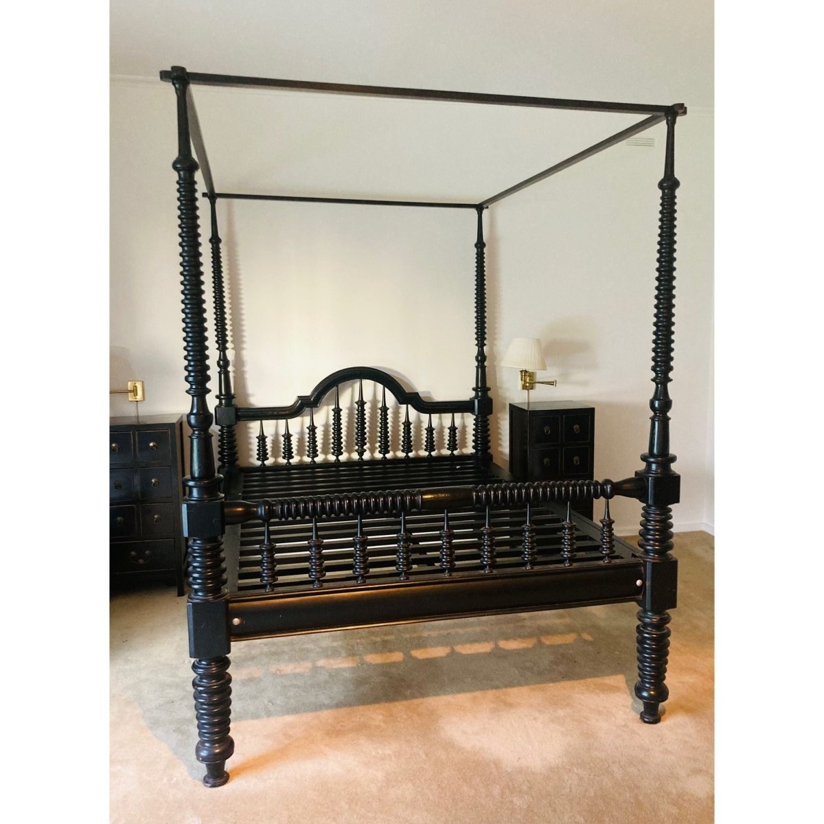 Amazing solid ebonised teak 4-poster canopy bed from India or Malaysia c1900 - standard queen size (as new low profile memory foam mattress included). Can be disassembled for transport. Very good condition - some chips to paint/wood consistent with age.