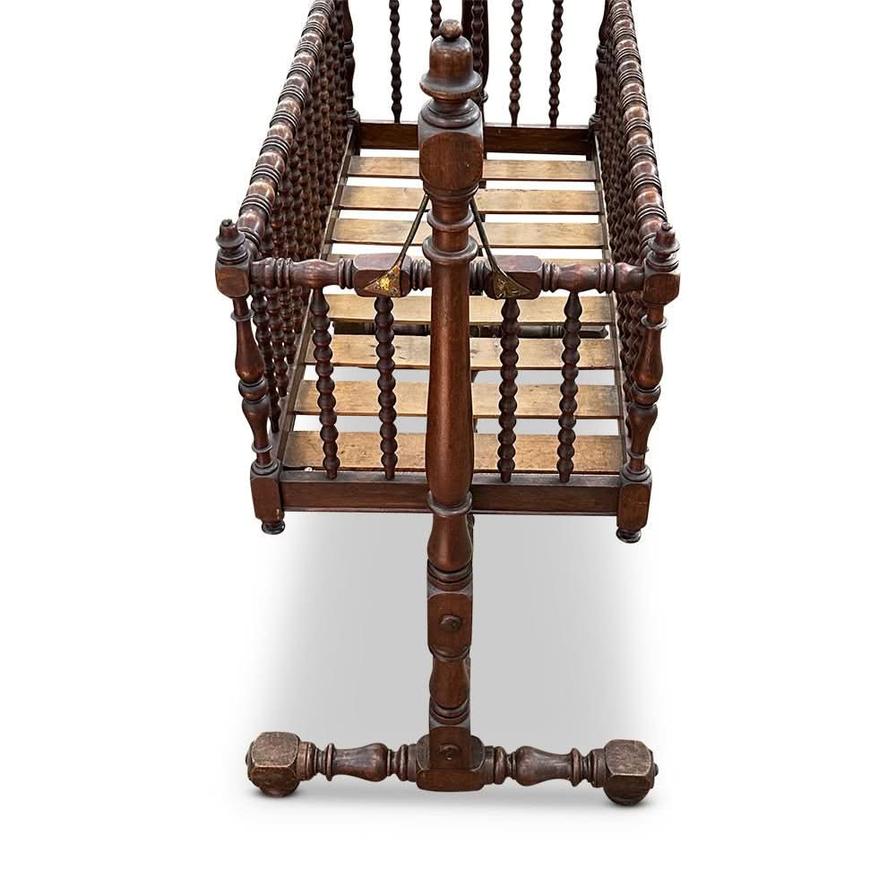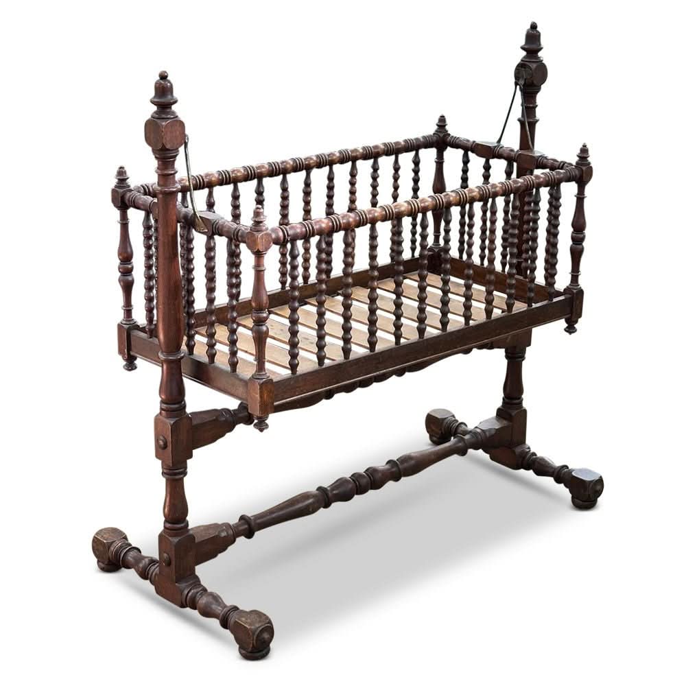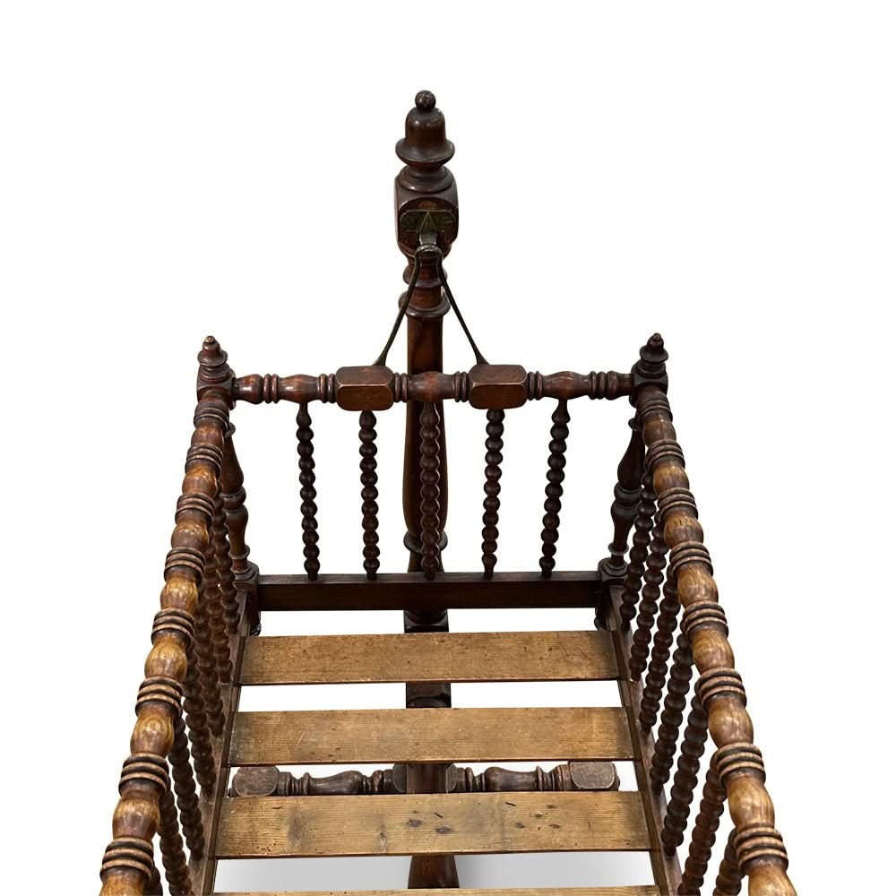 This cradle features beautifully turned sides and base and crowning finials to the ends. It is on castors for ease of movement and can swing gently to encourage baby off to sleep!
