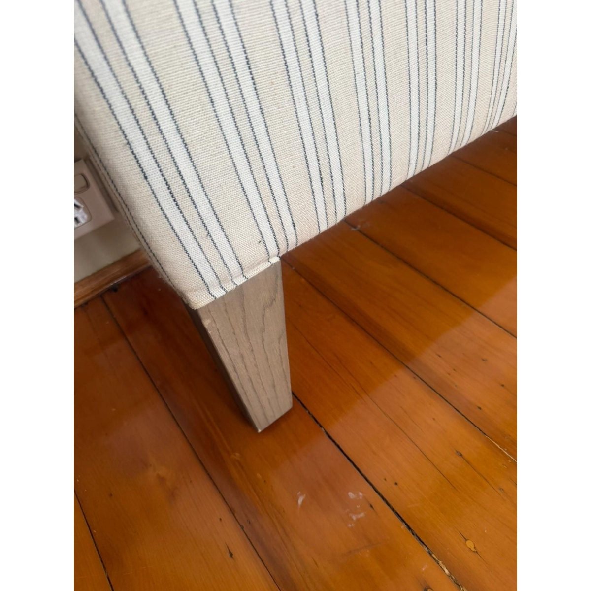 Purchased originally from Provincial Home Living, never used as new Queen size bedhead. The Arcadia Bedhead is a stylish blend of comfort and elegance. Supported by sturdy oak legs, it features subtle, striped linen upholstery for a touch of sophistication. Thoughtfully designed, the bedhead offers a padded, supportive backdrop for relaxing or reading, making it both functional and stylish. With its quality craftsmanship and versatile appeal, the Arcadia Bedhead is a refined addition to any bedroom.