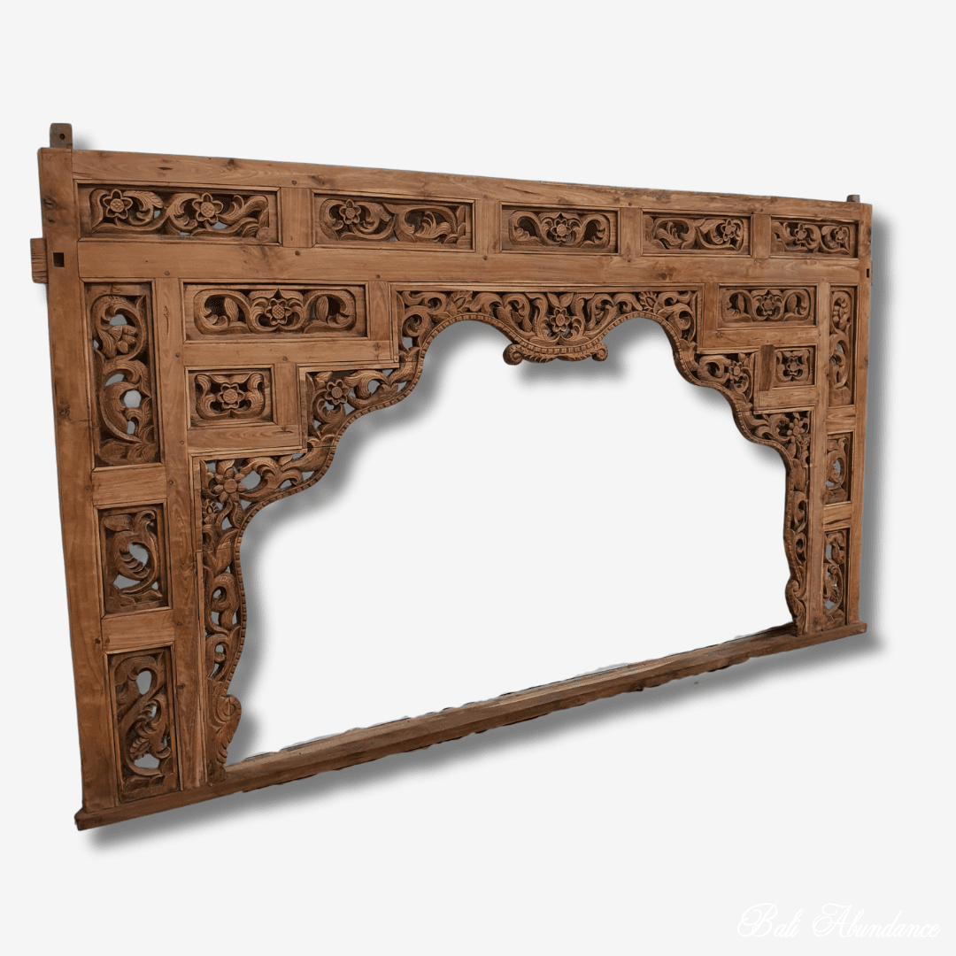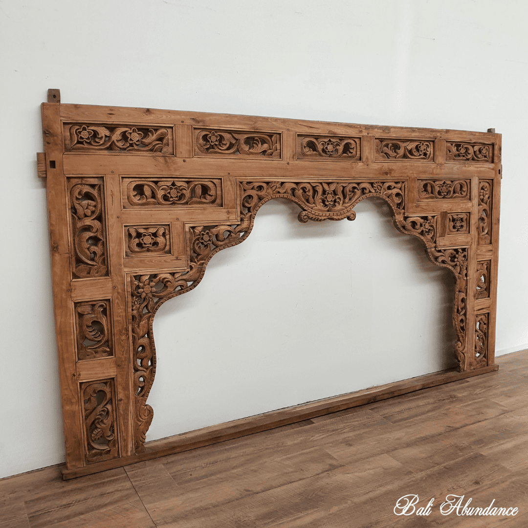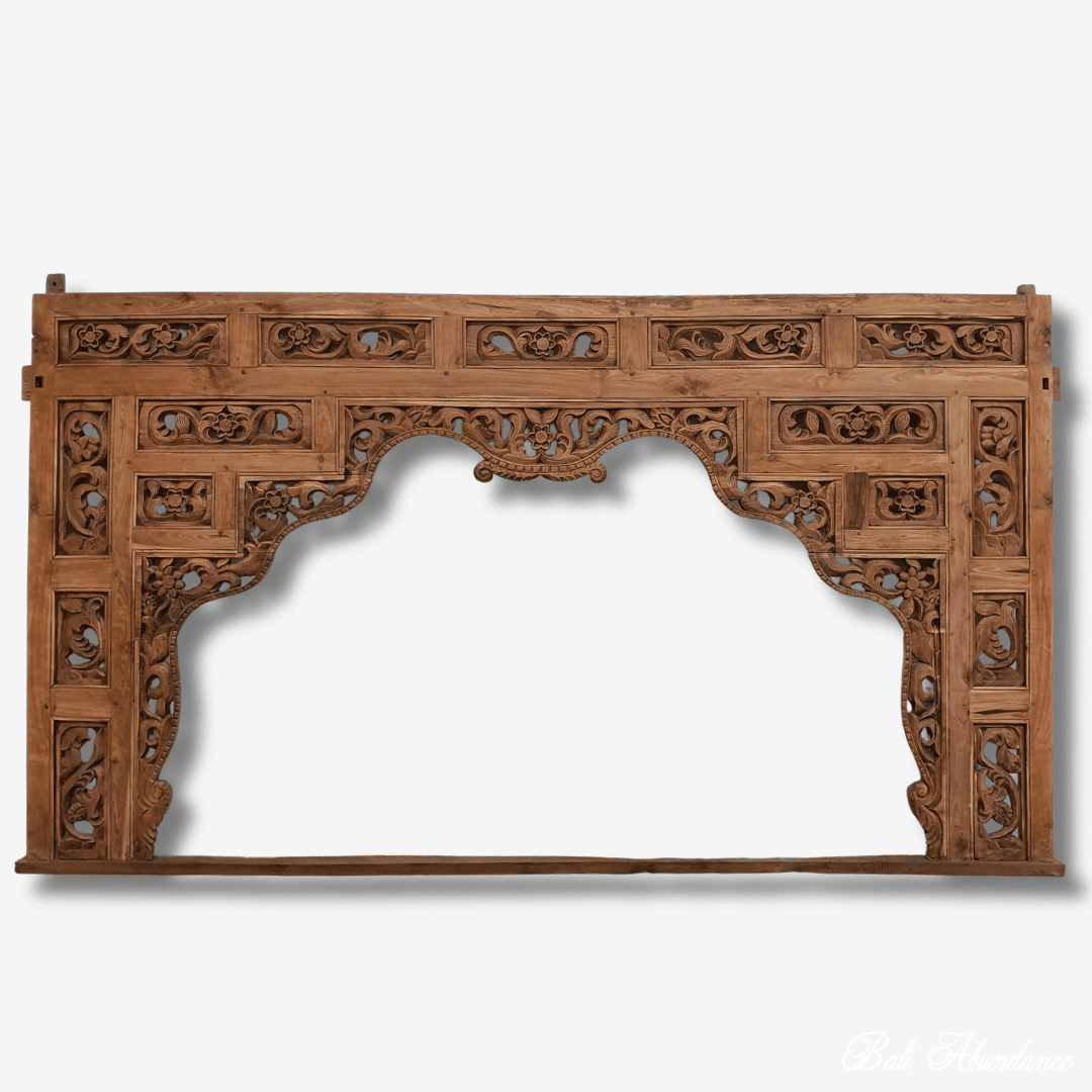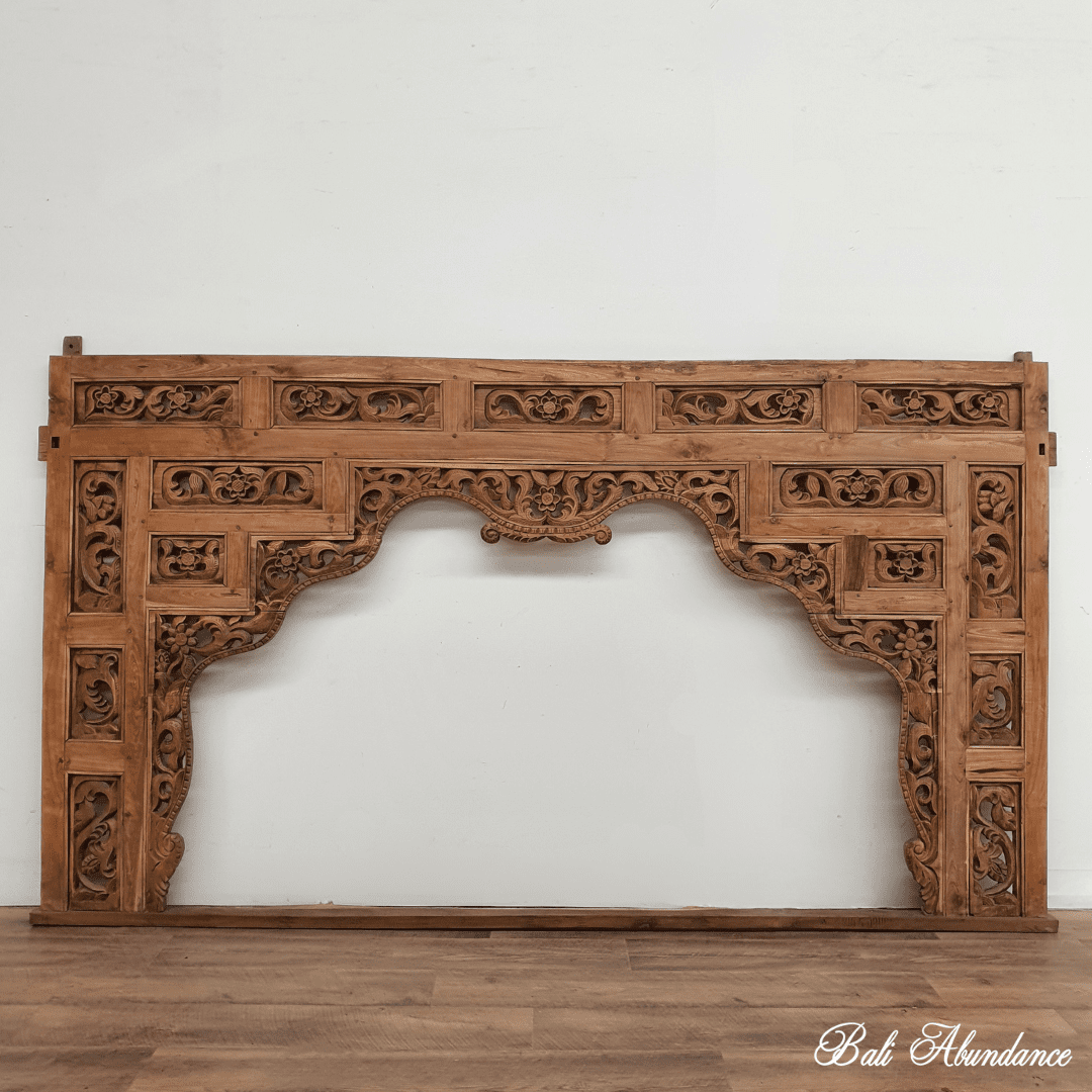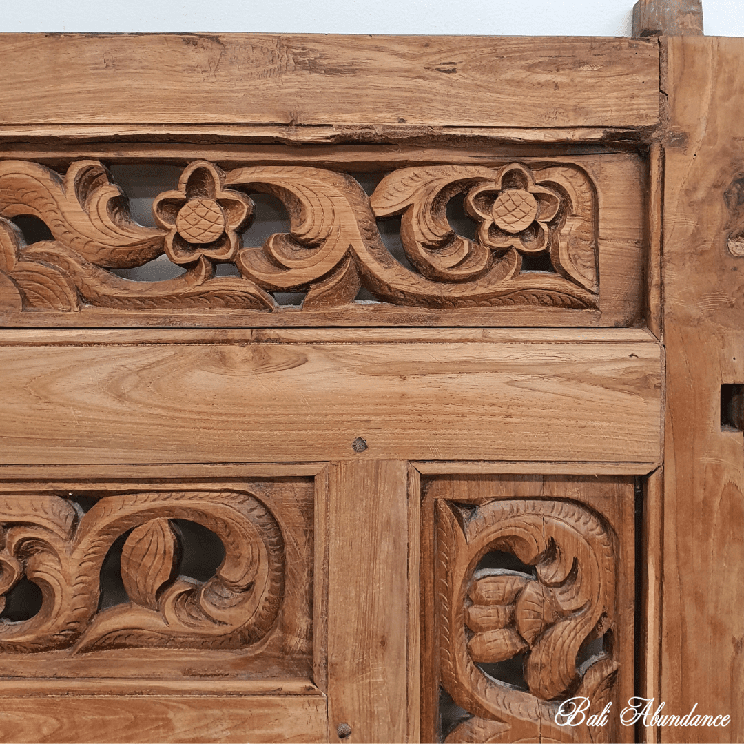 Add character to your home with this exceptional, hand-carved teak wall panel—a genuine vintage treasure from Bali. Each piece showcases intricate original Balinese craftsmanship, featuring detailed carved motifs that reflect the artistry of a bygone era. Carefully refurbished to preserve its authentic patina and heritage, this rare find brings warmth and cultural richness to any interior space. Perfect as a striking bedhead feature or statement wall installation, the natural teak wood develops a beautiful aged character over time. The organic grain patterns and hand-worked details tell the story of its origins, making it a conversation piece that connects your home to Balinese tradition. Whether you're curating a bohemian sanctuary or adding vintage sophistication to modern décor, this timeless panel infuses your space with genuine artisanal charm and enduring elegance.