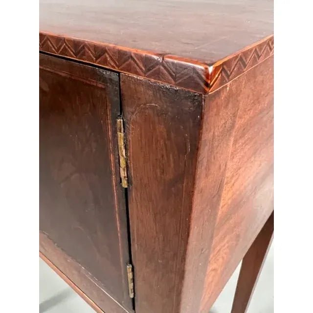 An additional feature is the fine line inlay work to the doors, cupboard, drawer, top surface and the legs.Around the top vertical edge is a charming but most unusual geometric zig zag multiple line inlay.