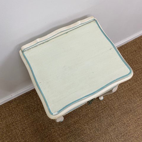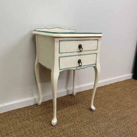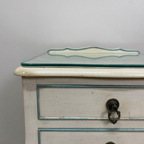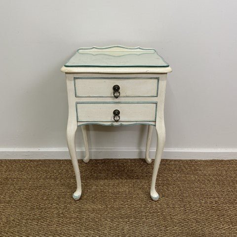 This lovely painted bedside cabinet is finished in white with soft blue accents, featuring long cabriole legs and two drawers. A custom-fit glass top adds a polished detail while preserving the painted surface. Its elegant proportions and classic French styling make it a refined decorative piece for bedrooms or living spaces.