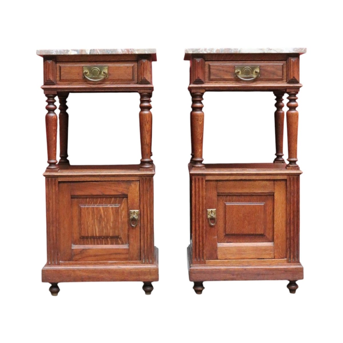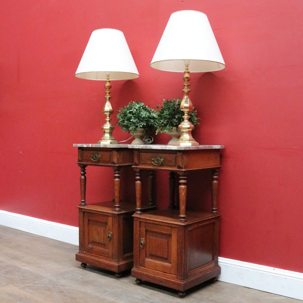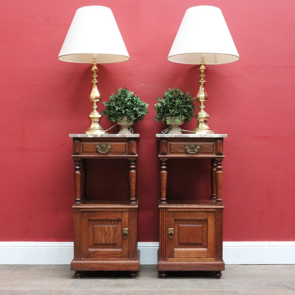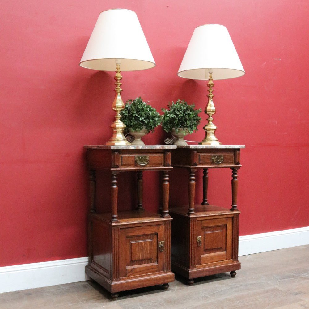 Description: A true pair of French oak bedside cabinets, each with a marble top, brass pull handles and elegant turned tapered supports to the open display area. Below the drawer sits a display shelf, and beneath that a cupboard offering practical storage.