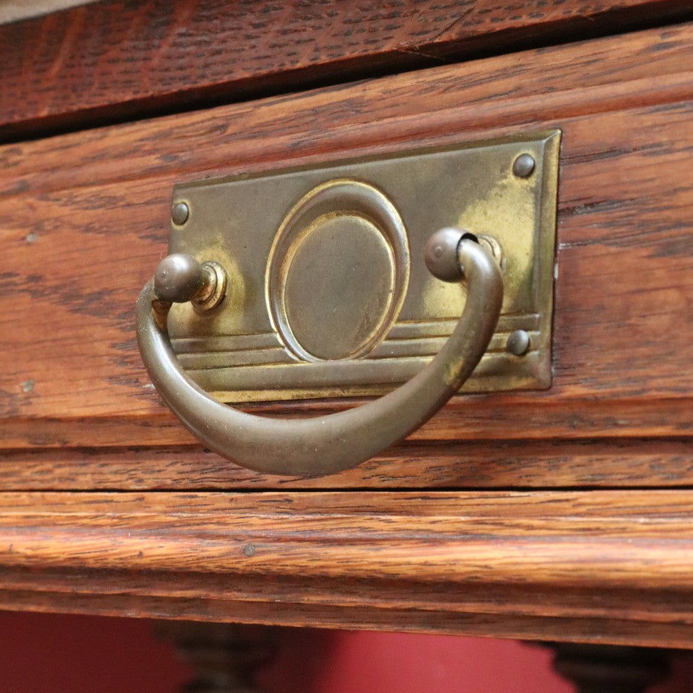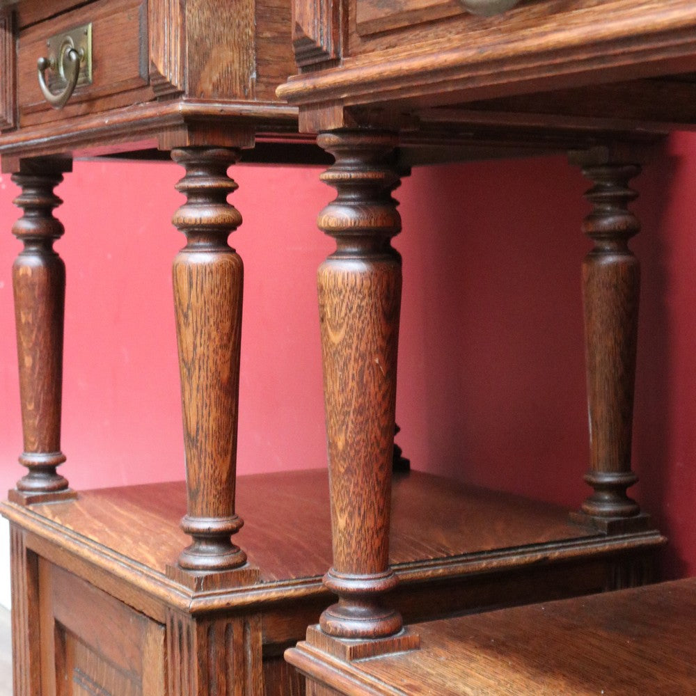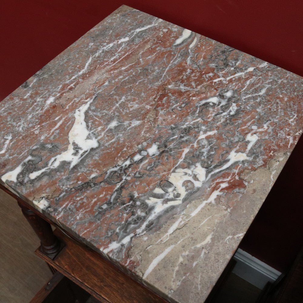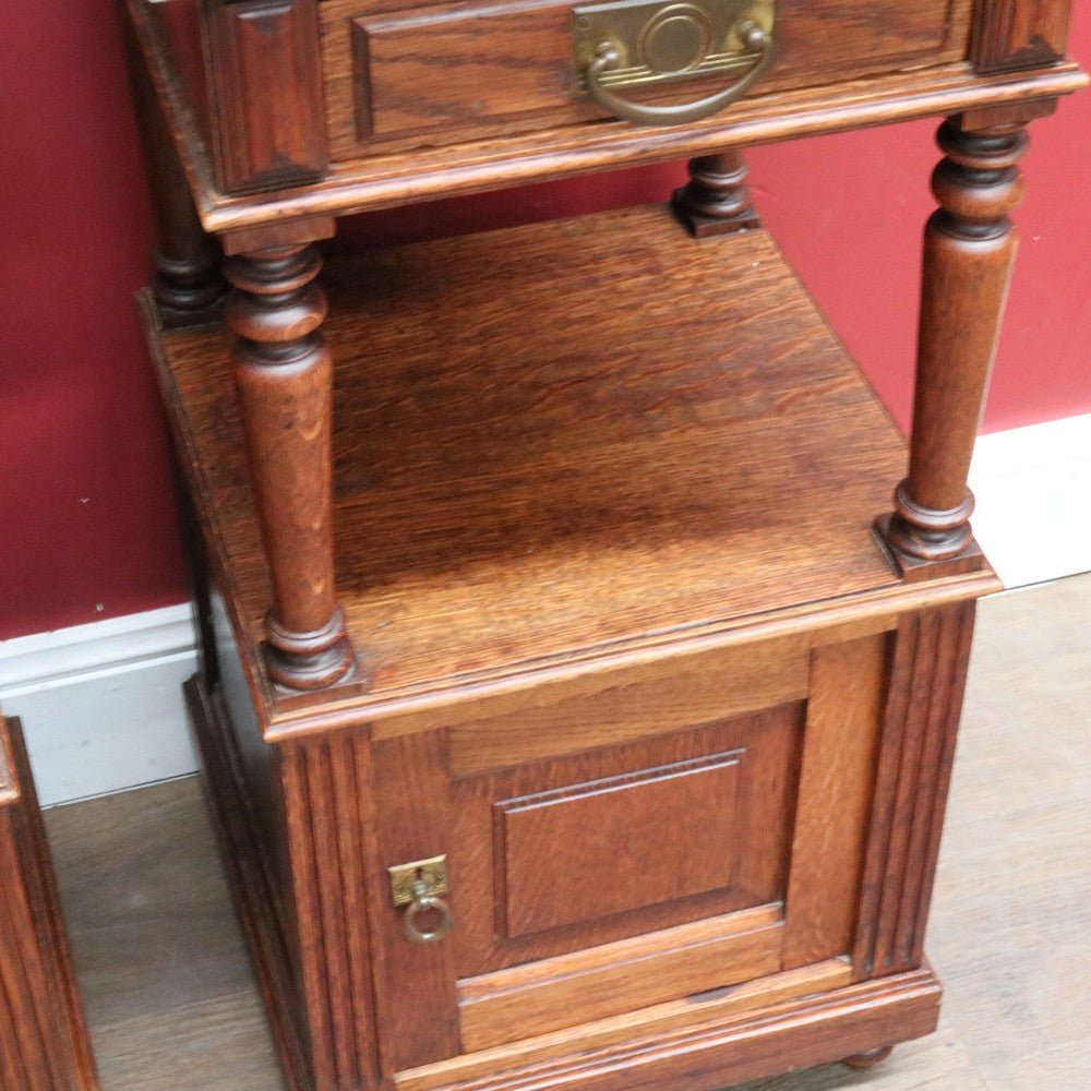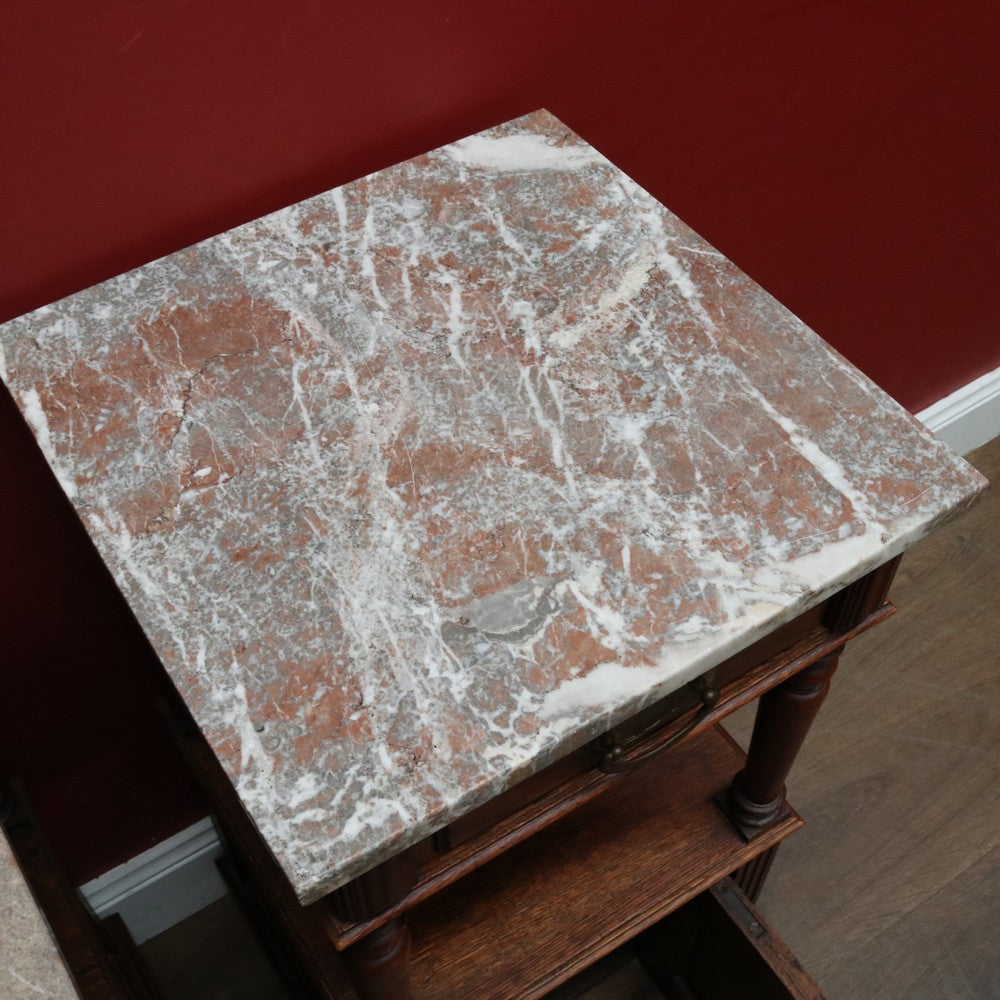 Description: A true pair of French oak bedside cabinets, each with a marble top, brass pull handles and elegant turned tapered supports to the open display area. Below the drawer sits a display shelf, and beneath that a cupboard offering practical storage.