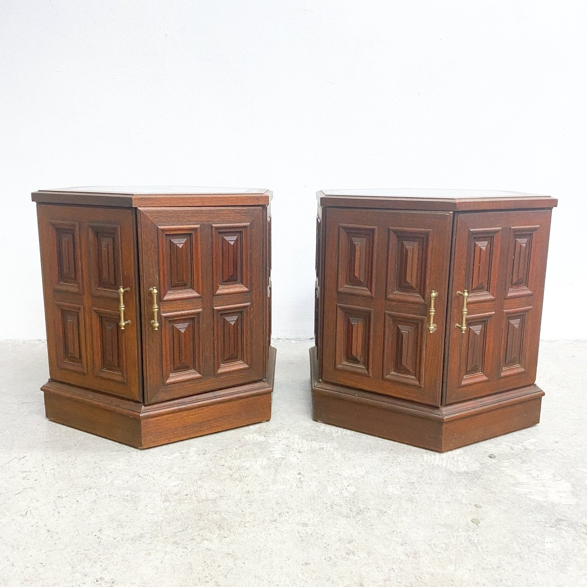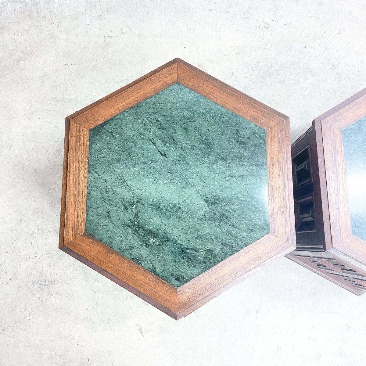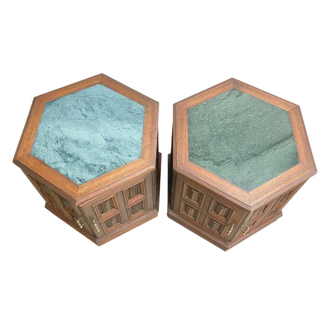 Pair of mid century solid teak bedside tables, with gorgeous green marble tops, hexagon shape with double doors.