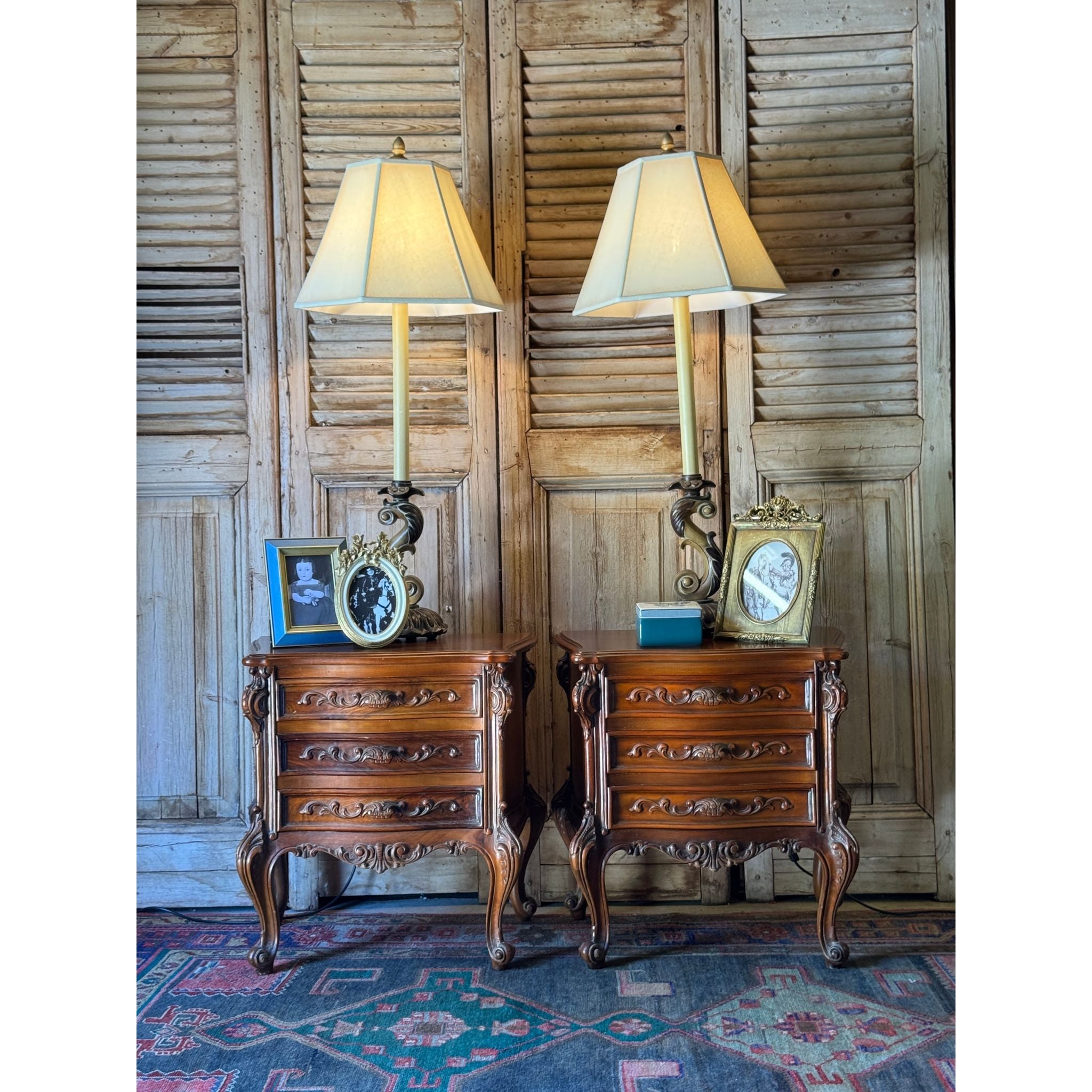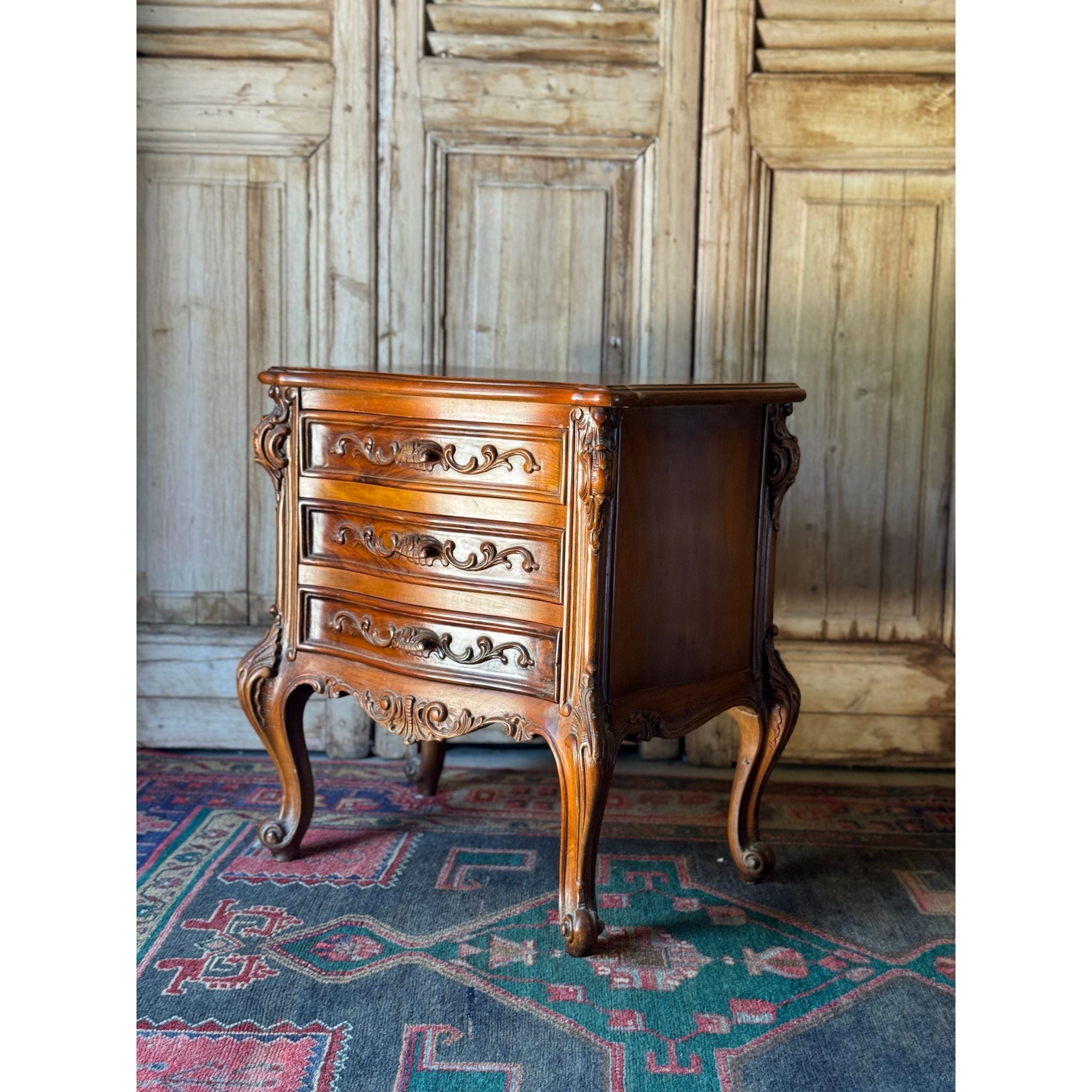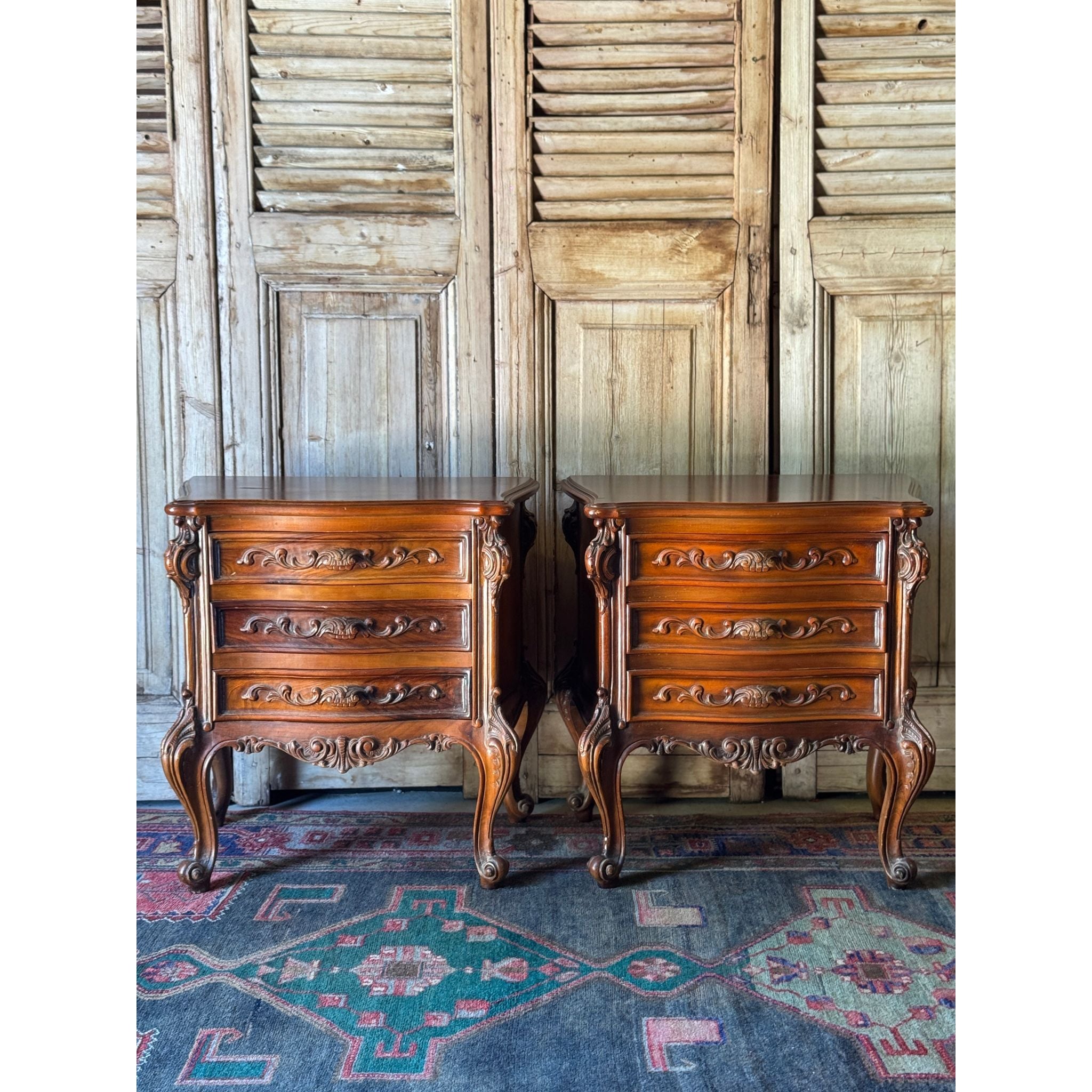 A beautifully matched pair of vintage bedside tables featuring elegant carved detailing throughout, softly shaped fronts and classic cabriole legs. Each piece offers three drawers with flowing carved fronts. The proportions are generous without being bulky, making them ideal as bedsides, lamp tables or small chests in a guest room or sitting room. They sit comfortably in both traditional interiors and more layered, eclectic spaces. Signs of wear as expected - refer photos. Price is for the pair.
