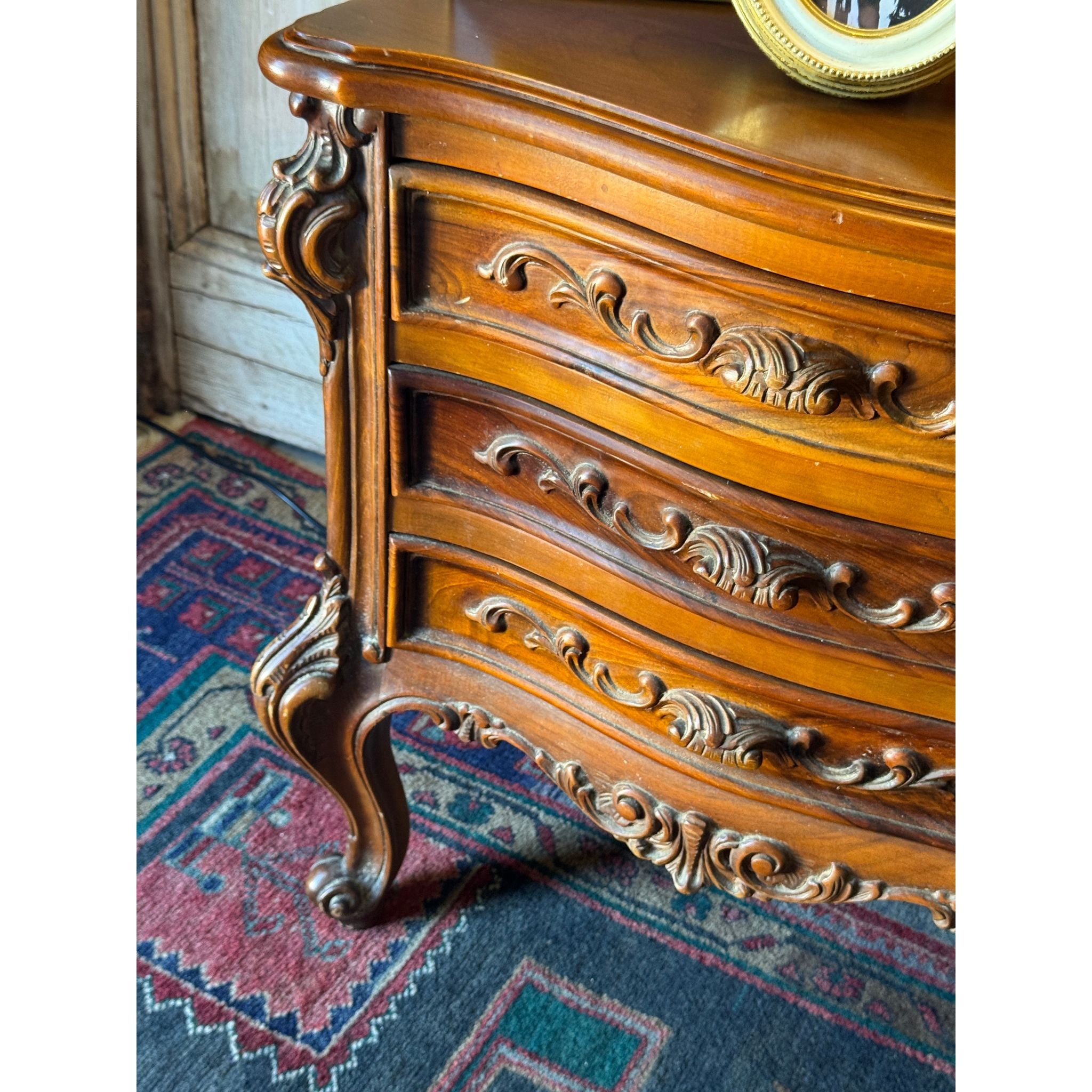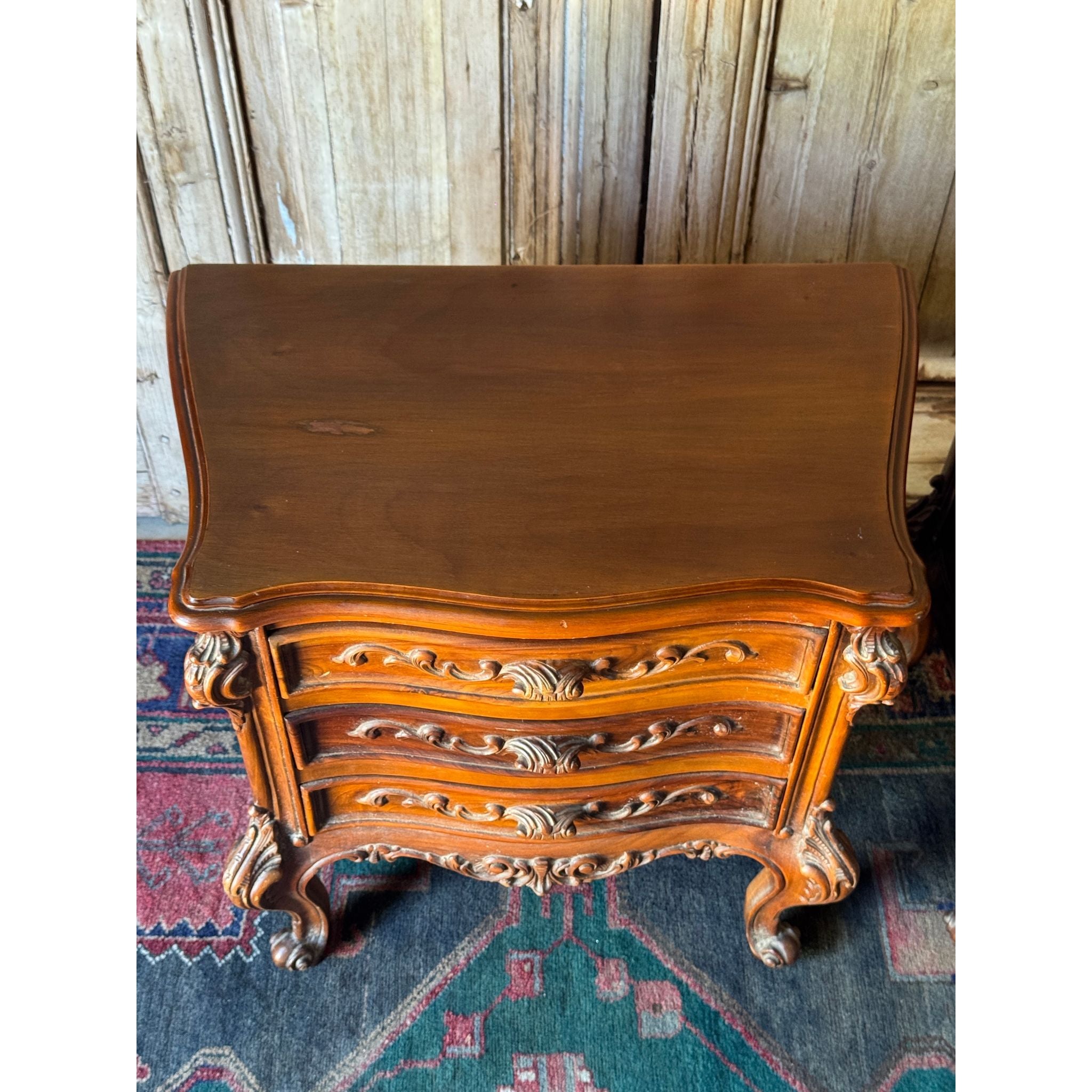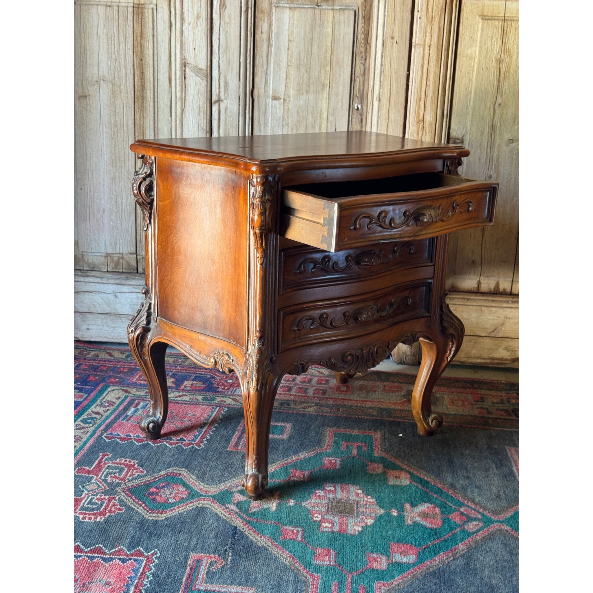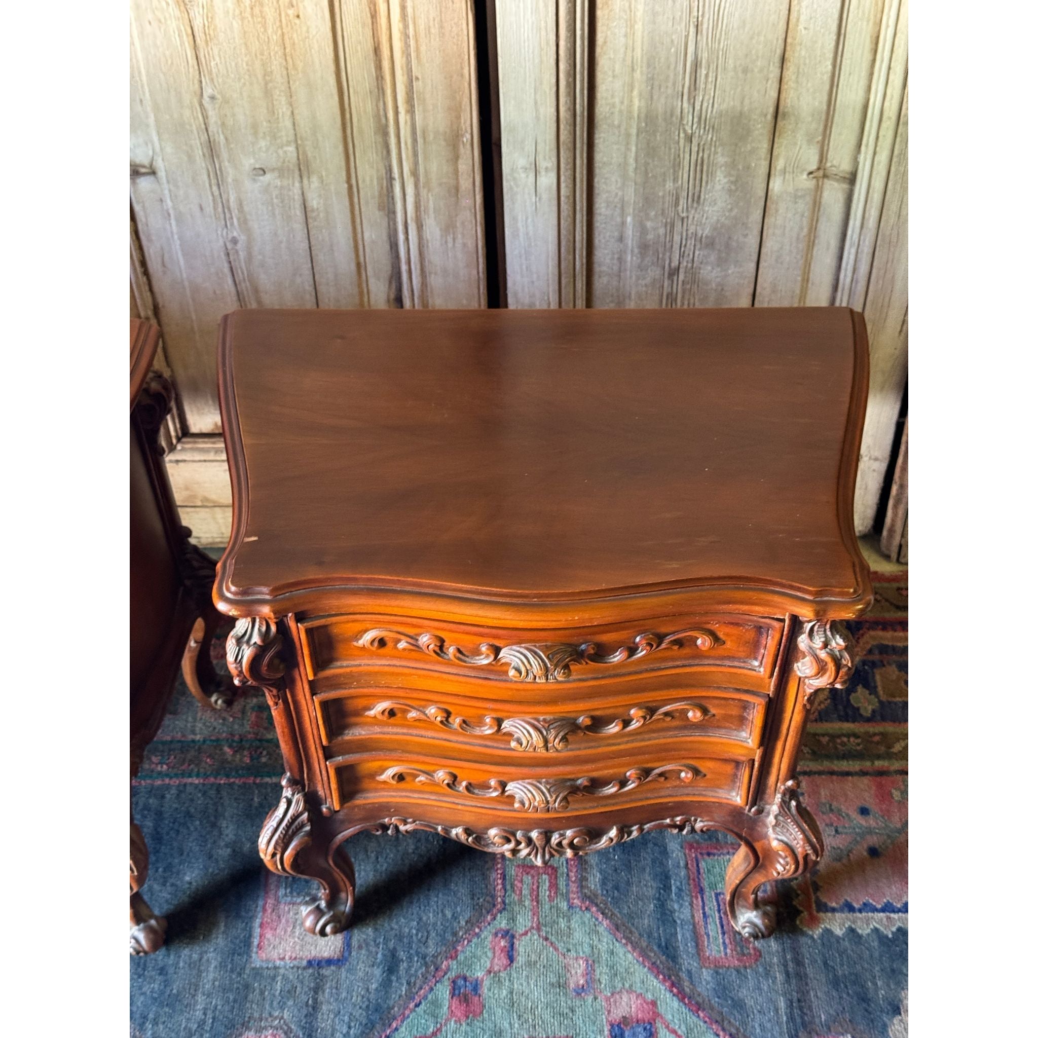 A beautifully matched pair of vintage bedside tables featuring elegant carved detailing throughout, softly shaped fronts and classic cabriole legs. Each piece offers three drawers with flowing carved fronts. The proportions are generous without being bulky, making them ideal as bedsides, lamp tables or small chests in a guest room or sitting room. They sit comfortably in both traditional interiors and more layered, eclectic spaces. Signs of wear as expected - refer photos. Price is for the pair.