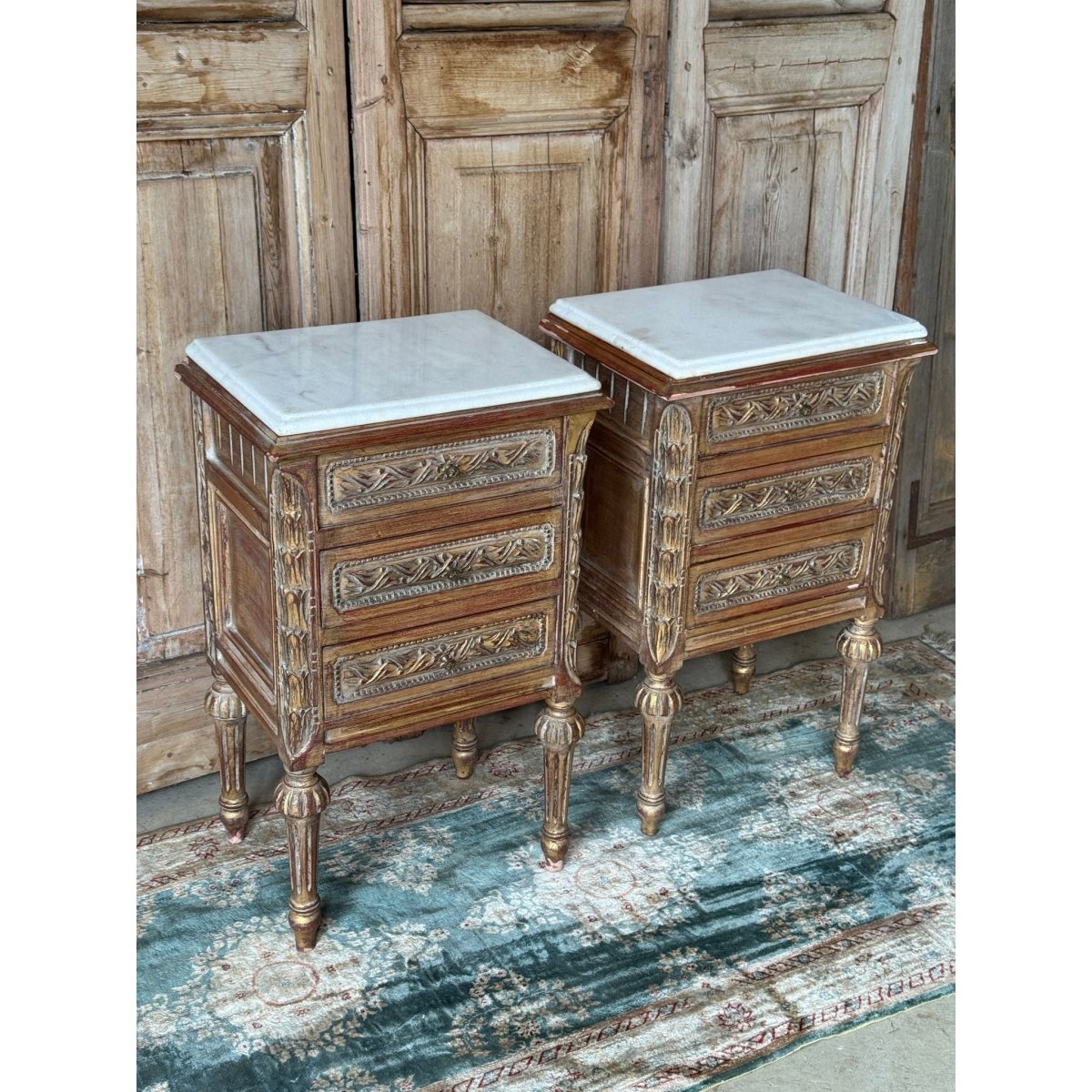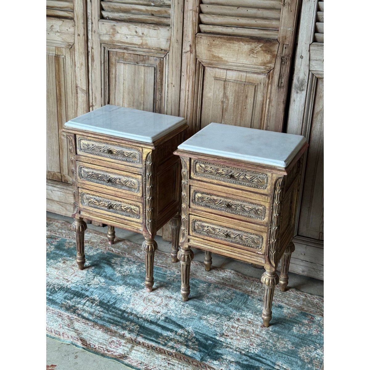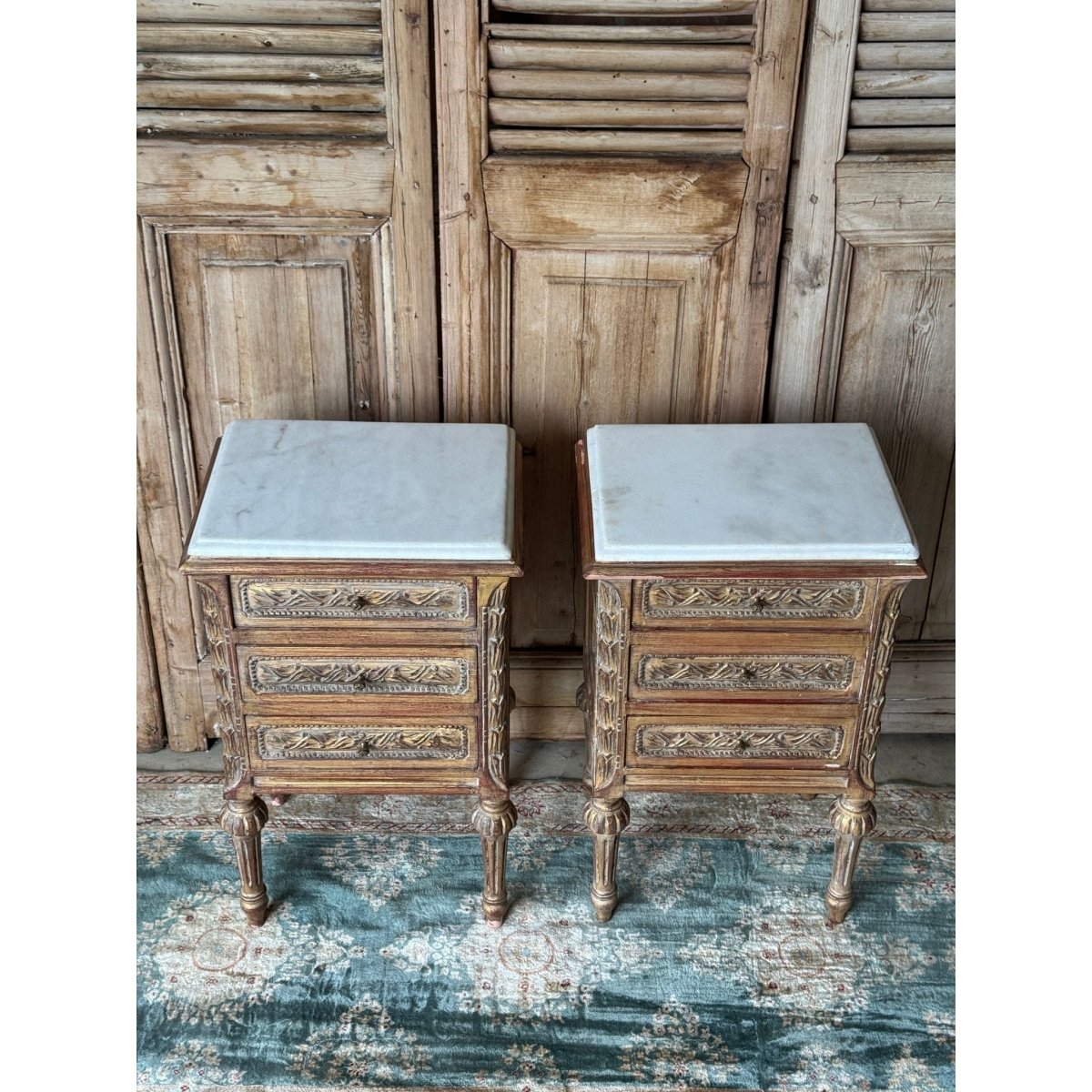 A lovely pair of vintage French Louis XVI style gold leaf three drawer side table with a white marble top. Minor scuff marks consistent with age. Price is for the pair.