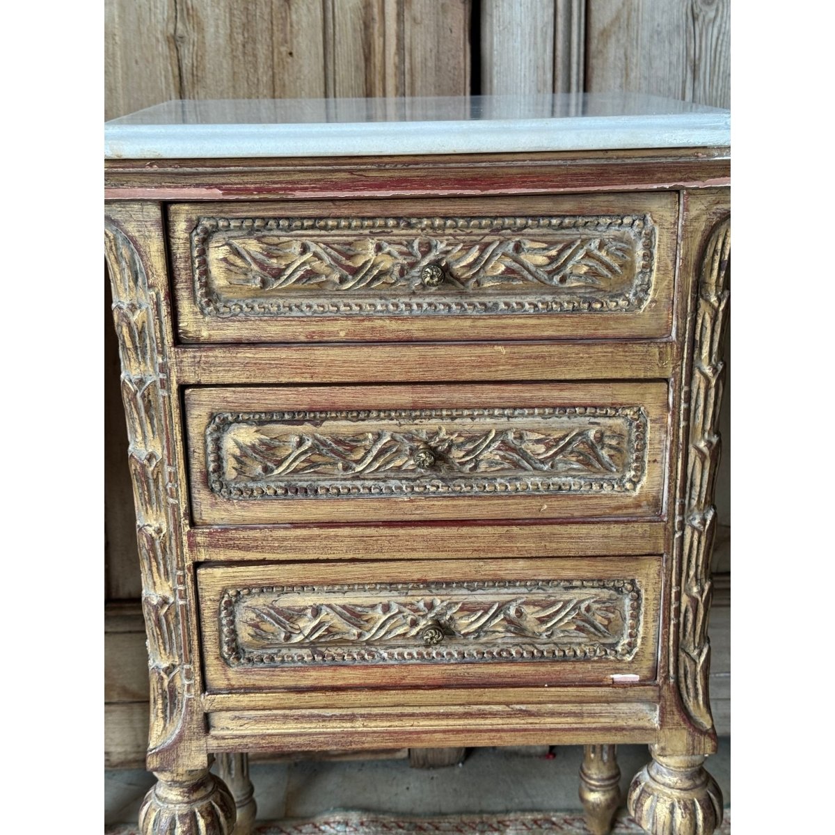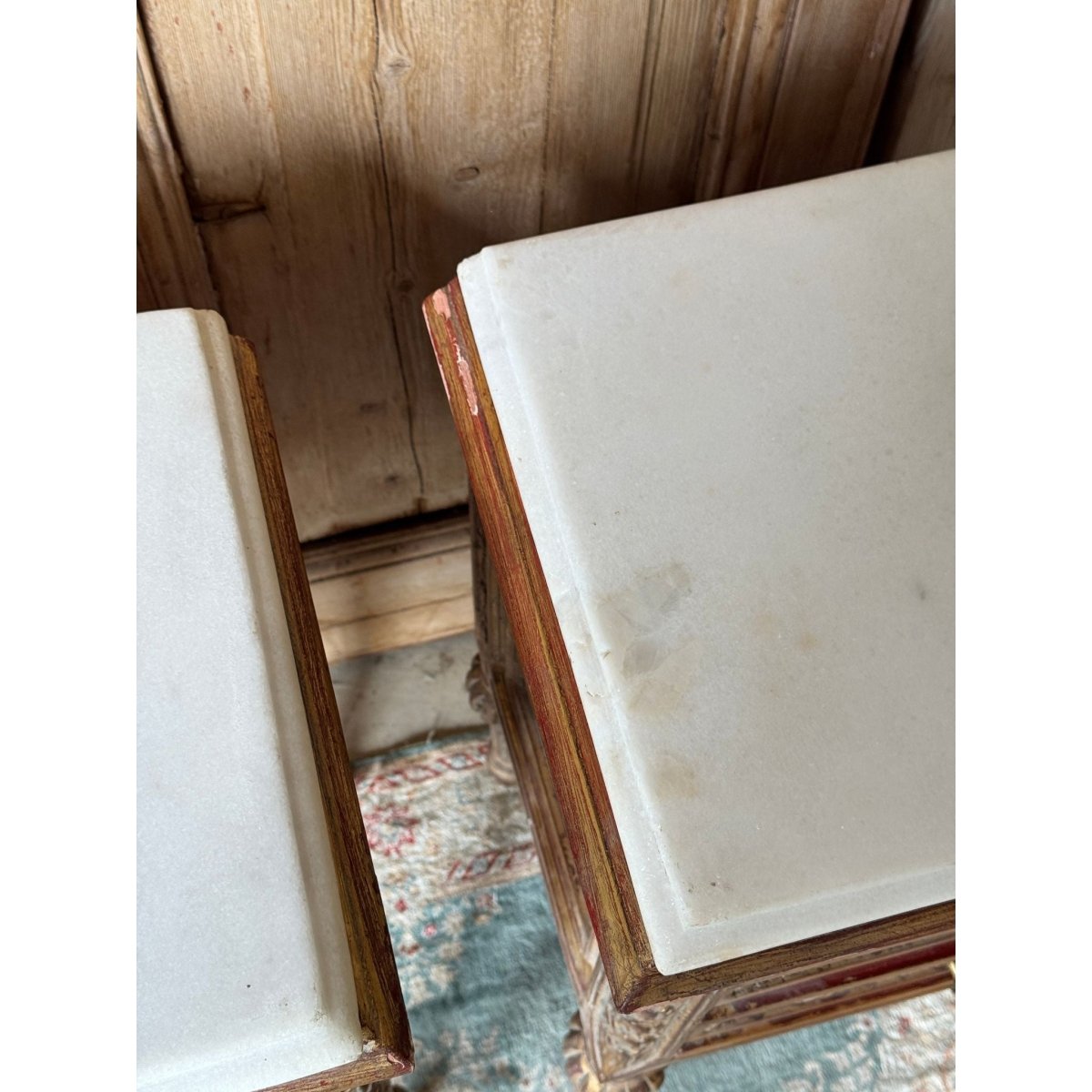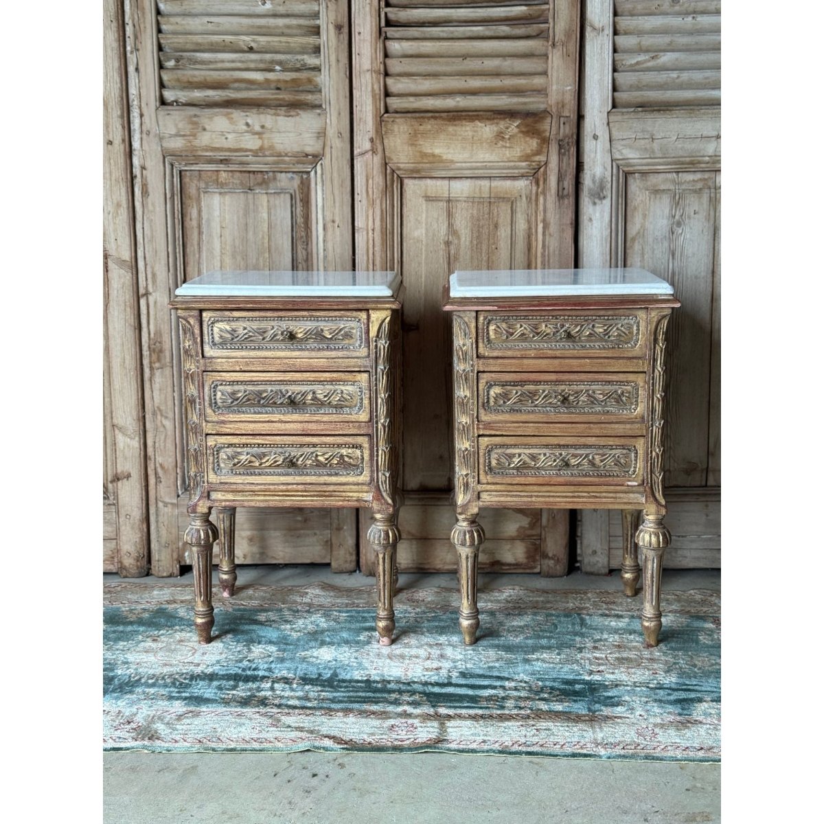A lovely pair of vintage French Louis XVI style gold leaf three drawer side table with a white marble top. Minor scuff marks consistent with age. Price is for the pair.