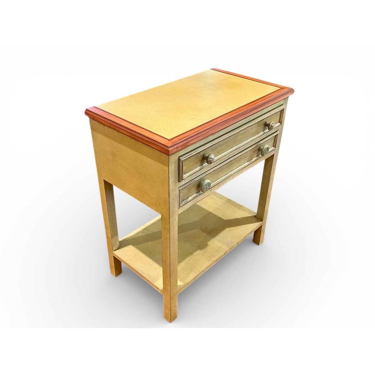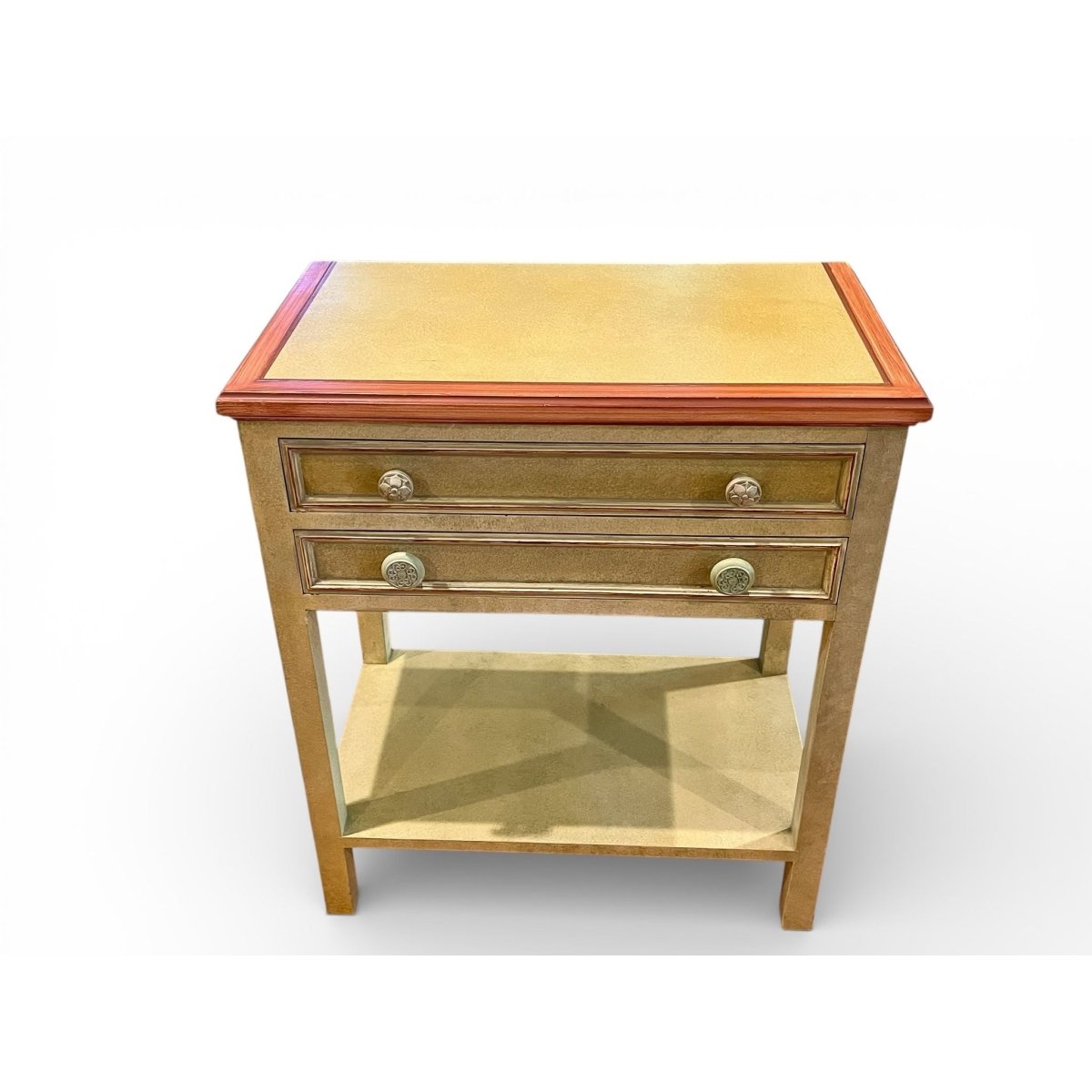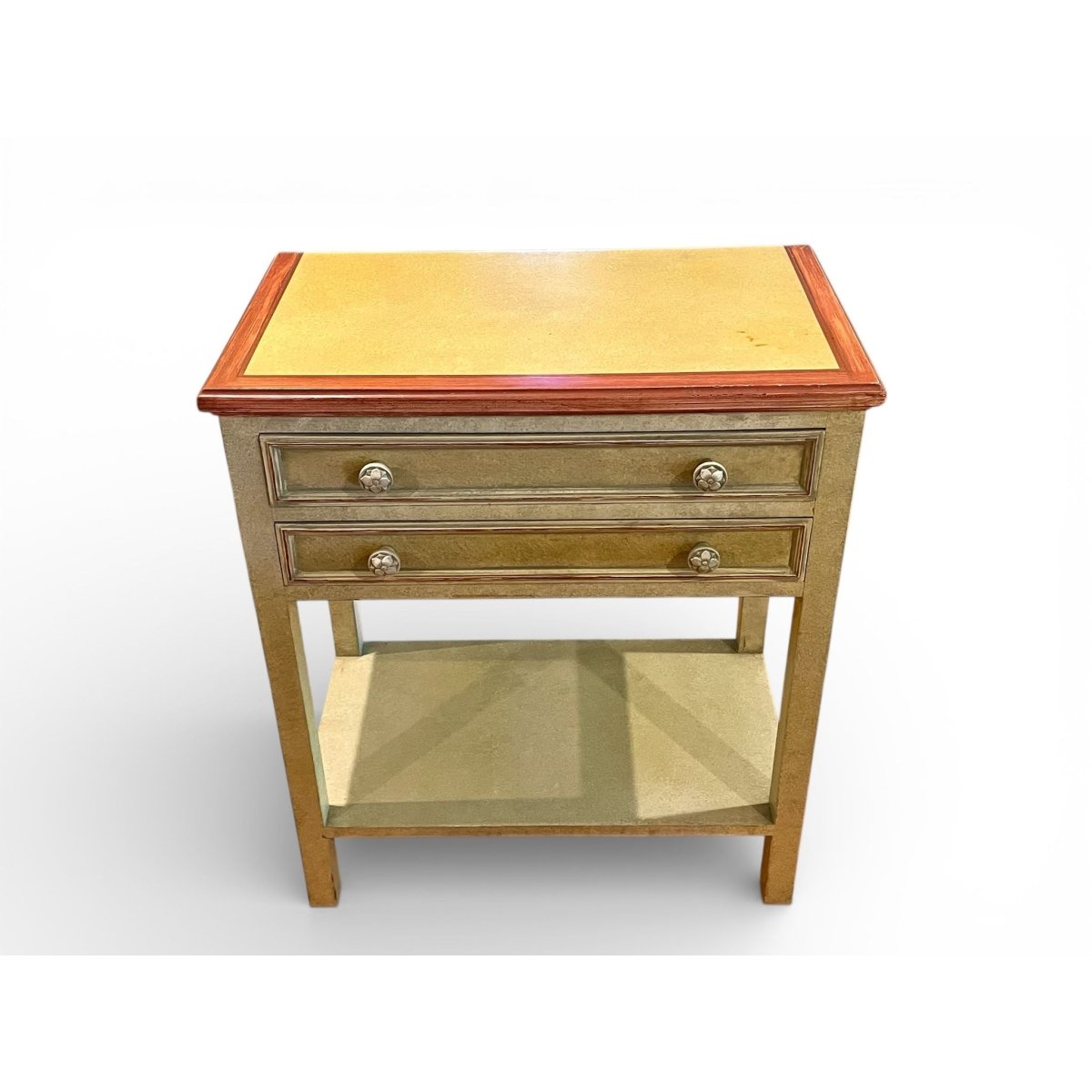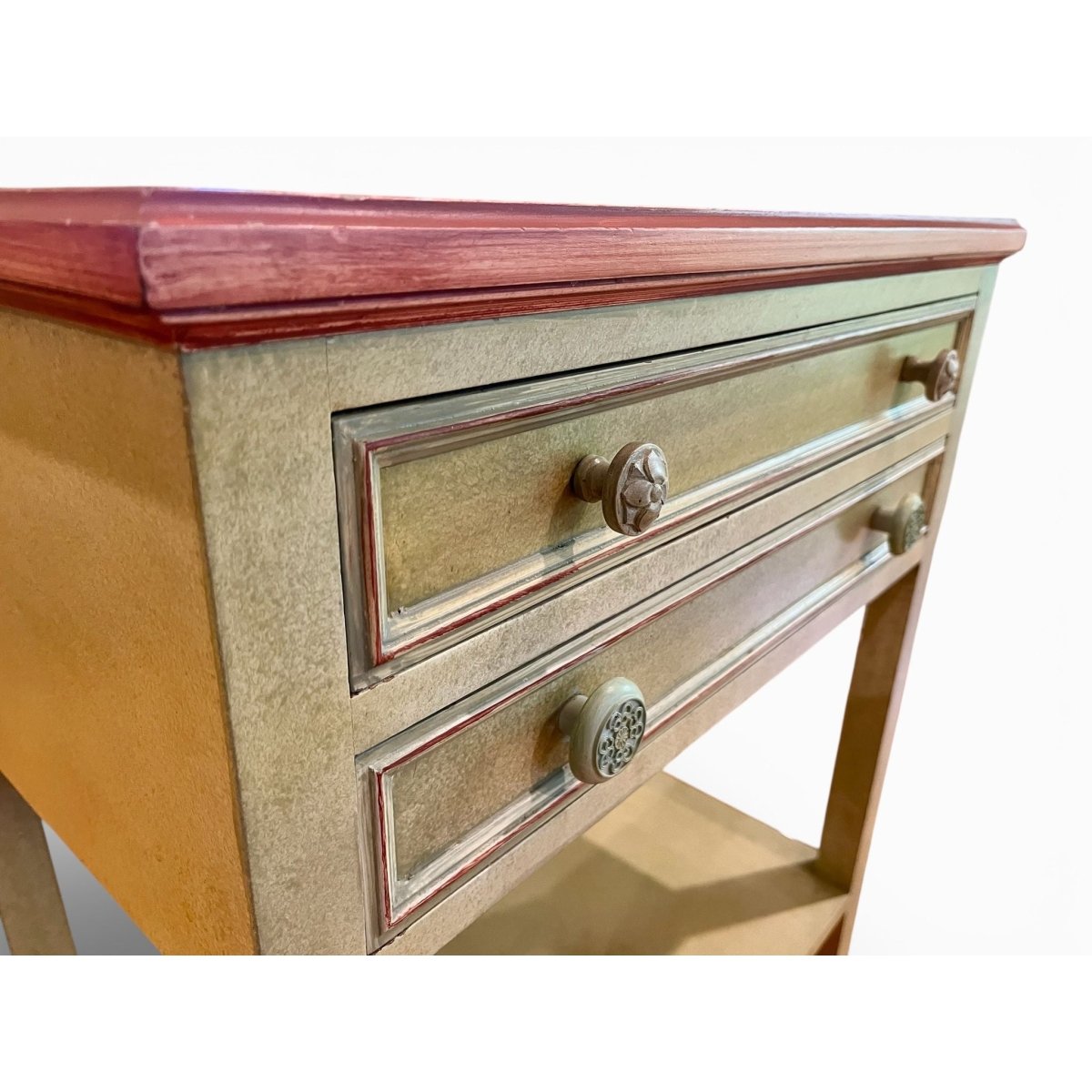 Vintage "DECRO PTY LTD" green painted side tables with drawers X2 pair 1990's AUSTRALIA. Wood. Green with brown accents. 2 two upper full width drawers. Decorative wood handles. Bevelled edges. Lower storage shelf. Rectangular with straight legs. Freestanding. Painted finish. French Provincial, French Country style. Made in North Coburg, Victoria, Australia in 1990's.