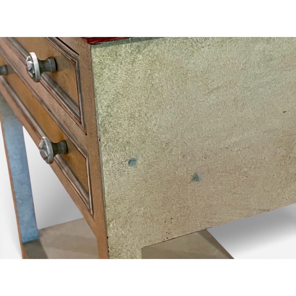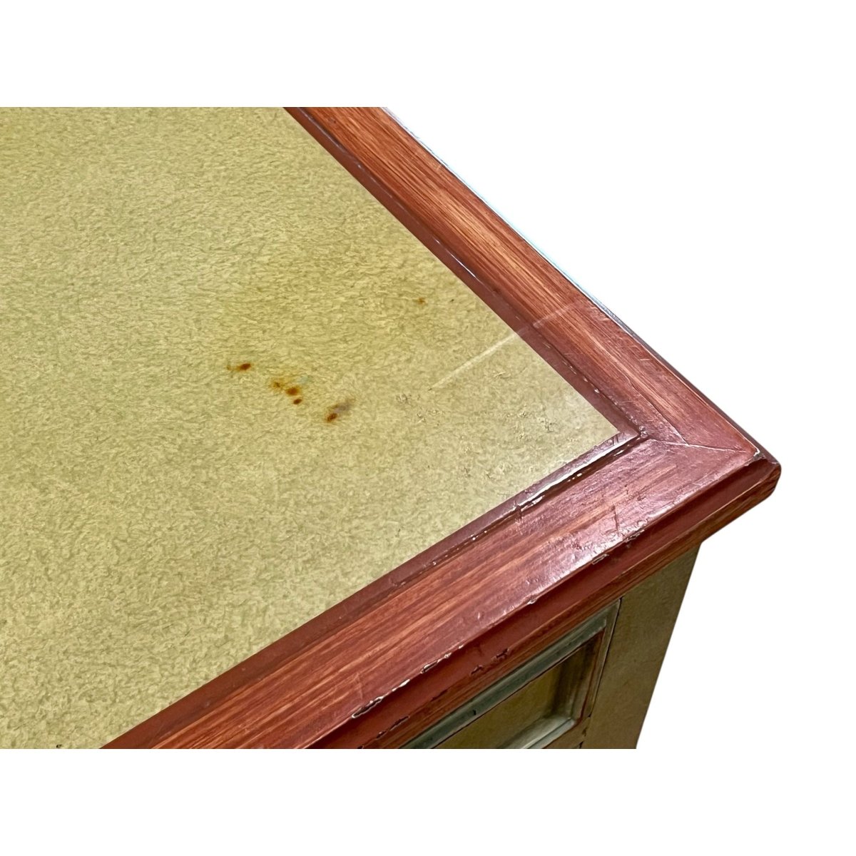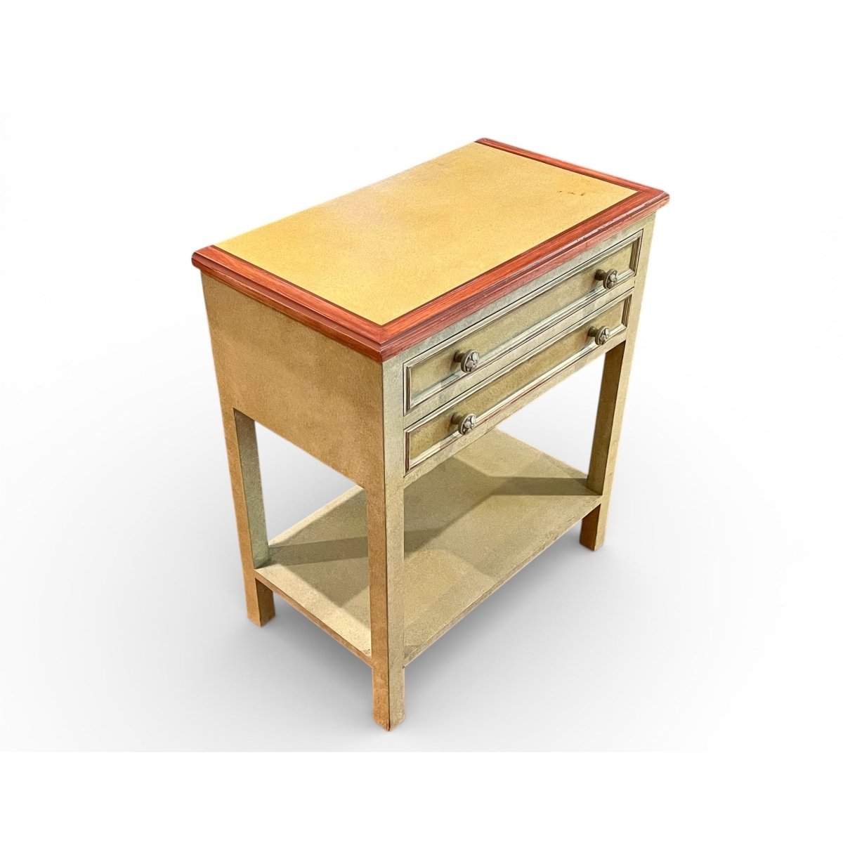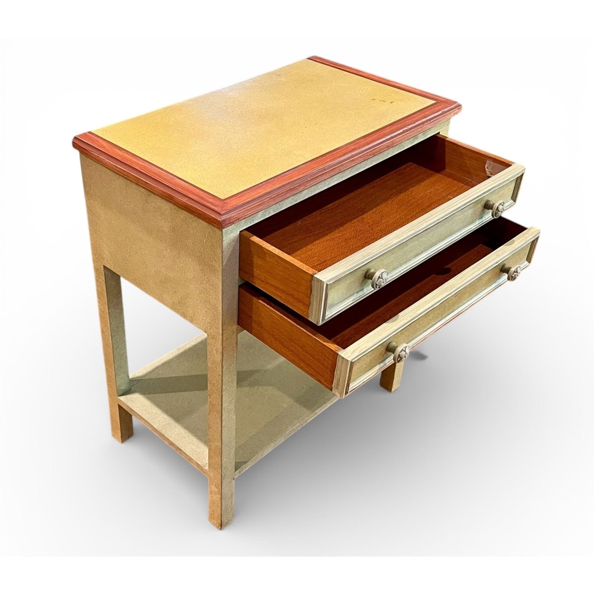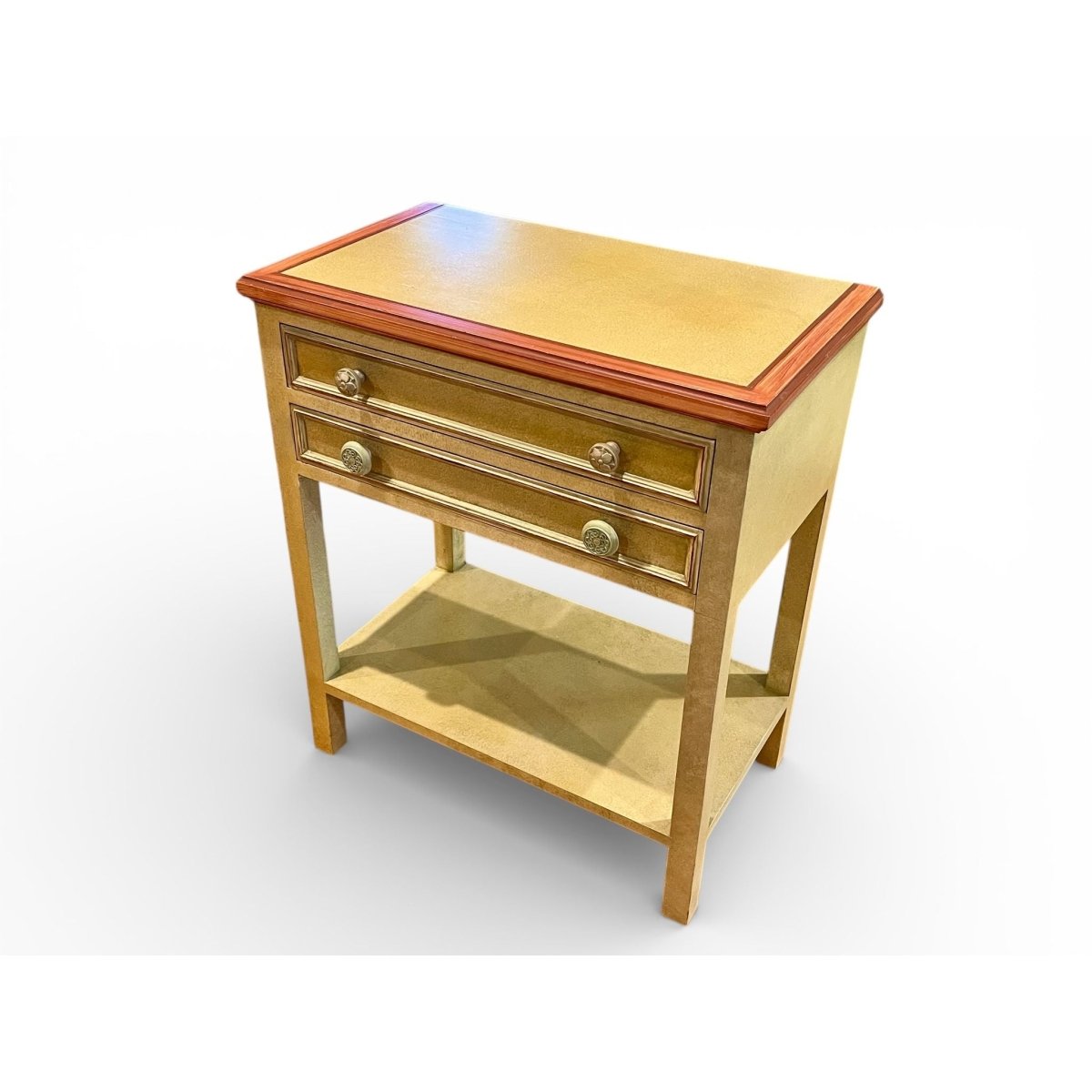 Vintage "DECRO PTY LTD" green painted side tables with drawers X2 pair 1990's AUSTRALIA. Wood. Green with brown accents. 2 two upper full width drawers. Decorative wood handles. Bevelled edges. Lower storage shelf. Rectangular with straight legs. Freestanding. Painted finish. French Provincial, French Country style. Made in North Coburg, Victoria, Australia in 1990's.
