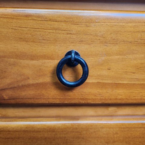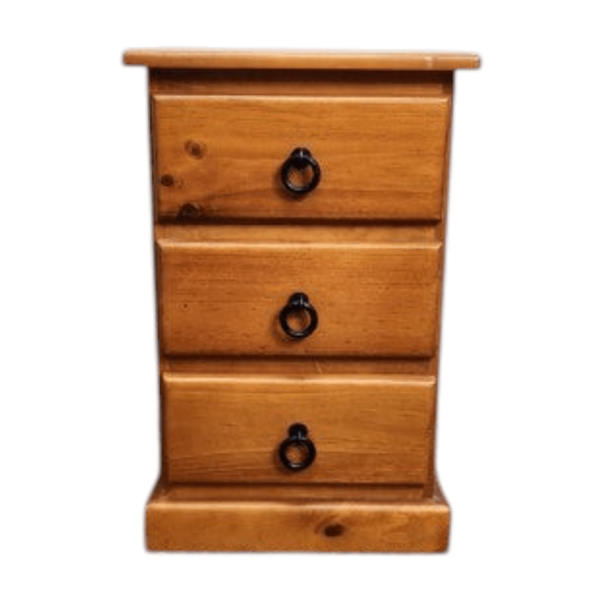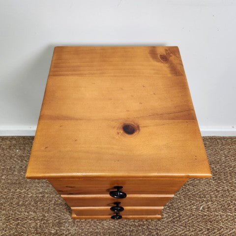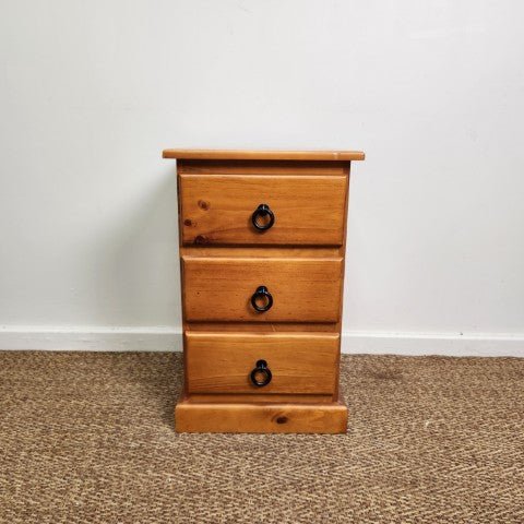 This vintage timber bedside features a simple three-drawer design with clean, classic lines. The natural timber finish highlights the grain and gives the piece a warm, understated character.