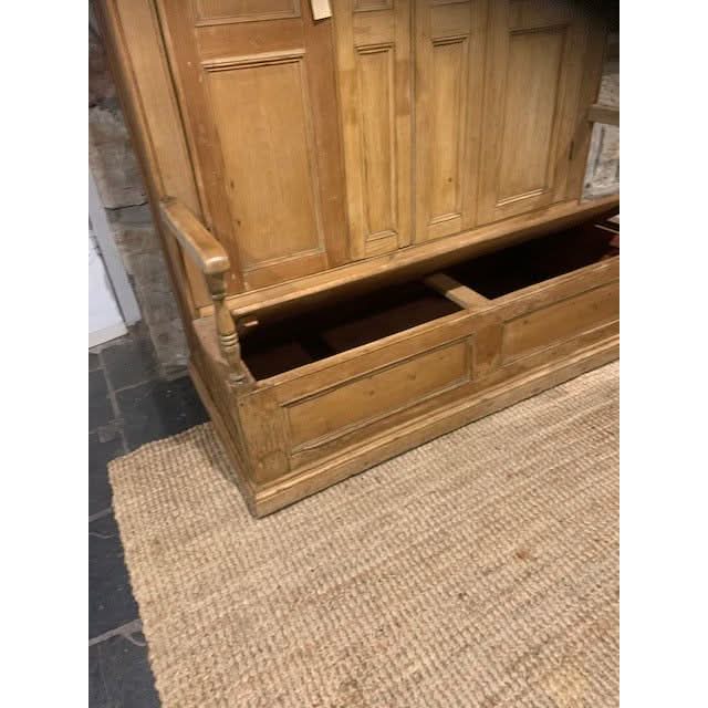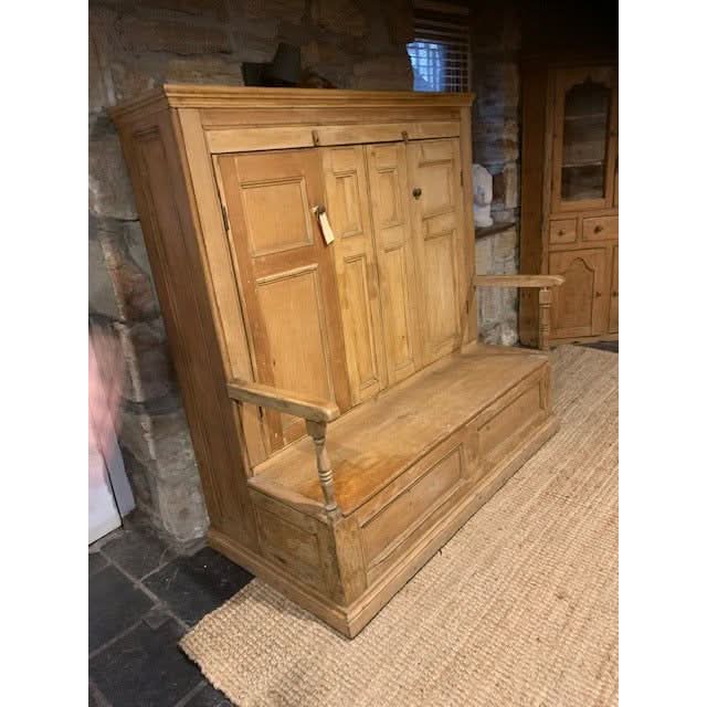A unique country house settle with Georgian fielded panelling to the doors, which when opened reveal wooden pegs for hanging cloaks etc. The seat opens up to large storage space,