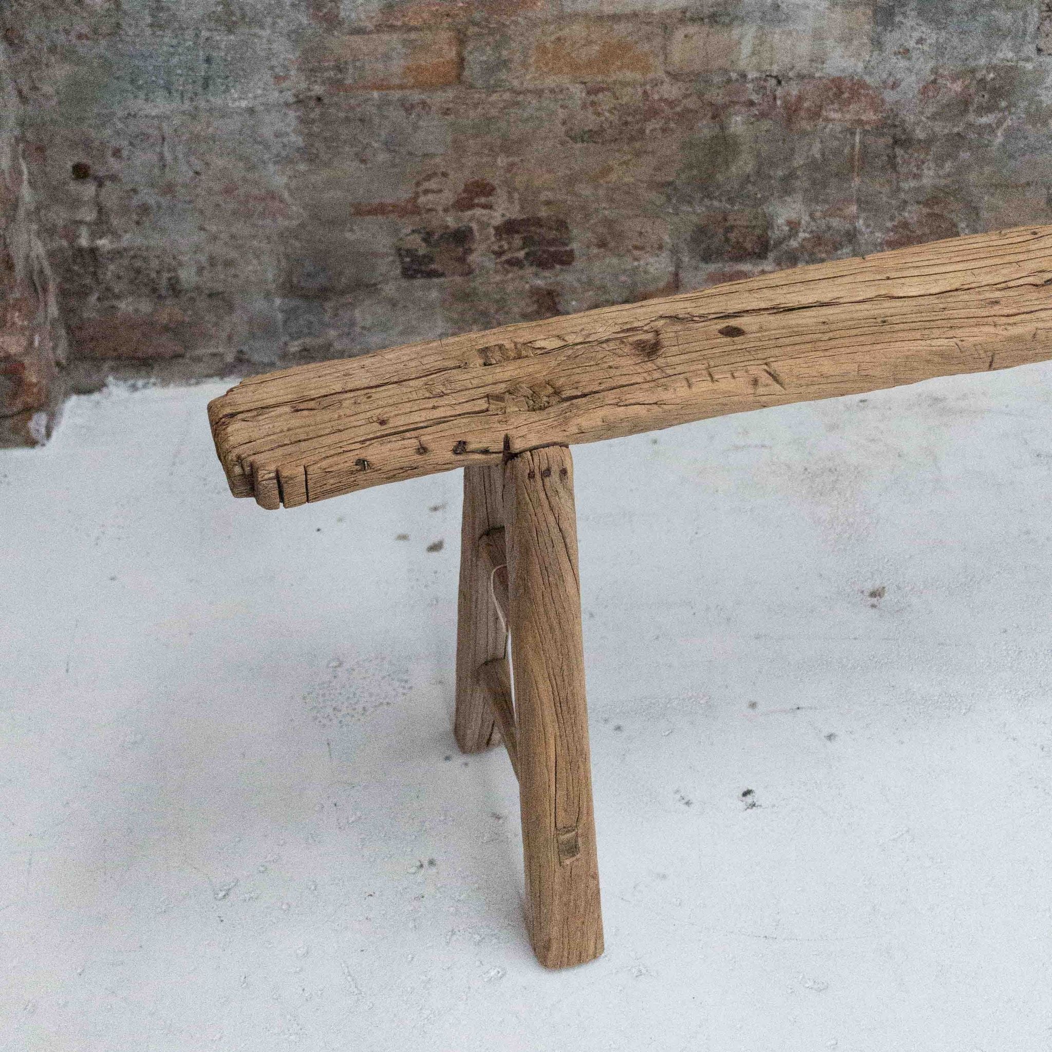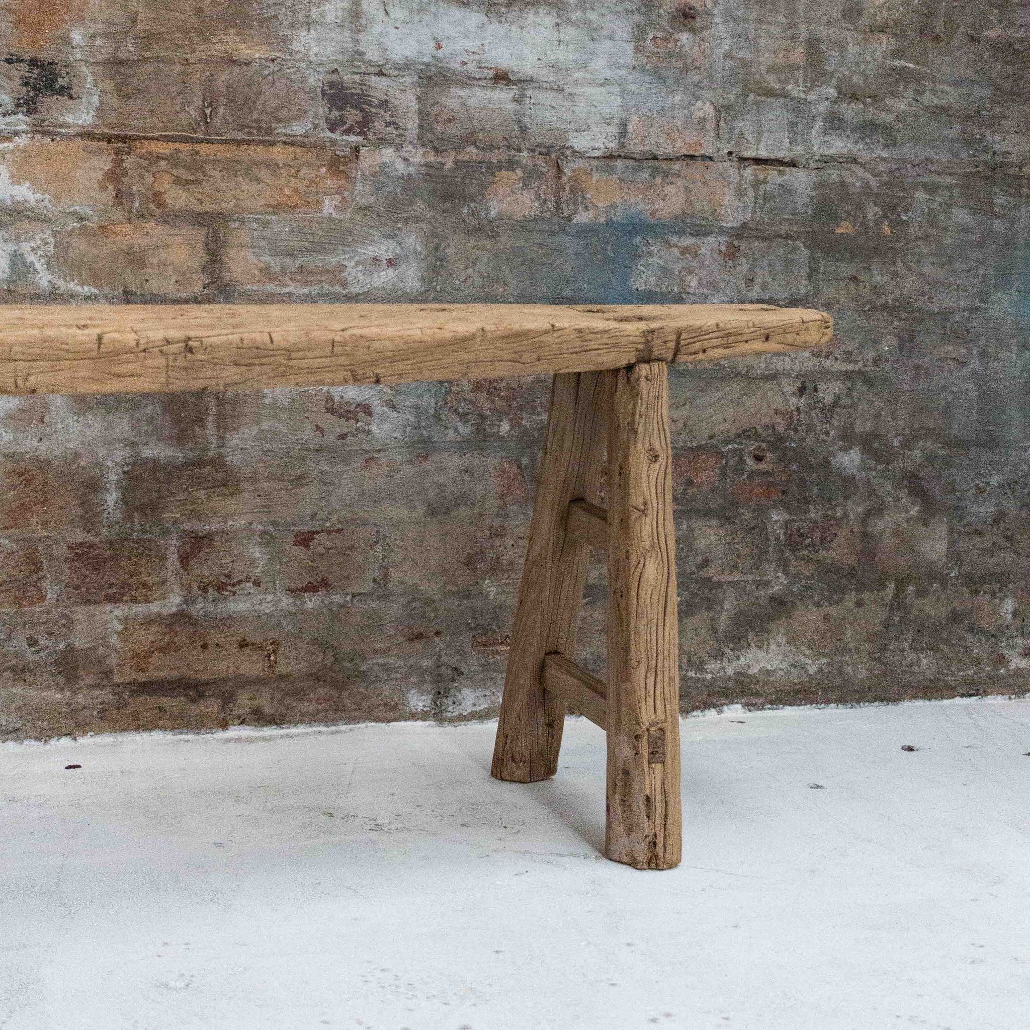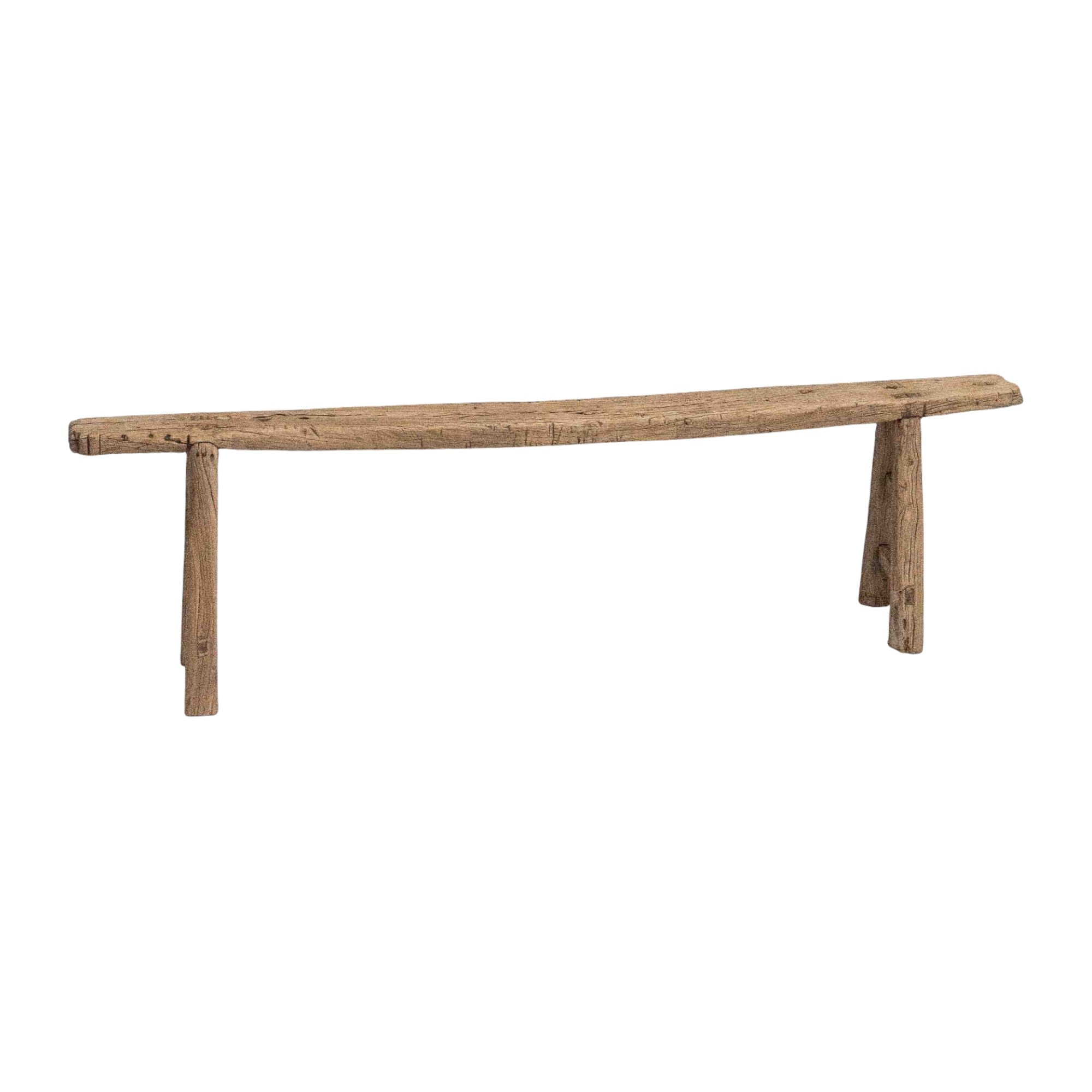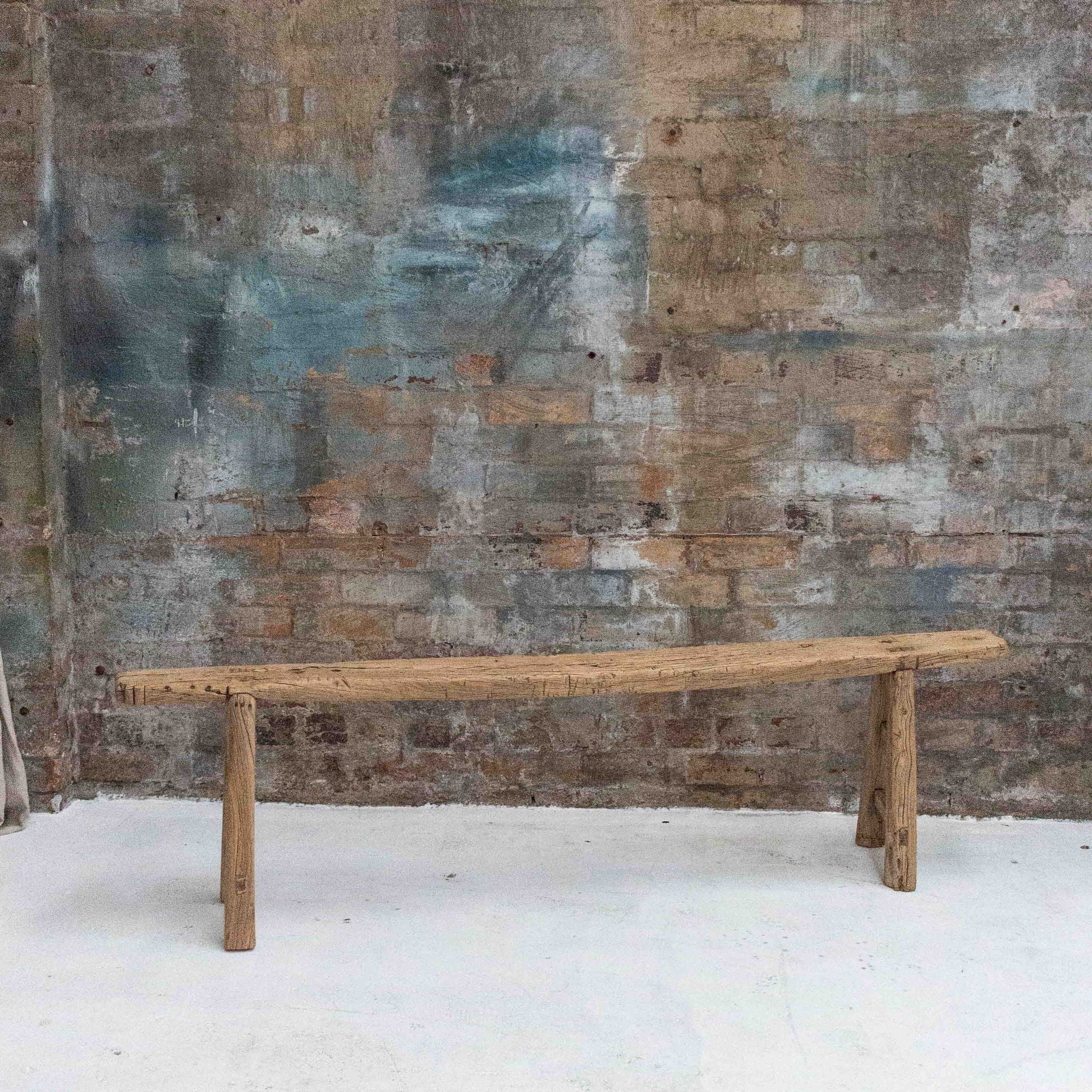 Every curve and grain tells a story, from the softly weathered top to the slightly uneven edges that speak to its handmade origins. The natural timber finish highlights the unique markings and textural richness of the elm, while the low profile and clean joinery offer strength and stability without distraction. The legs are sturdy and angled for balance, giving the bench a strong presence that still feels light and effortless.