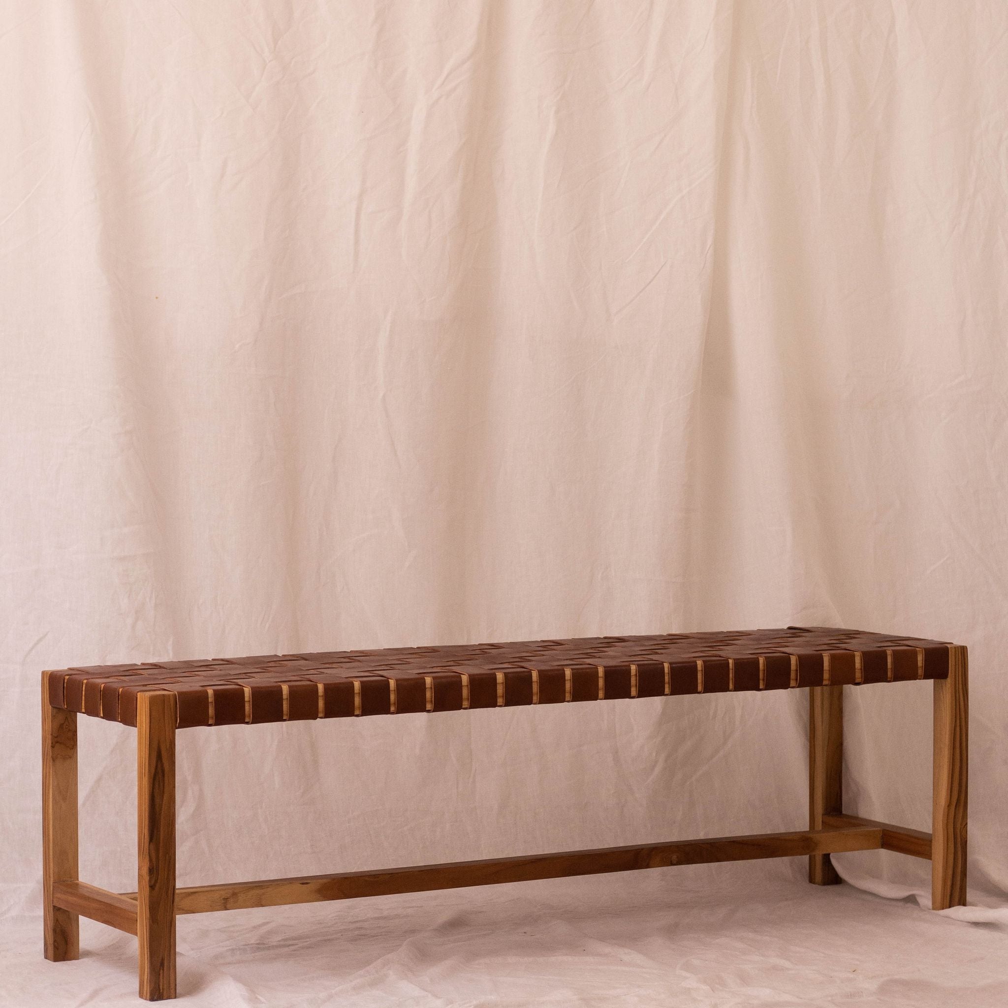 The Newport Leather Bench Seat in Tan brings together the warmth of natural materials with a refined and simple form. Featuring a hand woven leather top in a soft tan tone, this piece rests on a sturdy teak wood frame that offers lasting strength and timeless beauty.